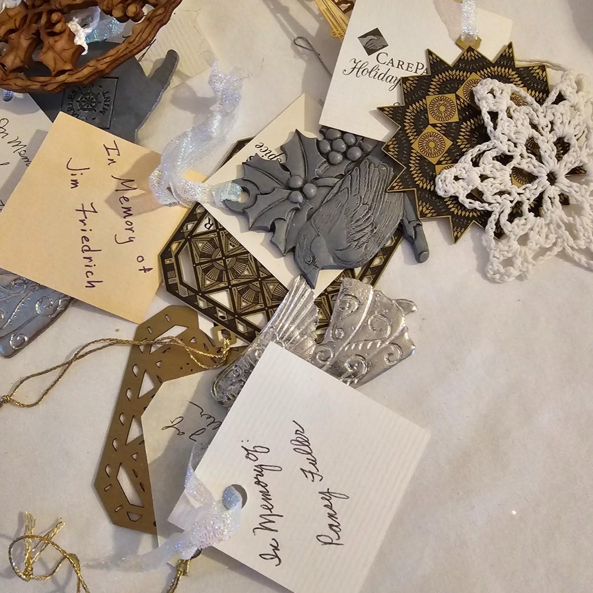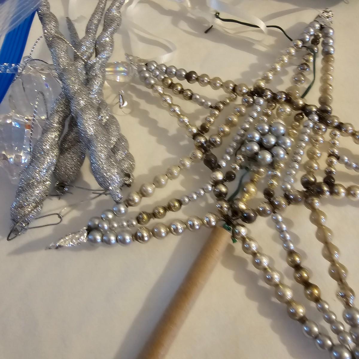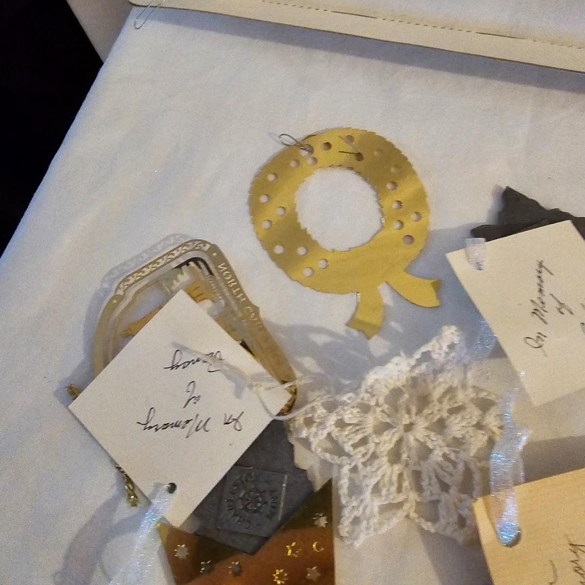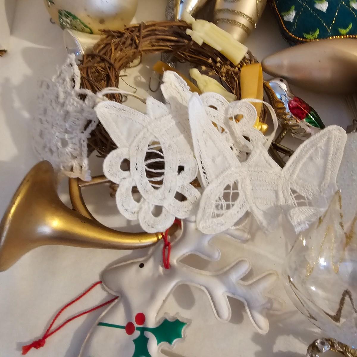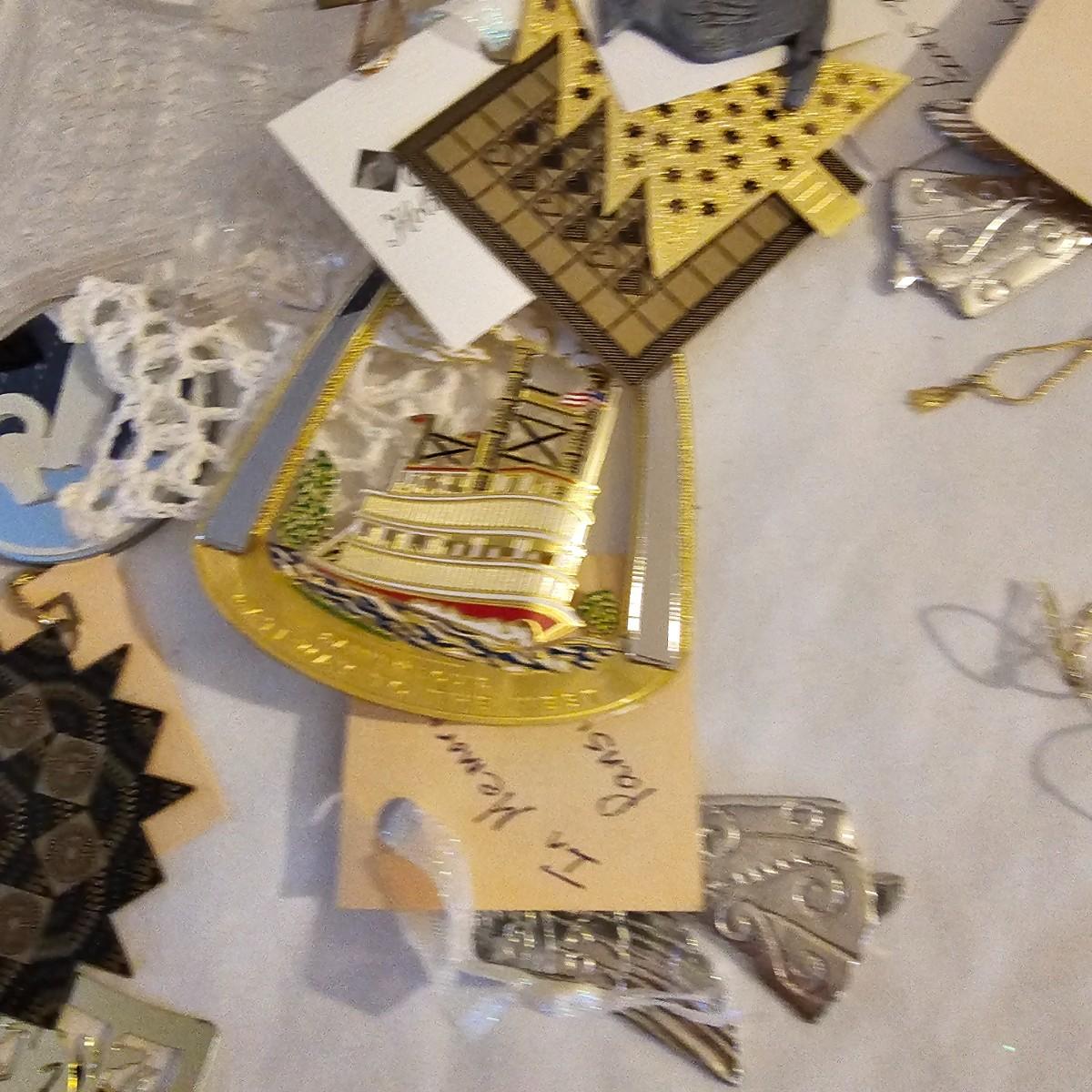 Many different kinds and styles of Christmas ornaments and decorations. Glass, plastic, brass, pewter, more. Round balls, birds, flat brass cutouts, clip ons. Color mostly gold and white but some variations. See photos for details. Shipping available.