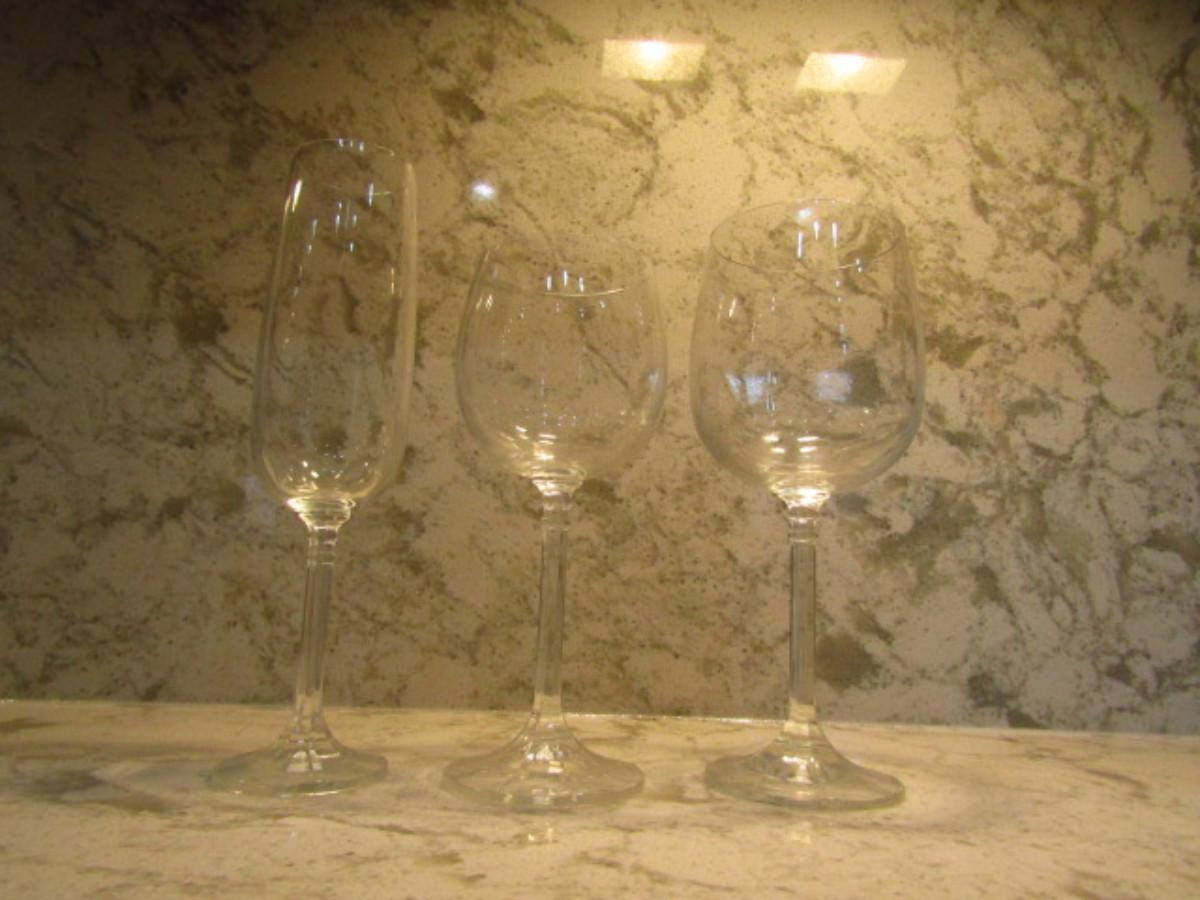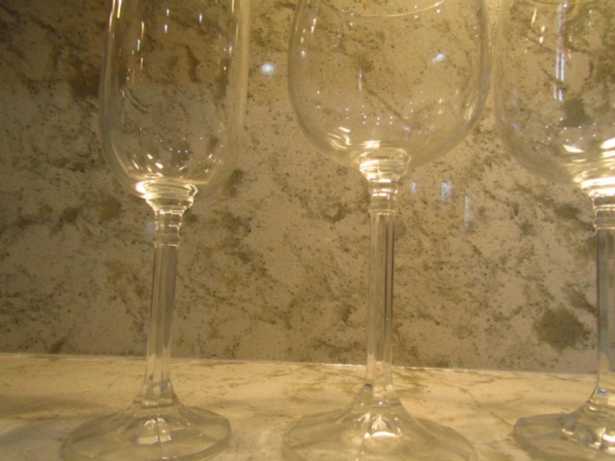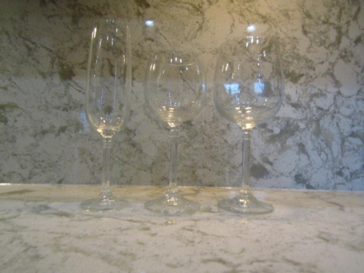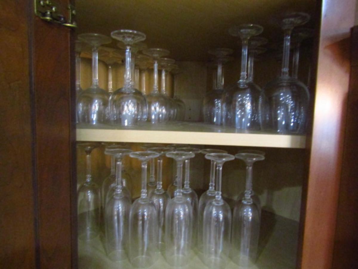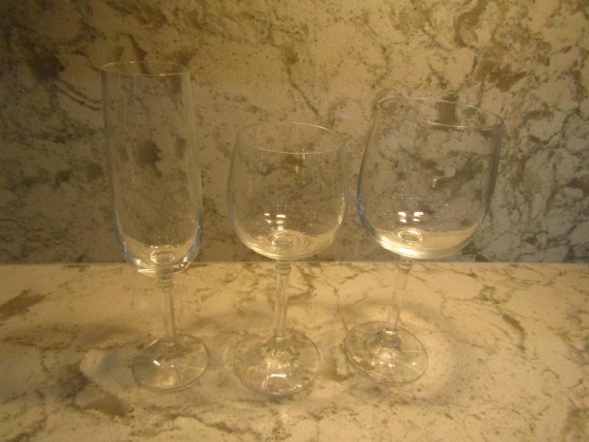 Assorted Clear Crystal Wine Glasses (Kitchen). No maker's mark found. Champagne glasses- 16 pcs. White wine glasses- 17 pcs. Red wine glasses- 15 pcs.