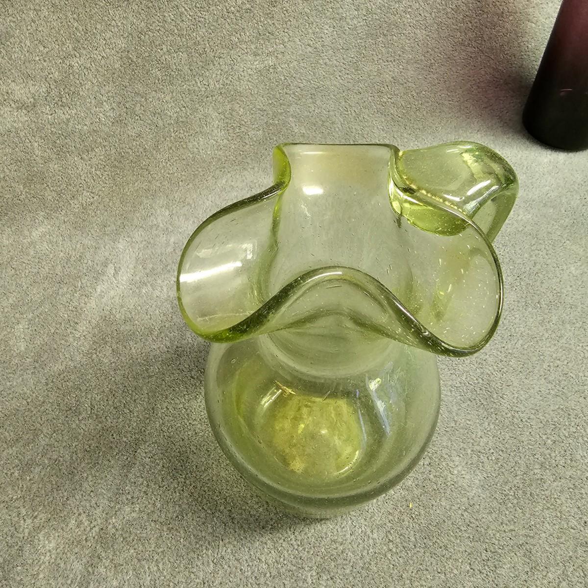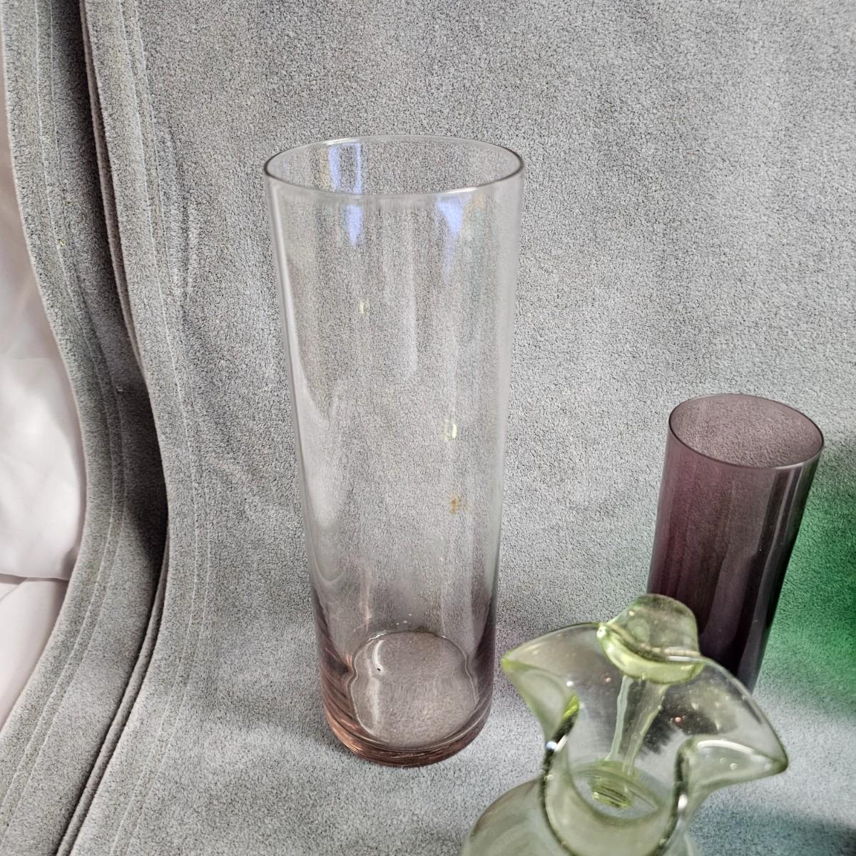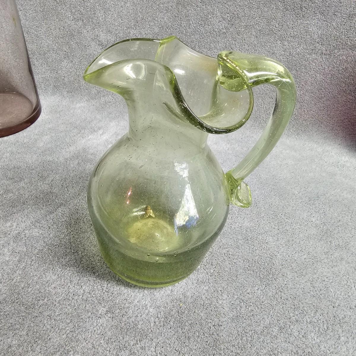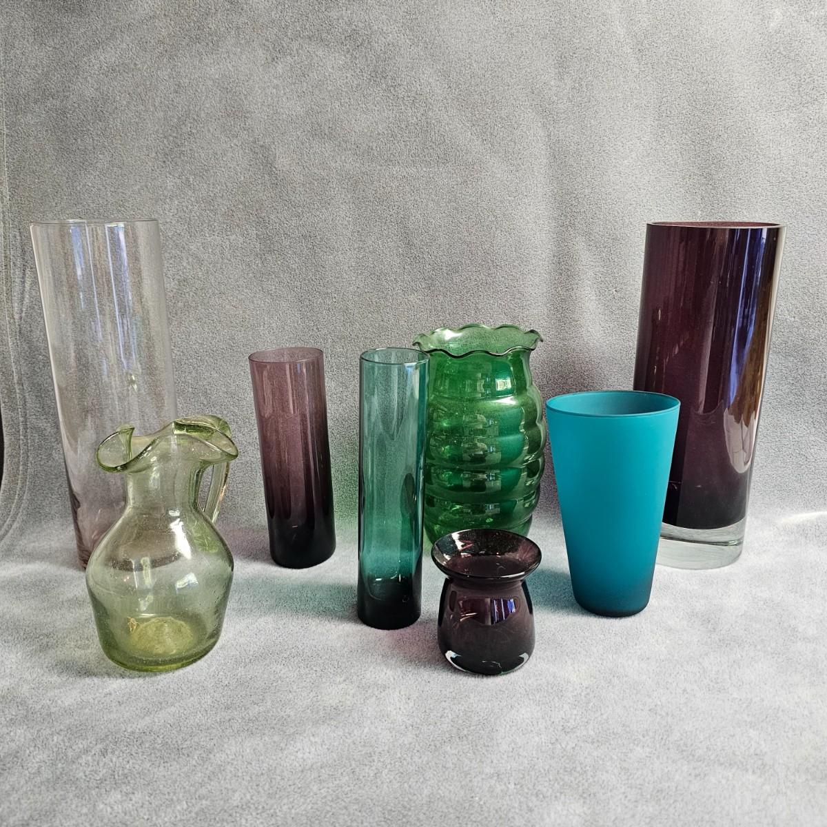Eight pieces of colorful glass vases, cup and small pitcher. Colors of amethyst, green and celery. Tallest piece is 4"D x 10"H, smallest is 2.5"D x 2.75"H. See photos for details. Shipping available.
