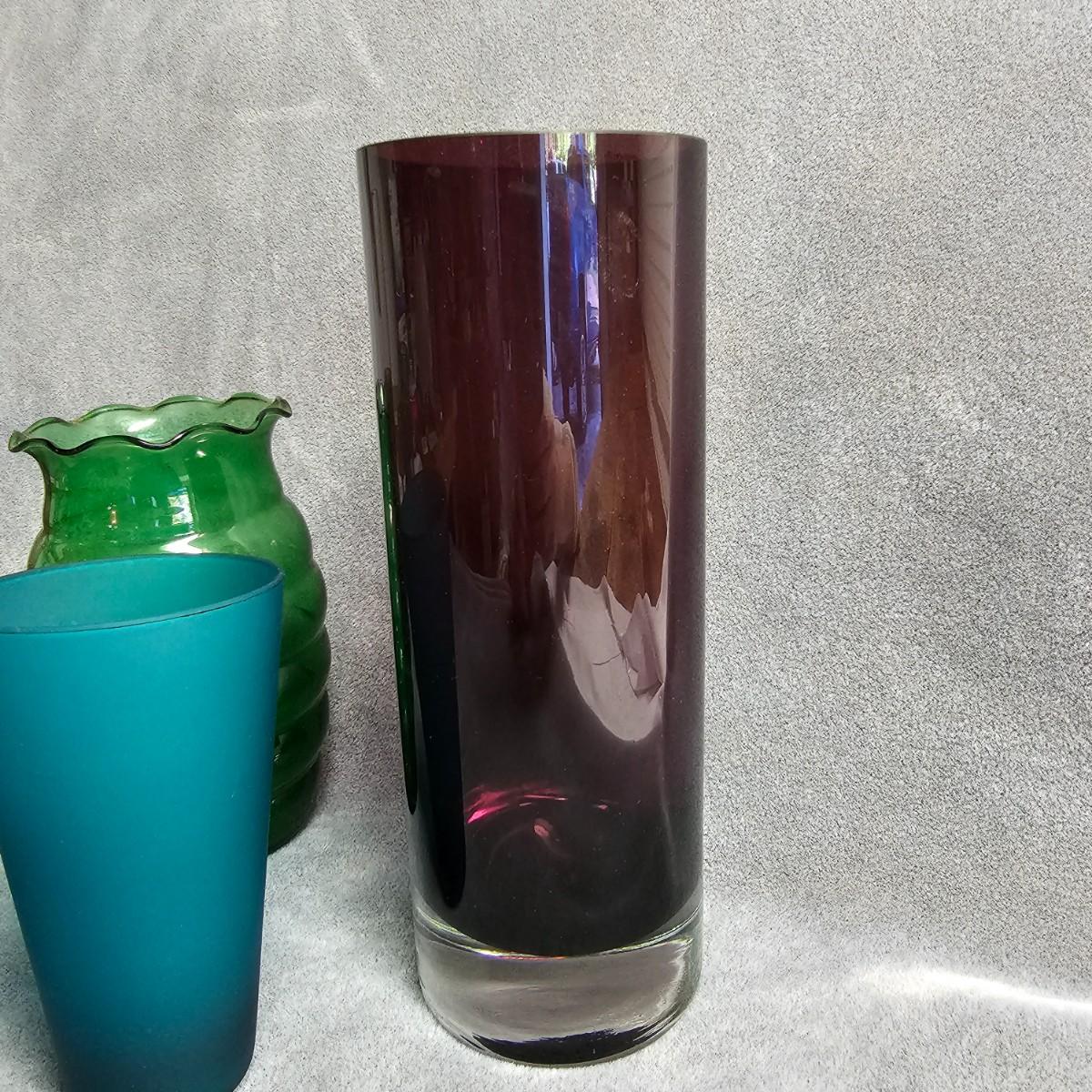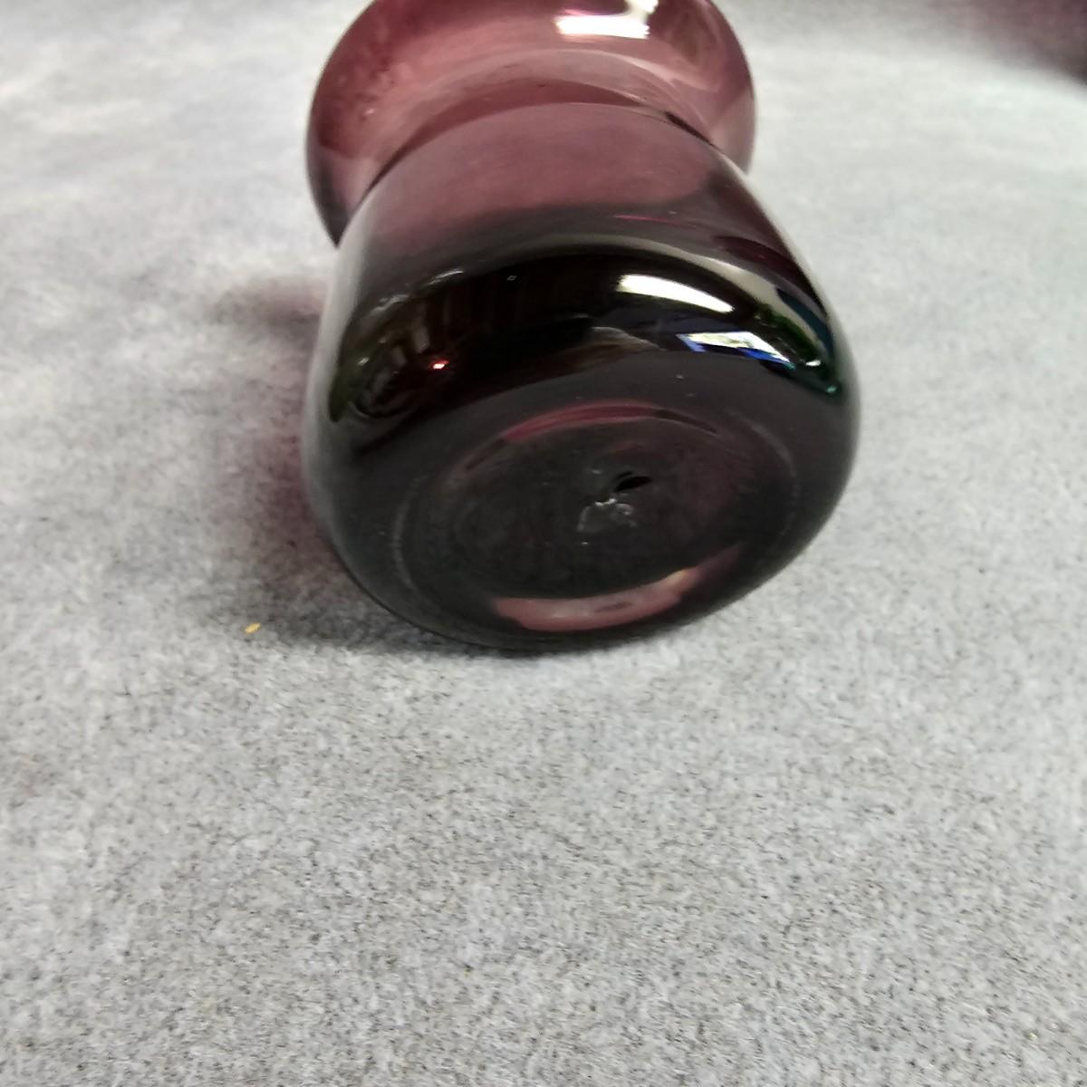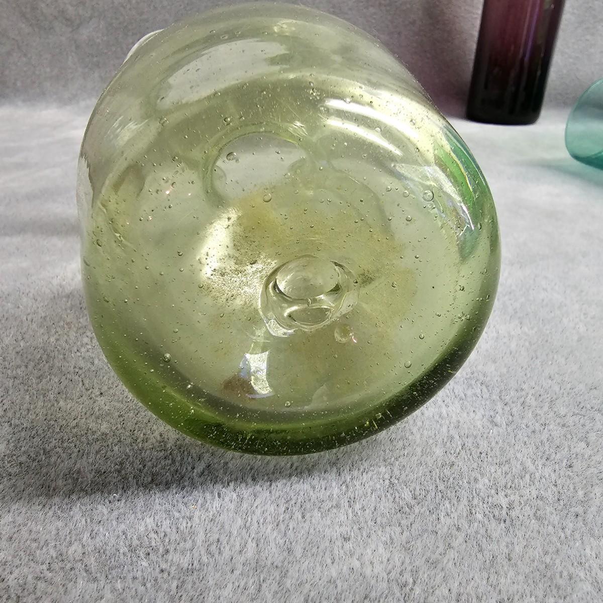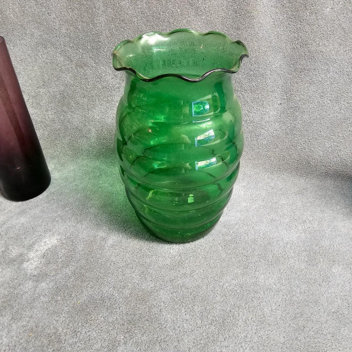 Eight pieces of colorful glass vases, cup and small pitcher. Colors of amethyst, green and celery. Tallest piece is 4"D x 10"H, smallest is 2.5"D x 2.75"H. See photos for details. Shipping available.