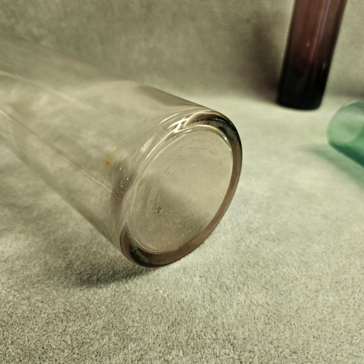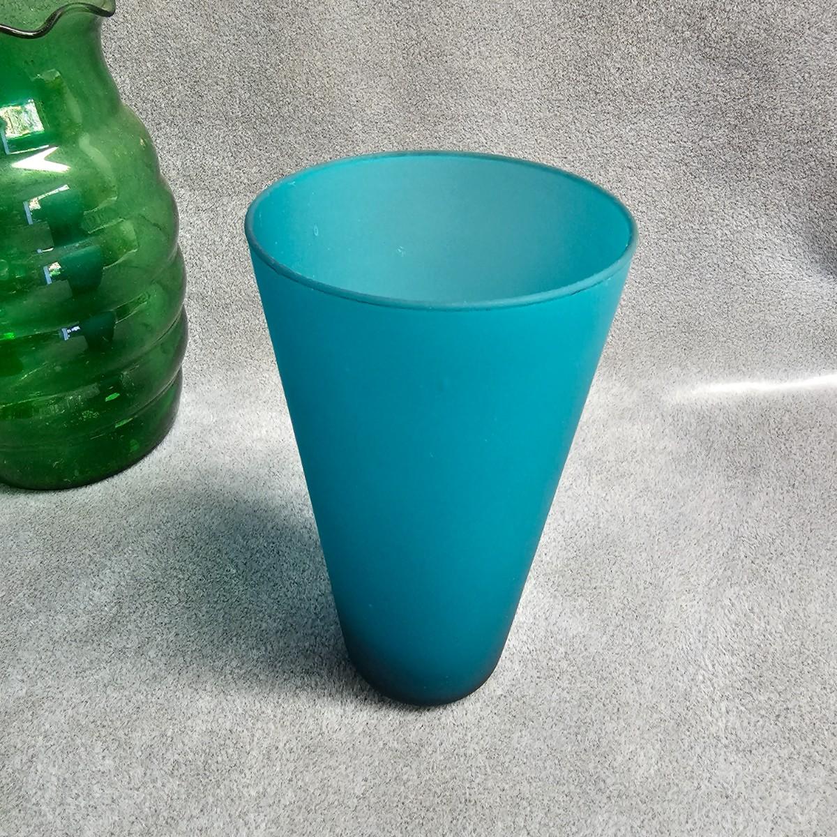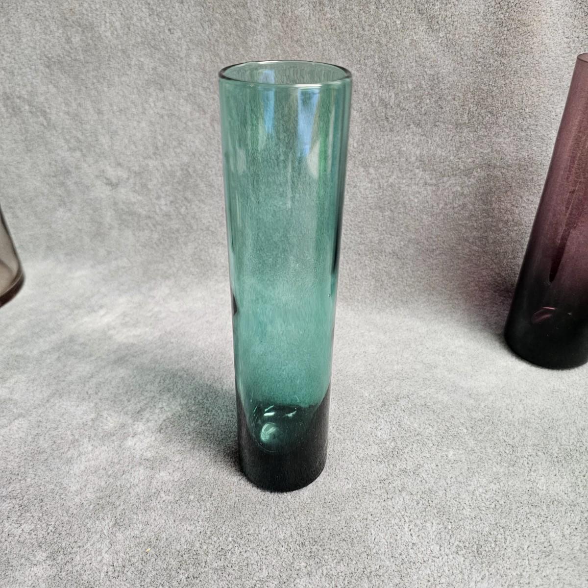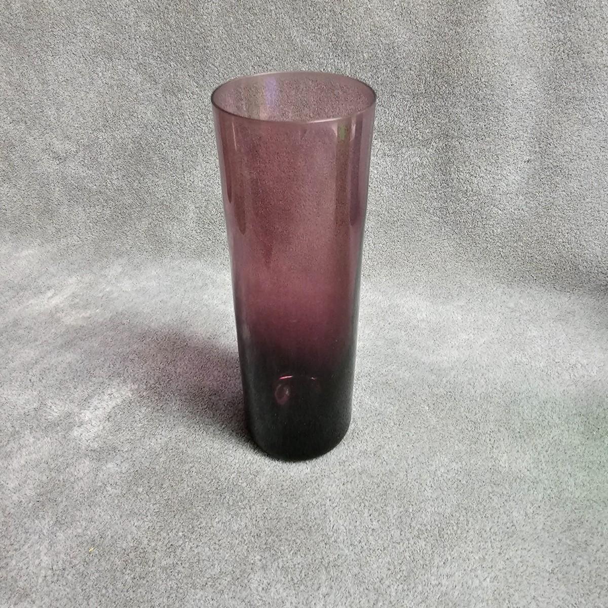 Eight pieces of colorful glass vases, cup and small pitcher. Colors of amethyst, green and celery. Tallest piece is 4"D x 10"H, smallest is 2.5"D x 2.75"H. See photos for details. Shipping available.