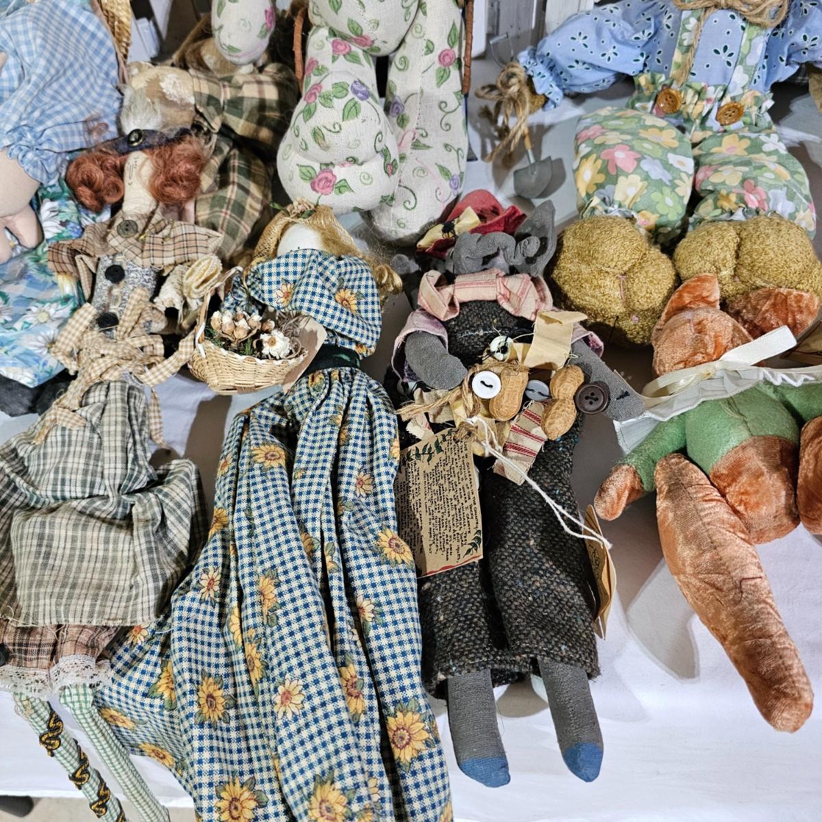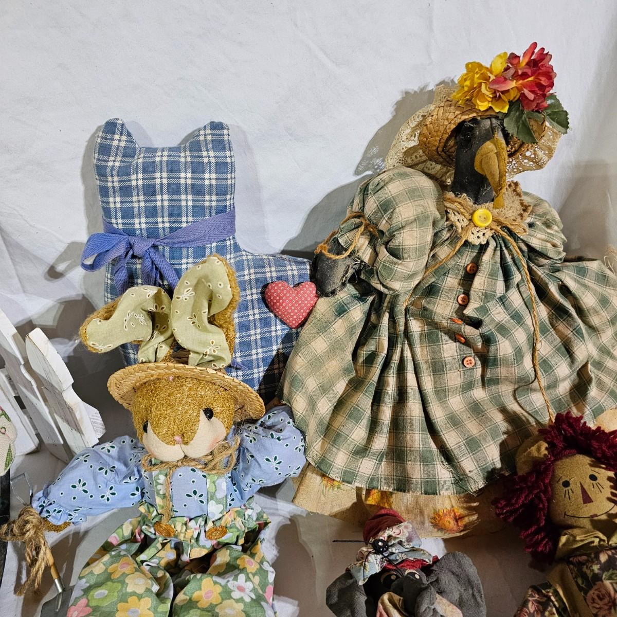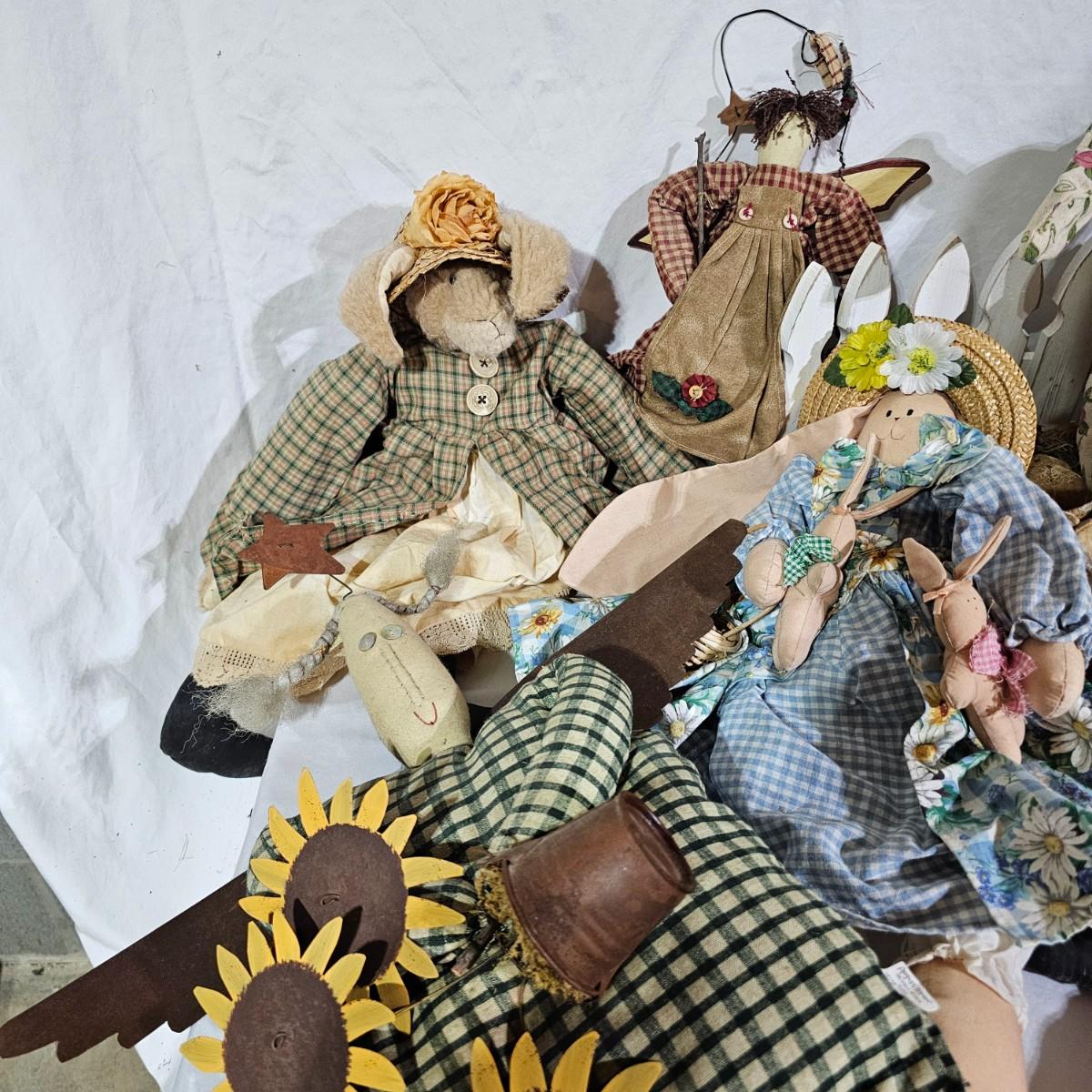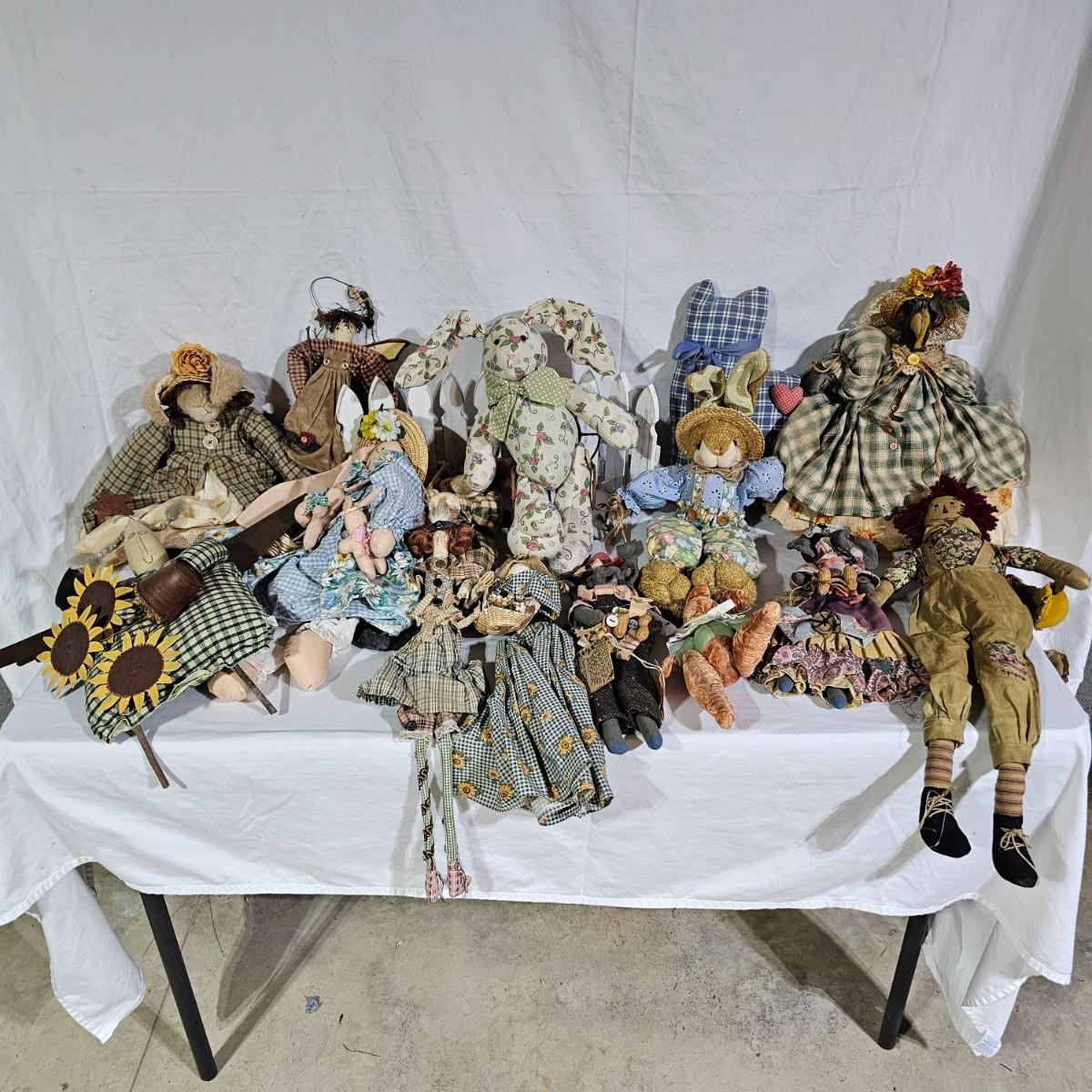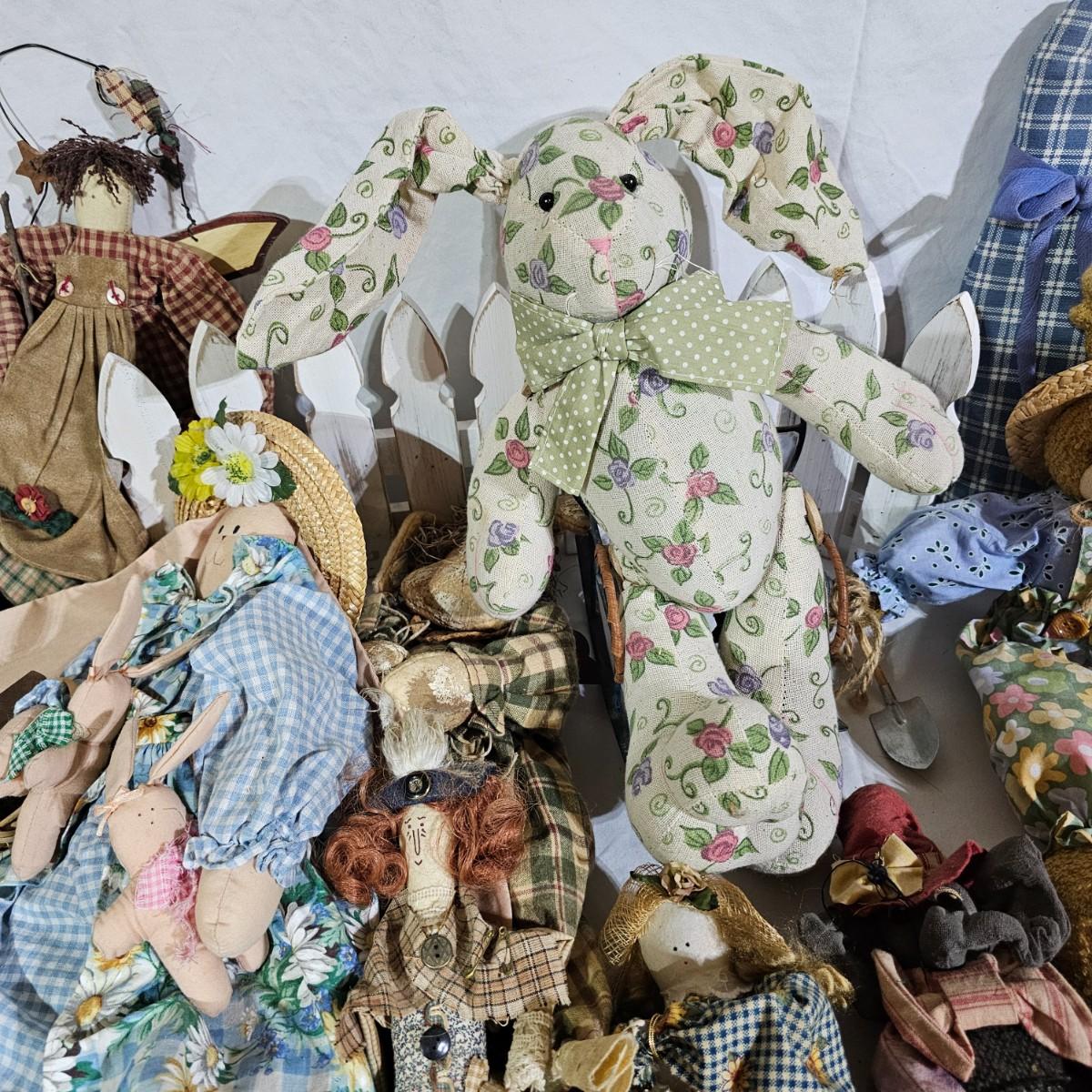 Lots of soft sewn figures here, rabbits, ducks, birds, elephants, angels, more. Most have clothing and adornments to suit. Some old and some newer, have been well loved. Some staining and discoloration on clothes. White fence is hinged, measures 20" x 8". Dolls run from 14"H to 28"H. Bin is included in the lot. See photos for details. Local pickup only.
