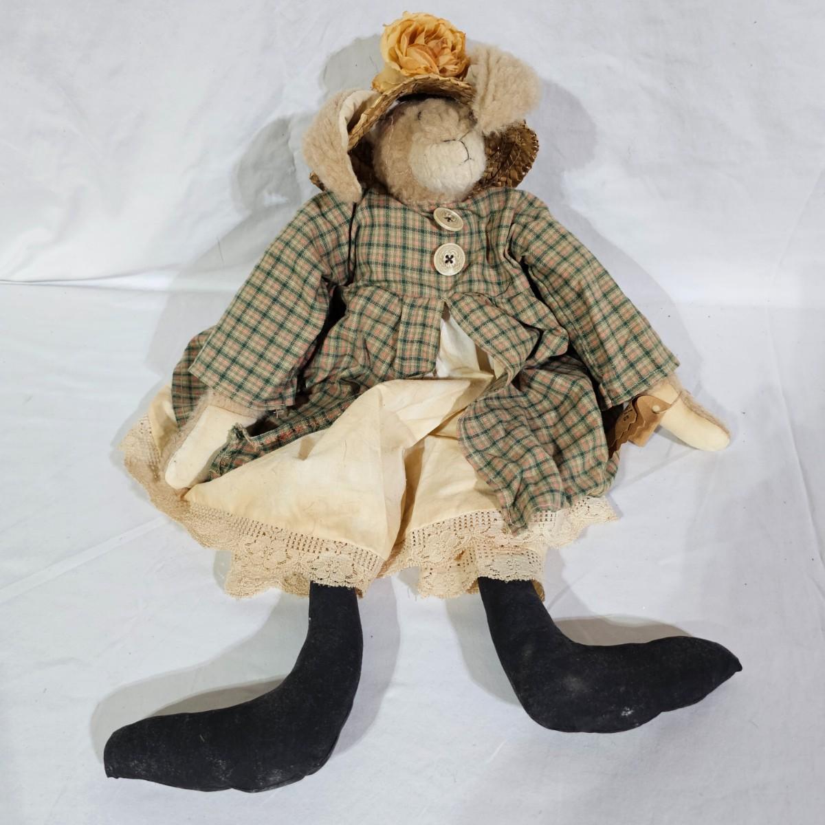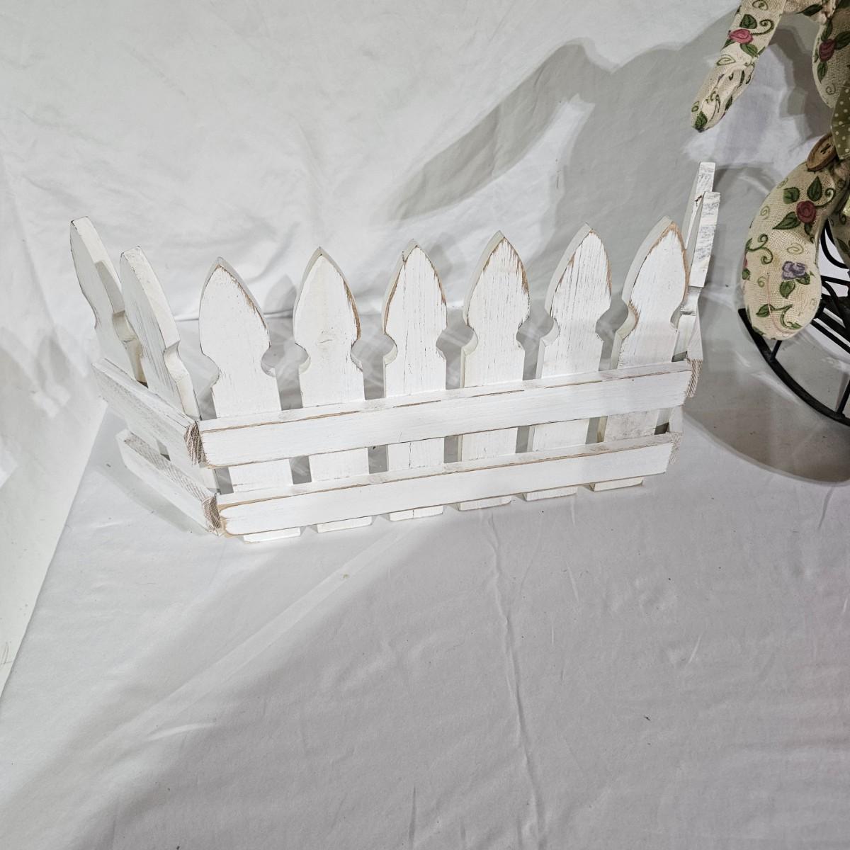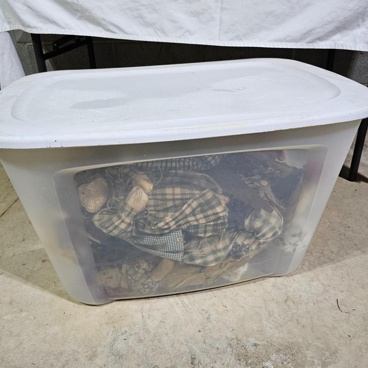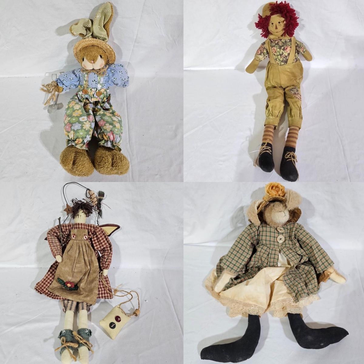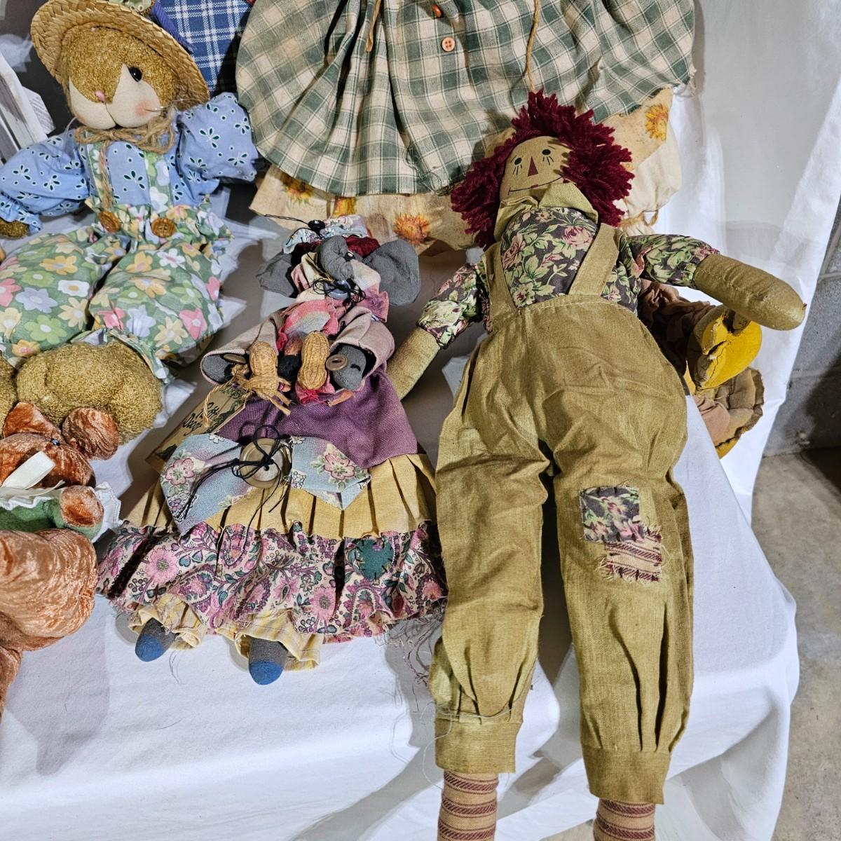 Lots of soft sewn figures here, rabbits, ducks, birds, elephants, angels, more. Most have clothing and adornments to suit. Some old and some newer, have been well loved. Some staining and discoloration on clothes. White fence is hinged, measures 20" x 8". Dolls run from 14"H to 28"H. Bin is included in the lot. See photos for details. Local pickup only.
