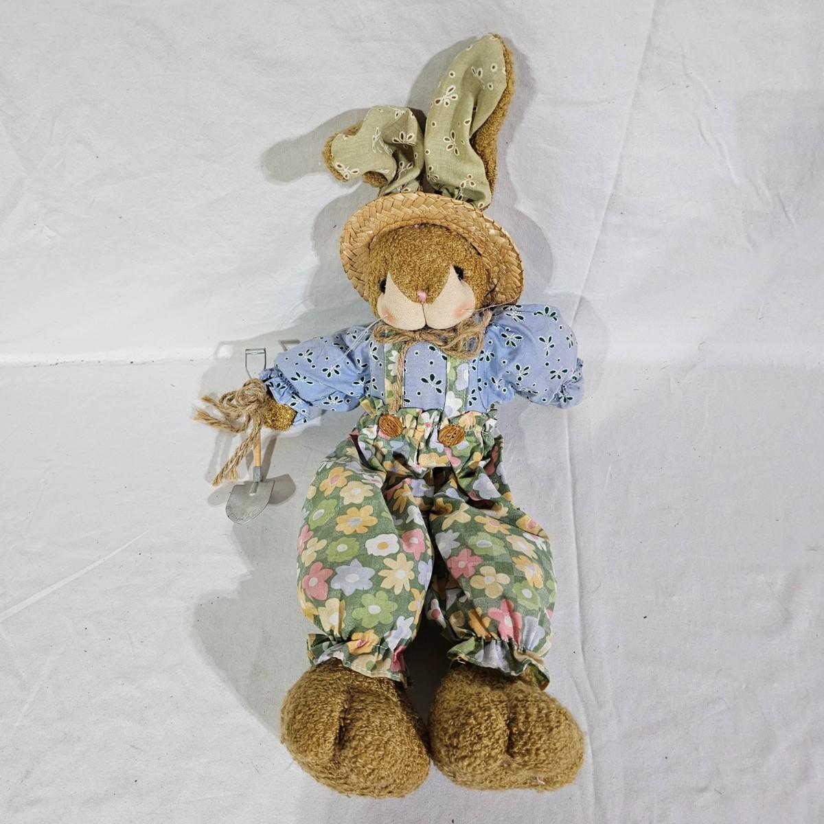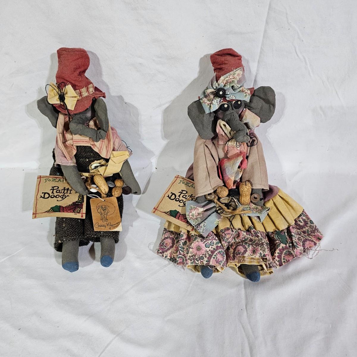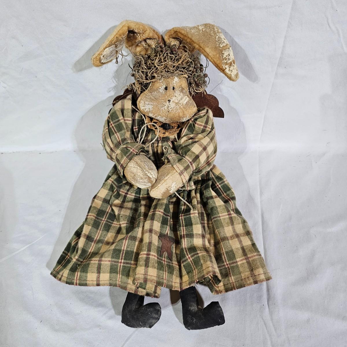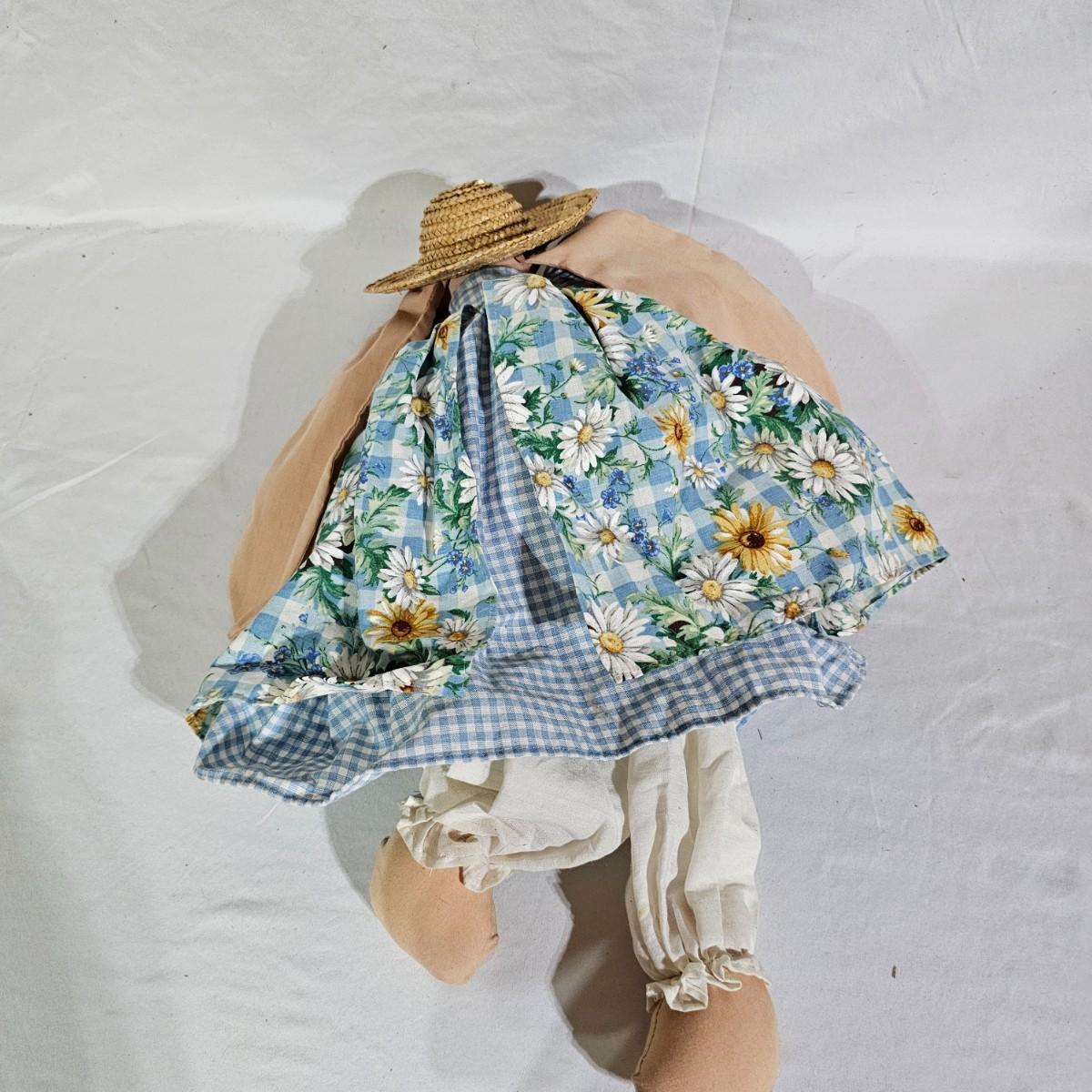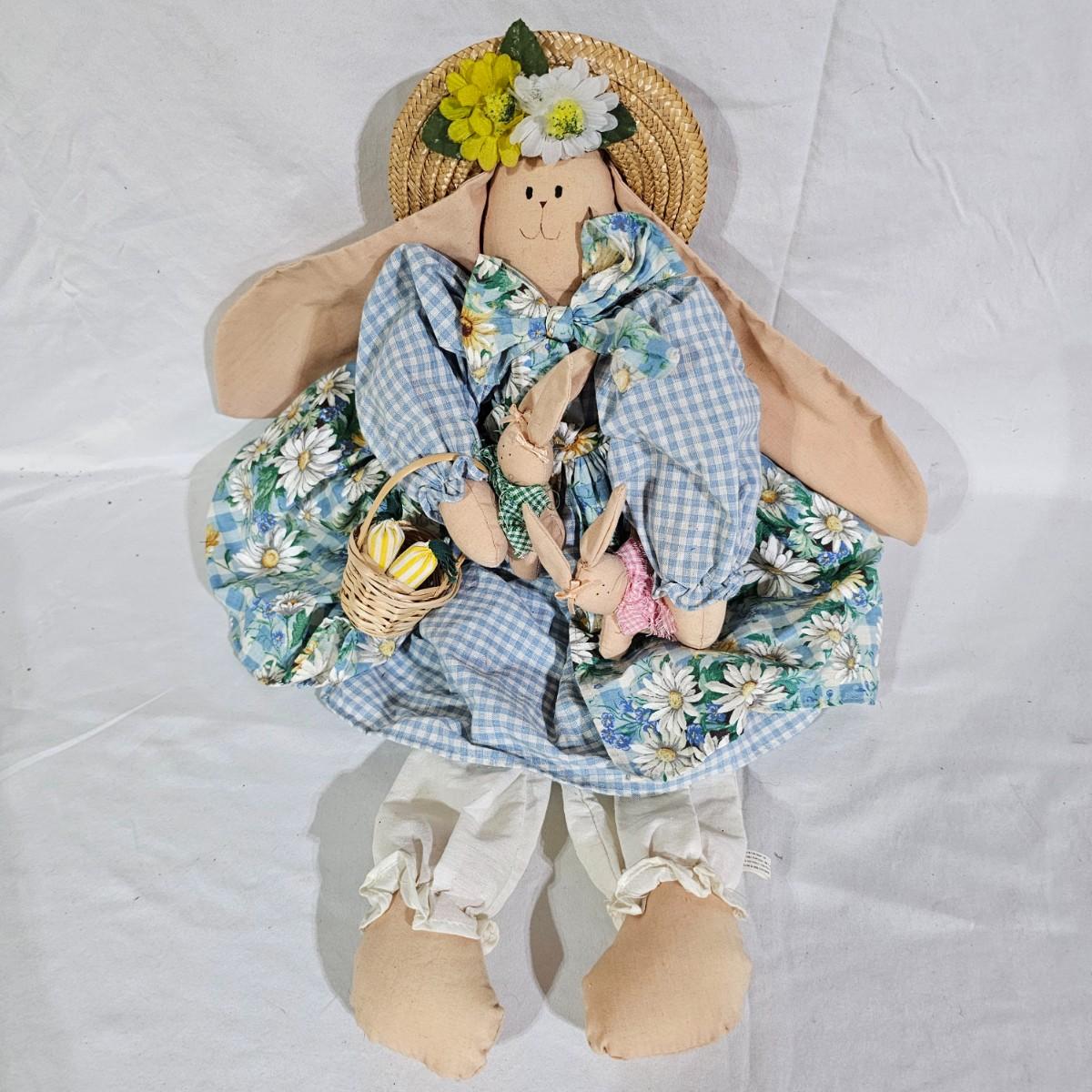 Lots of soft sewn figures here, rabbits, ducks, birds, elephants, angels, more. Most have clothing and adornments to suit. Some old and some newer, have been well loved. Some staining and discoloration on clothes. White fence is hinged, measures 20" x 8". Dolls run from 14"H to 28"H. Bin is included in the lot. See photos for details. Local pickup only.
