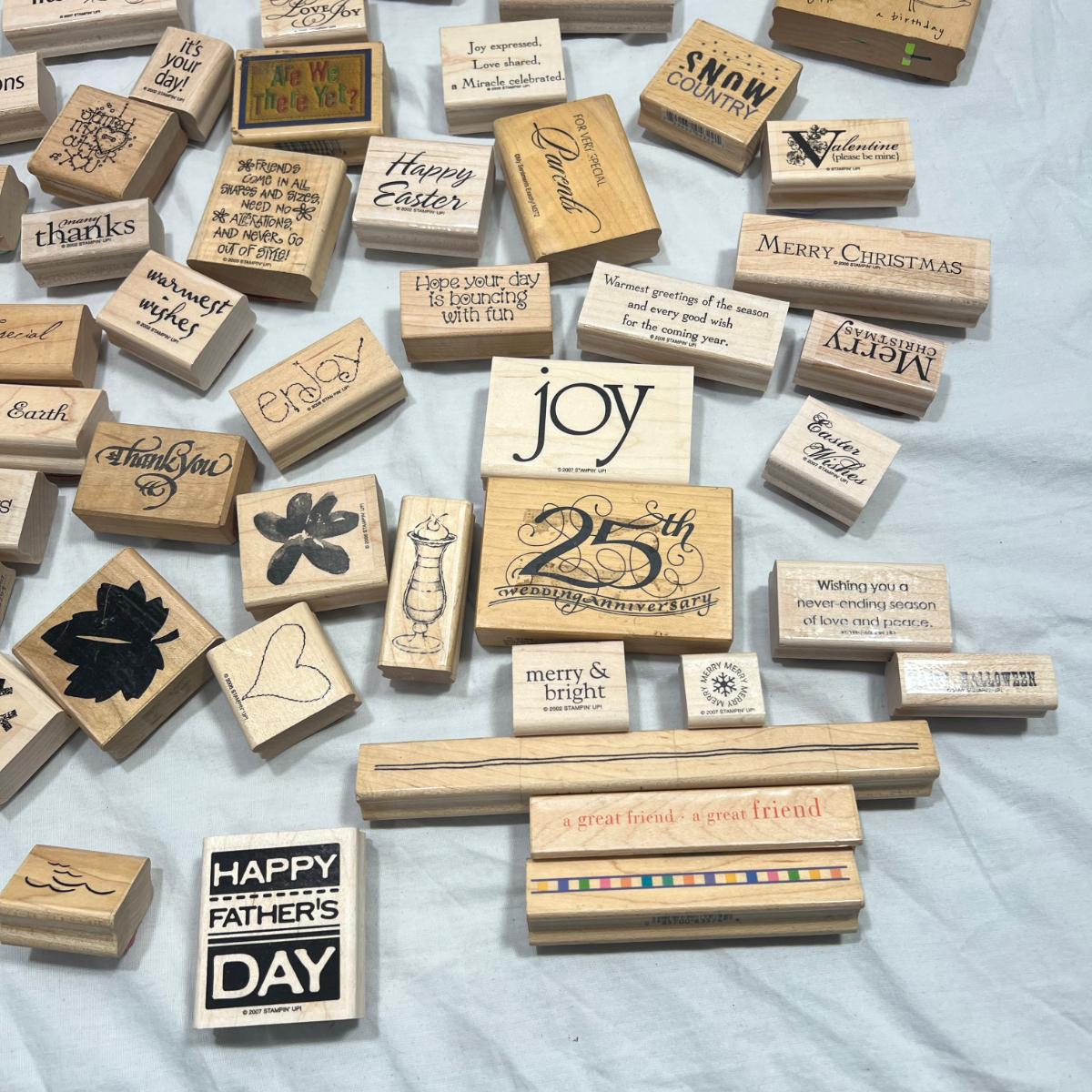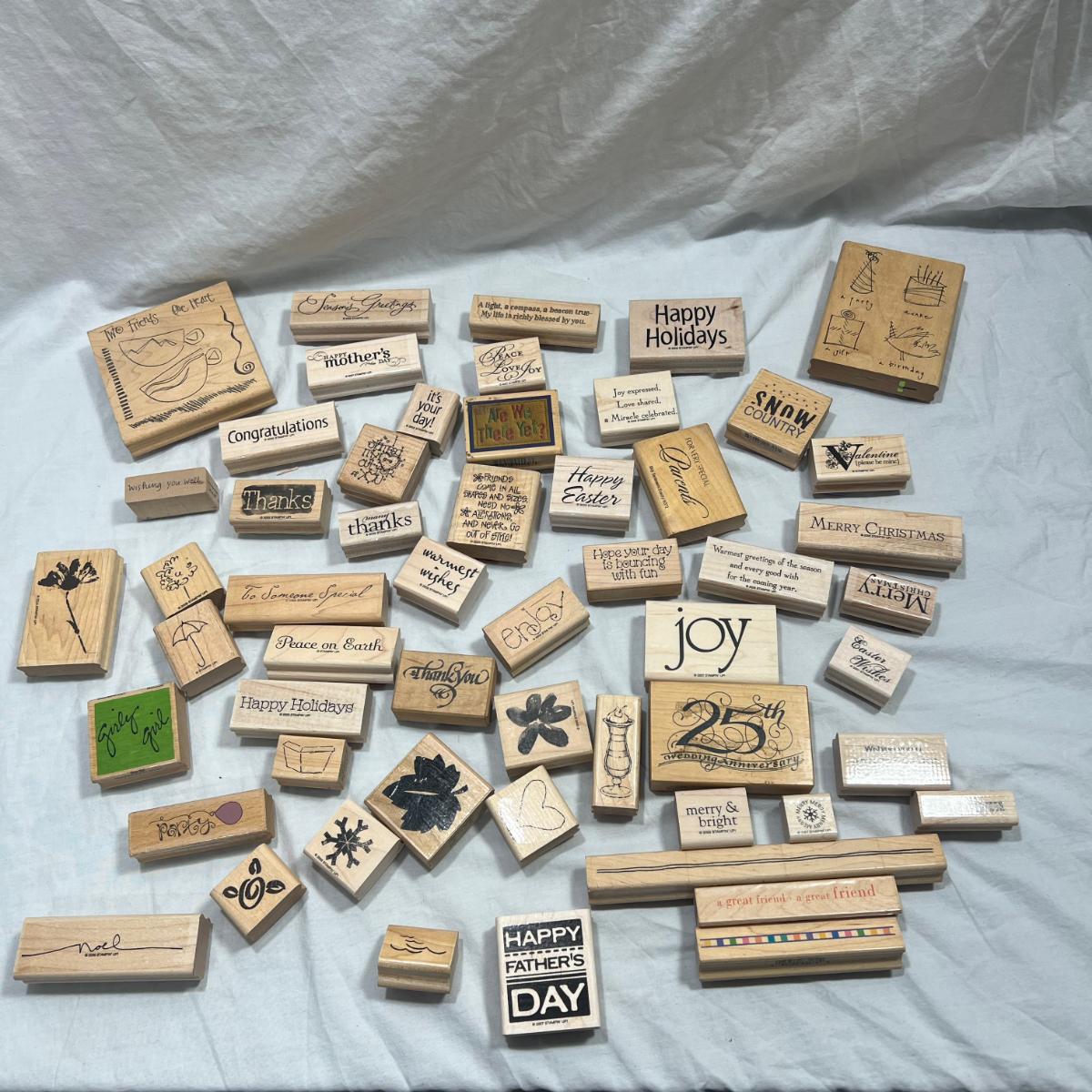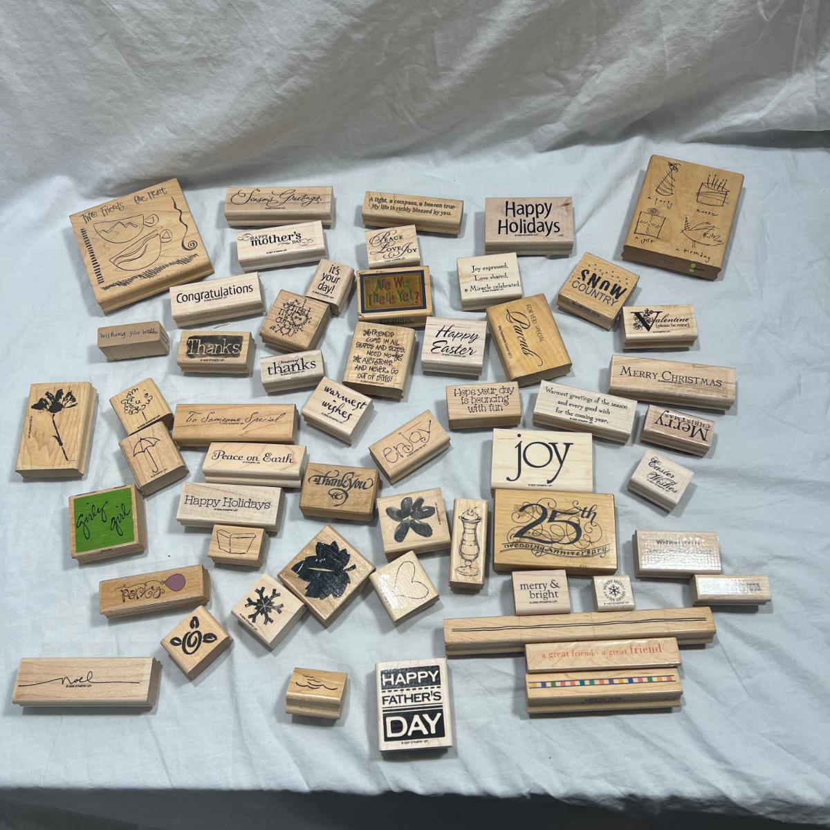 Assorted Crafting Stamps, there is a mixture of designs phrases and Holidays. There are 55 stamps in this Collection.