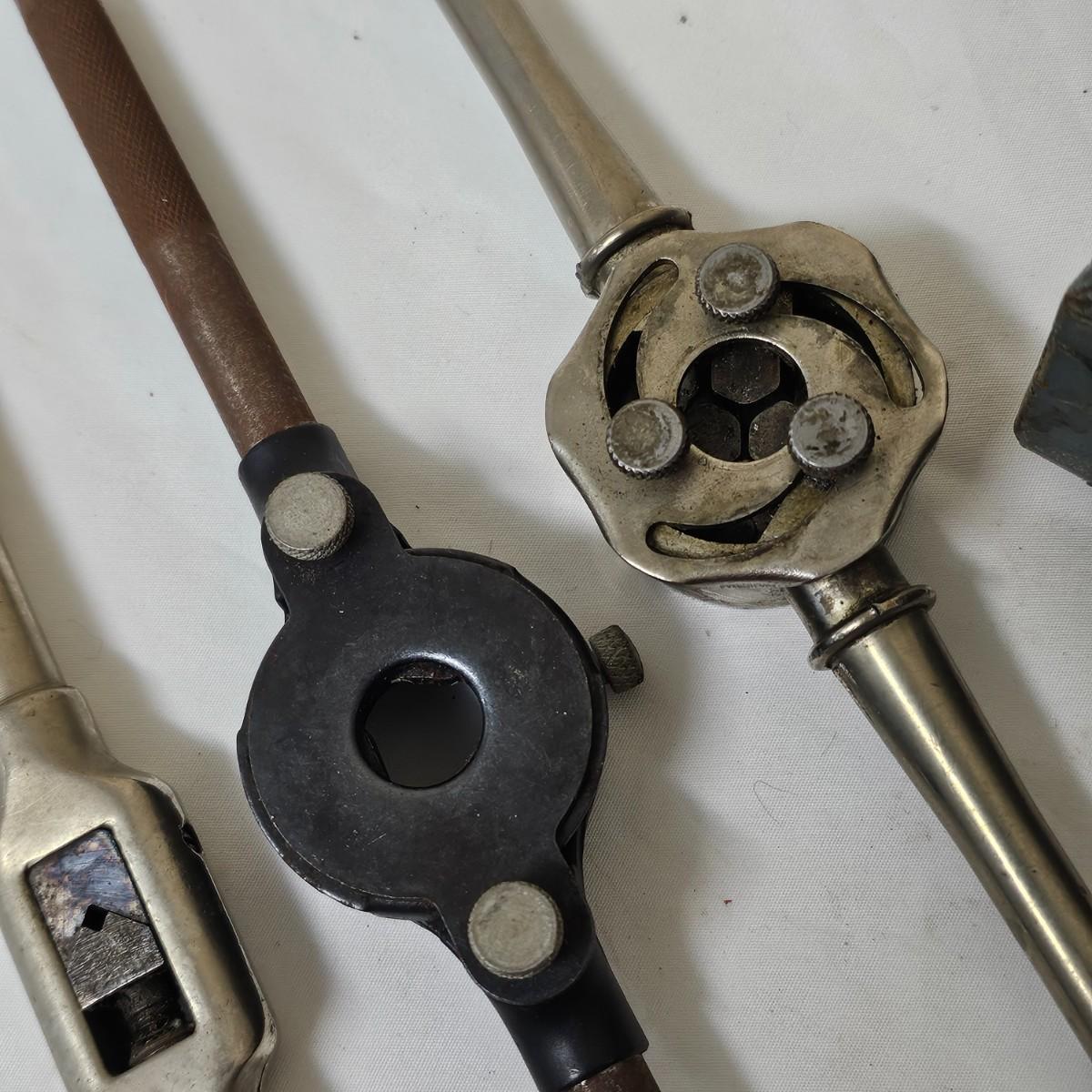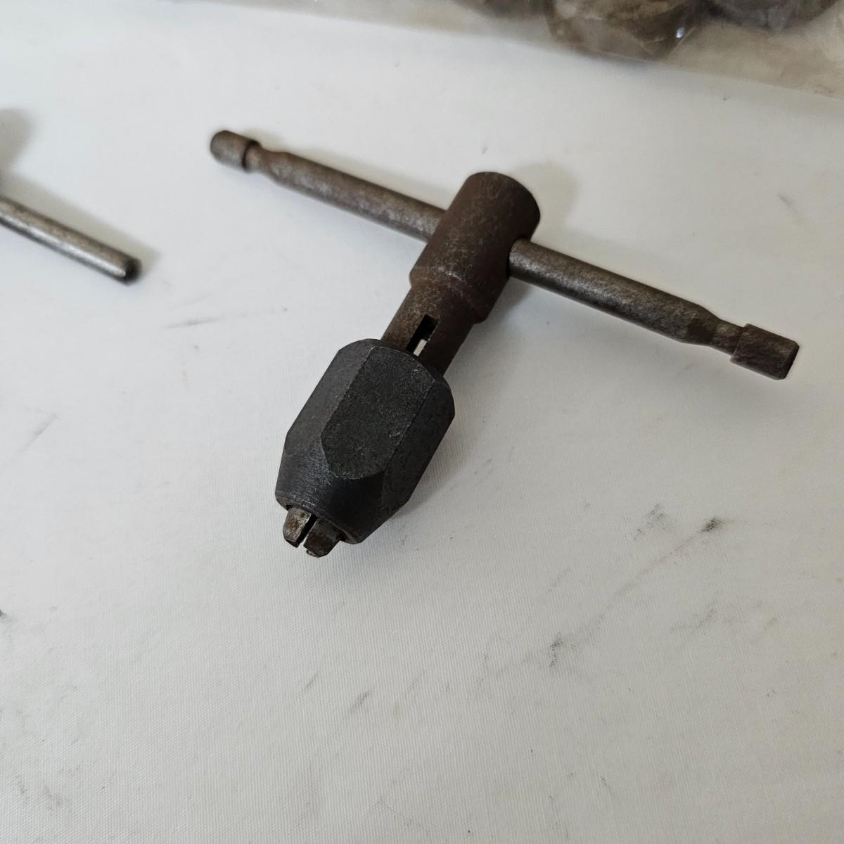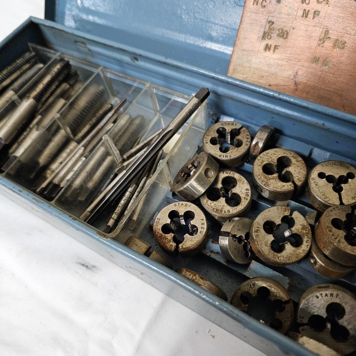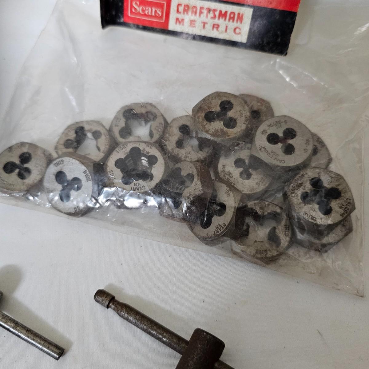 SAE and metric taps and dies in this set. Most items are Craftsman brand. Three handled holders, 9" to 10" long. Long tapered reader. Other pieces as shown. See photos for details. Shipping available.