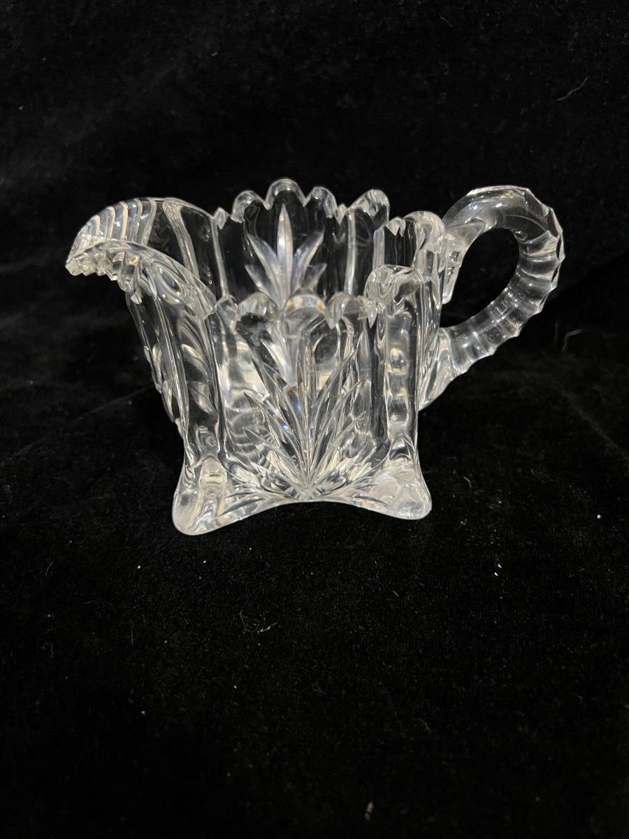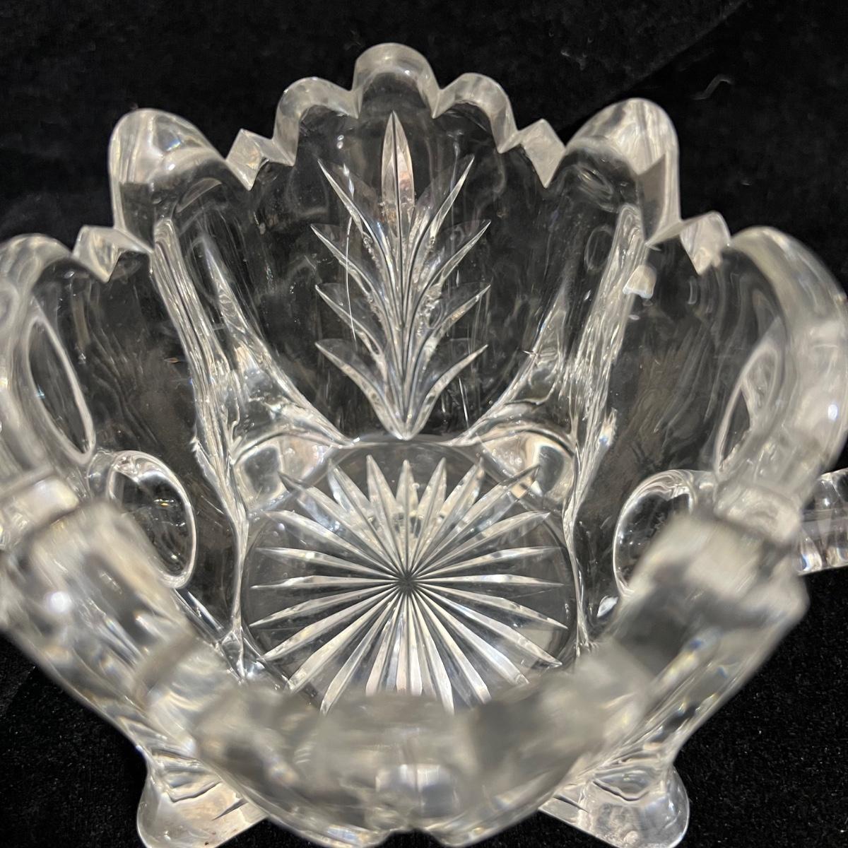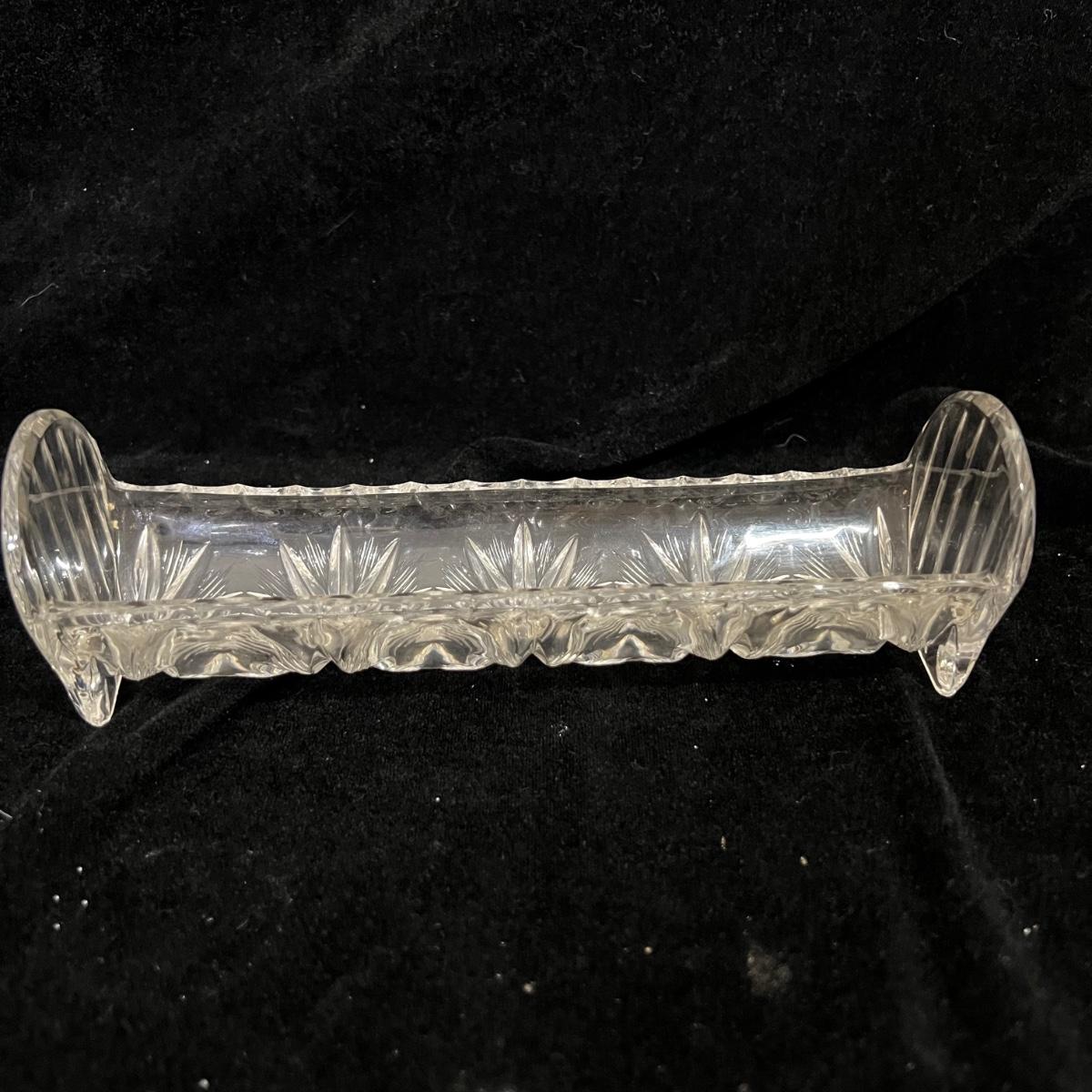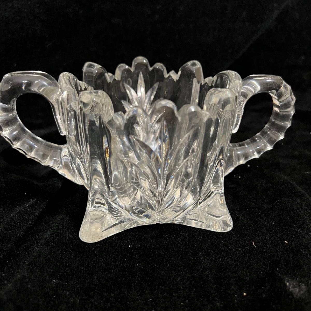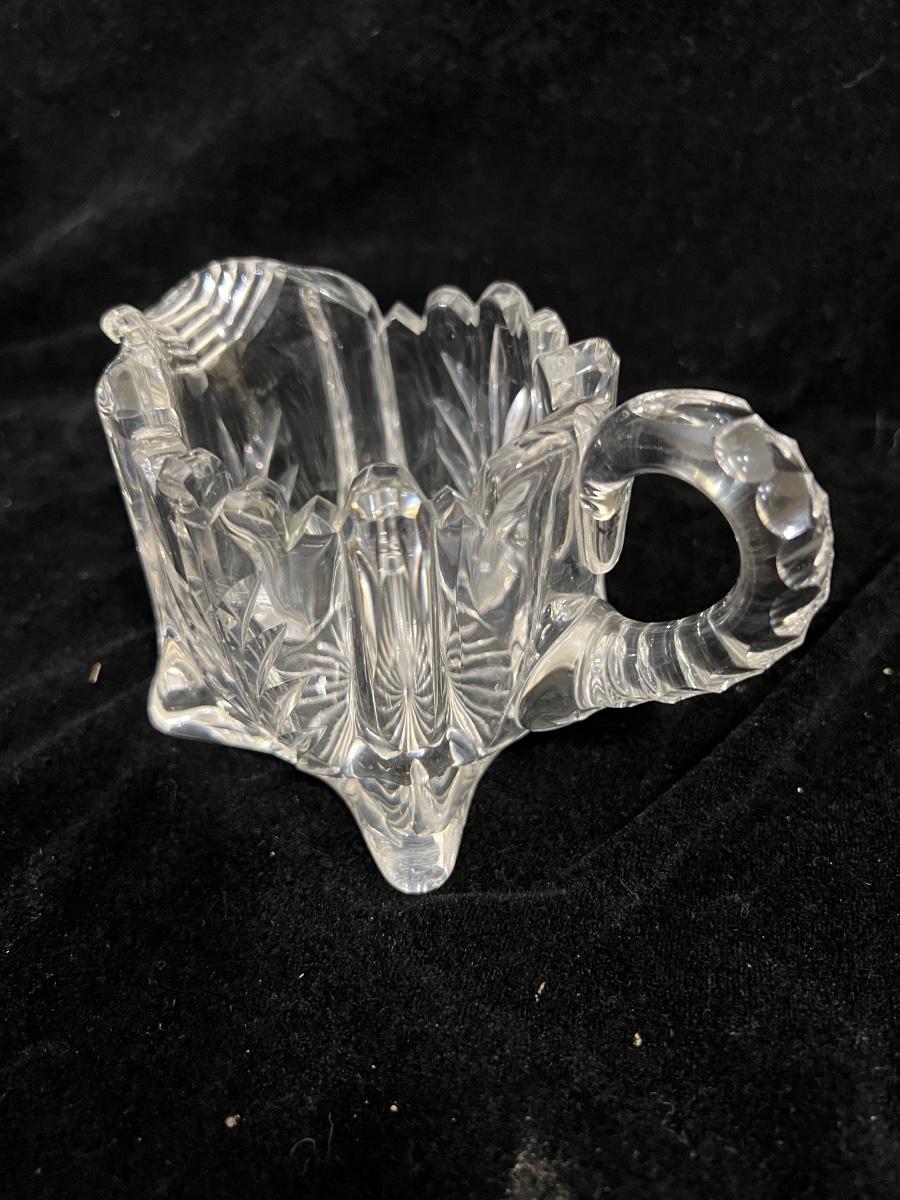 A lovely assortment of crystal and glass entertaining necessities. Four matching glass bowls 5”D x 2.25”H. Sugar and cream matching set both 3”H and the cream pitcher 3.3”D and the sugar bowl 4”D. Glass salt and pepper shakers with rubber stoppers, 3”H x 1.5”D. Low handled serving bowl 6”D x 1.5”H. Stewart lead crystal rose bowl 3”D x 2.75”H with its label still intact. Crystal cracker tray with half-round and high ends makes it a perfect serving tray for round crackers or charcuterie. Made by Crystal Clear is 8.75" long at bottom and 9" long at top, the two end pieces are tapered inward at their foot. The 8" square bowl is 2.5”H and a large serving bowl is 10.5”D x 4”H. Two pedestal bowls, one 4.75”D x 4.75”H and one 6”D x 8”H with a small chip in its round base. Shipping available. Shipping can be costly. We suggest calling our local UPS with dimensions and getting an estimate before bidding: (828) 252-6930.