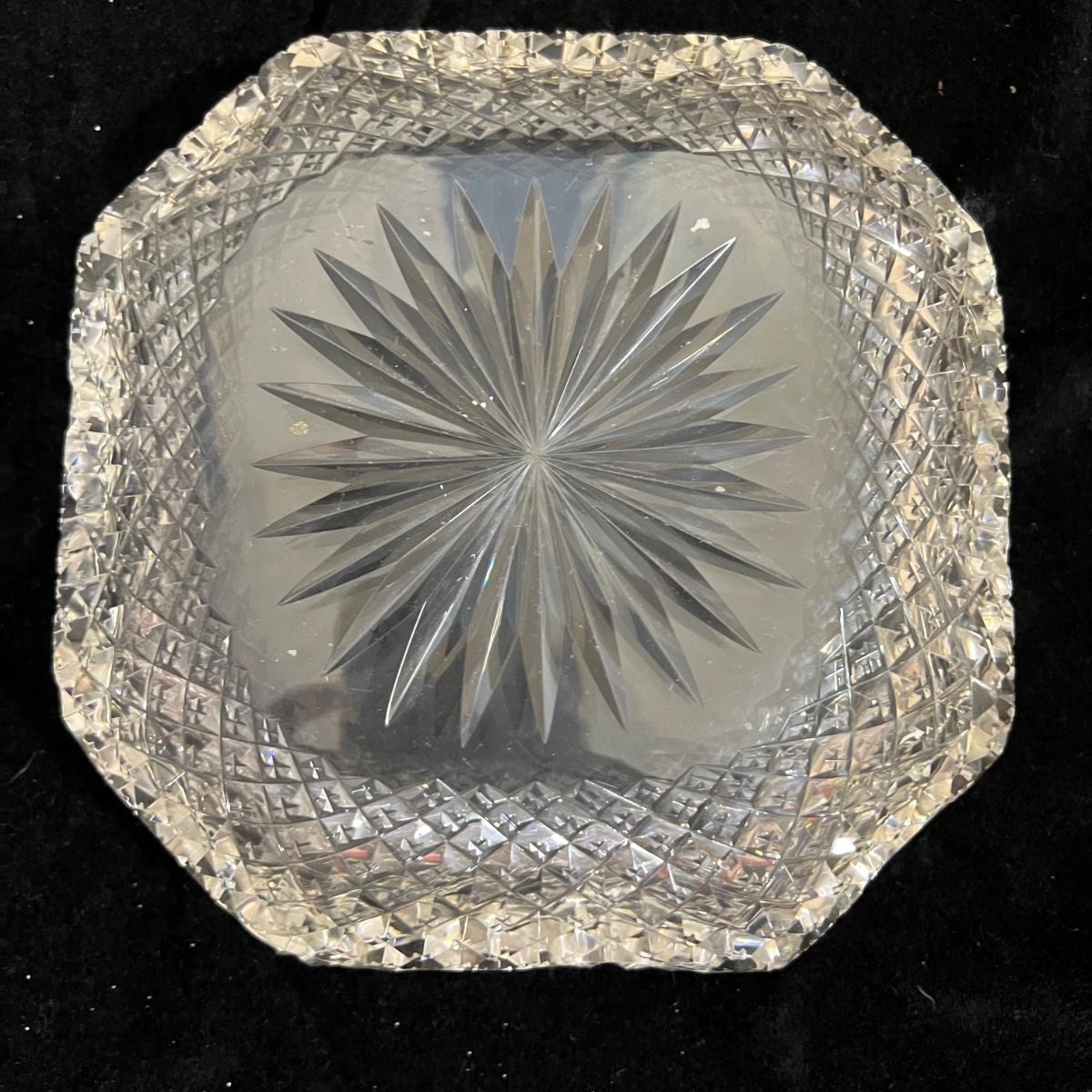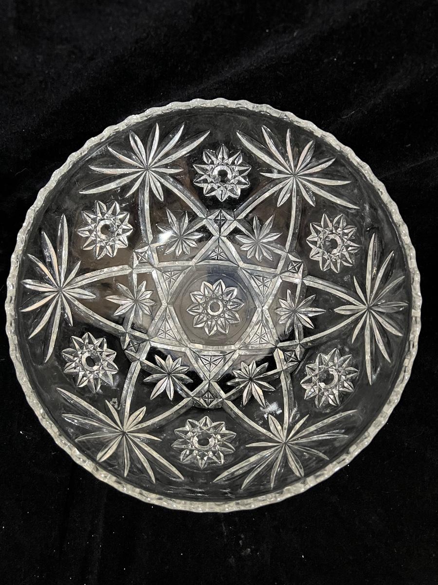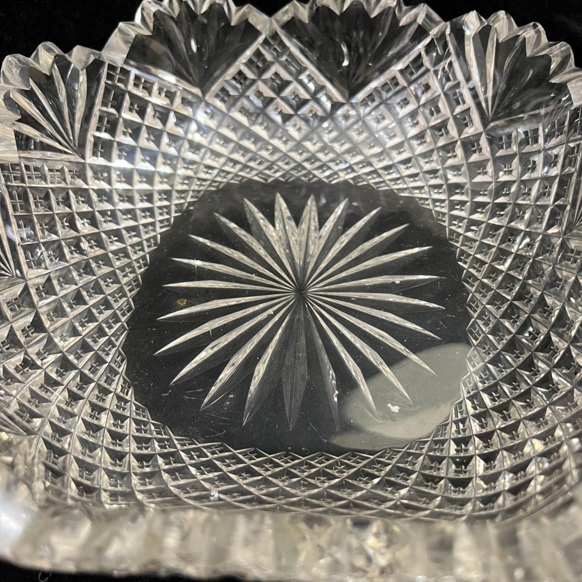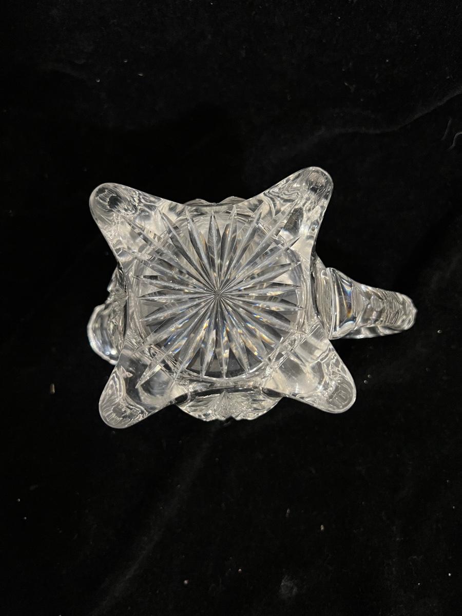 A lovely assortment of crystal and glass entertaining necessities. Four matching glass bowls 5”D x 2.25”H. Sugar and cream matching set both 3”H and the cream pitcher 3.3”D and the sugar bowl 4”D. Glass salt and pepper shakers with rubber stoppers, 3”H x 1.5”D. Low handled serving bowl 6”D x 1.5”H. Stewart lead crystal rose bowl 3”D x 2.75”H with its label still intact. Crystal cracker tray with half-round and high ends makes it a perfect serving tray for round crackers or charcuterie. Made by Crystal Clear is 8.75" long at bottom and 9" long at top, the two end pieces are tapered inward at their foot. The 8" square bowl is 2.5”H and a large serving bowl is 10.5”D x 4”H. Two pedestal bowls, one 4.75”D x 4.75”H and one 6”D x 8”H with a small chip in its round base. Shipping available. Shipping can be costly. We suggest calling our local UPS with dimensions and getting an estimate before bidding: (828) 252-6930.