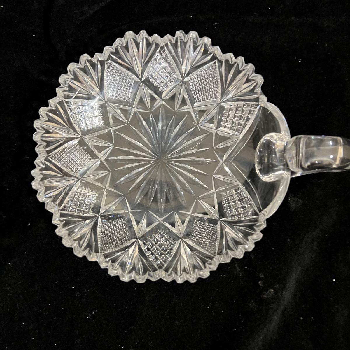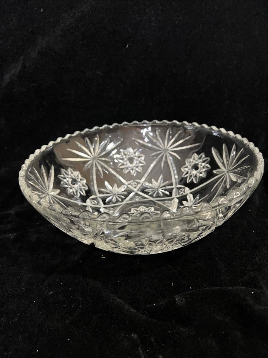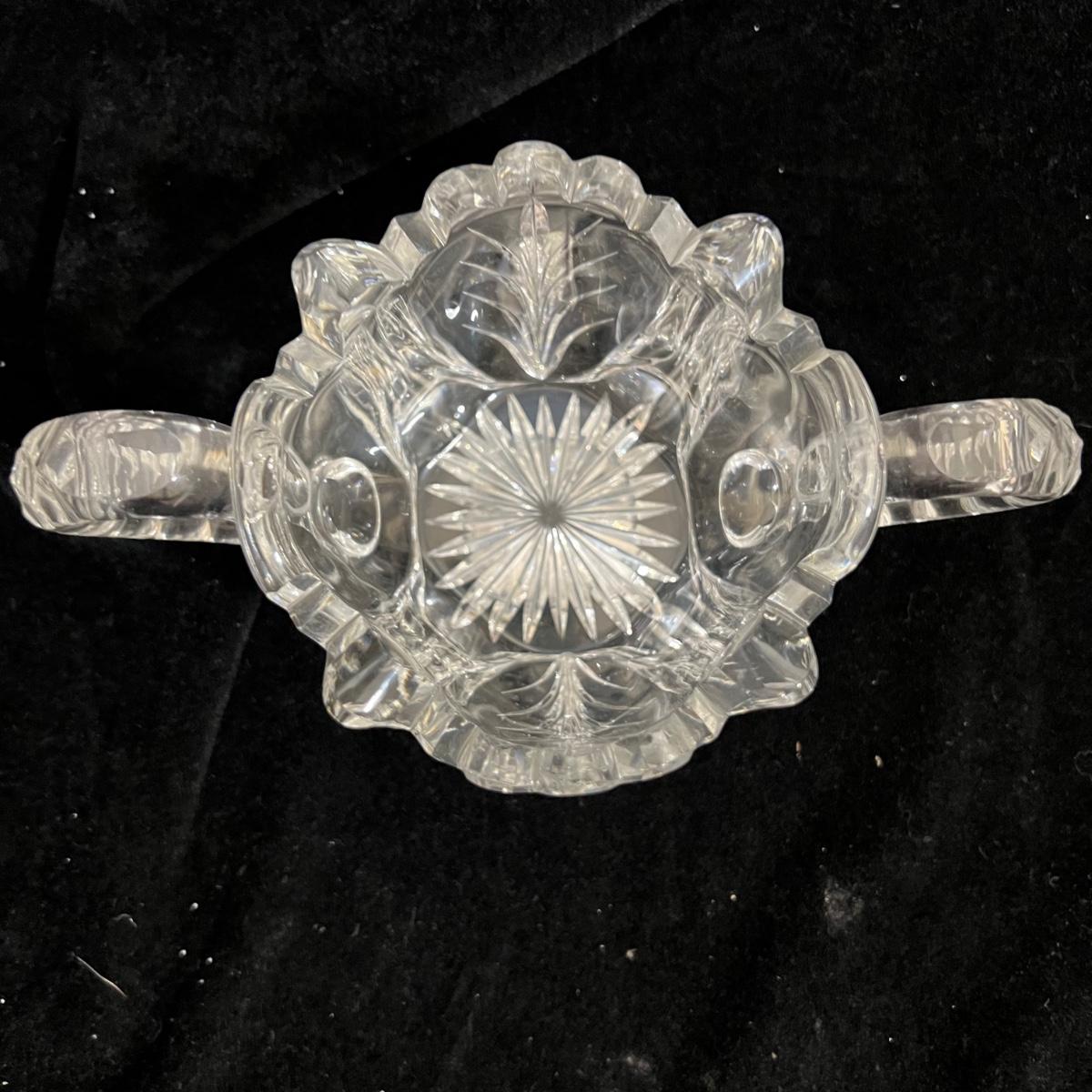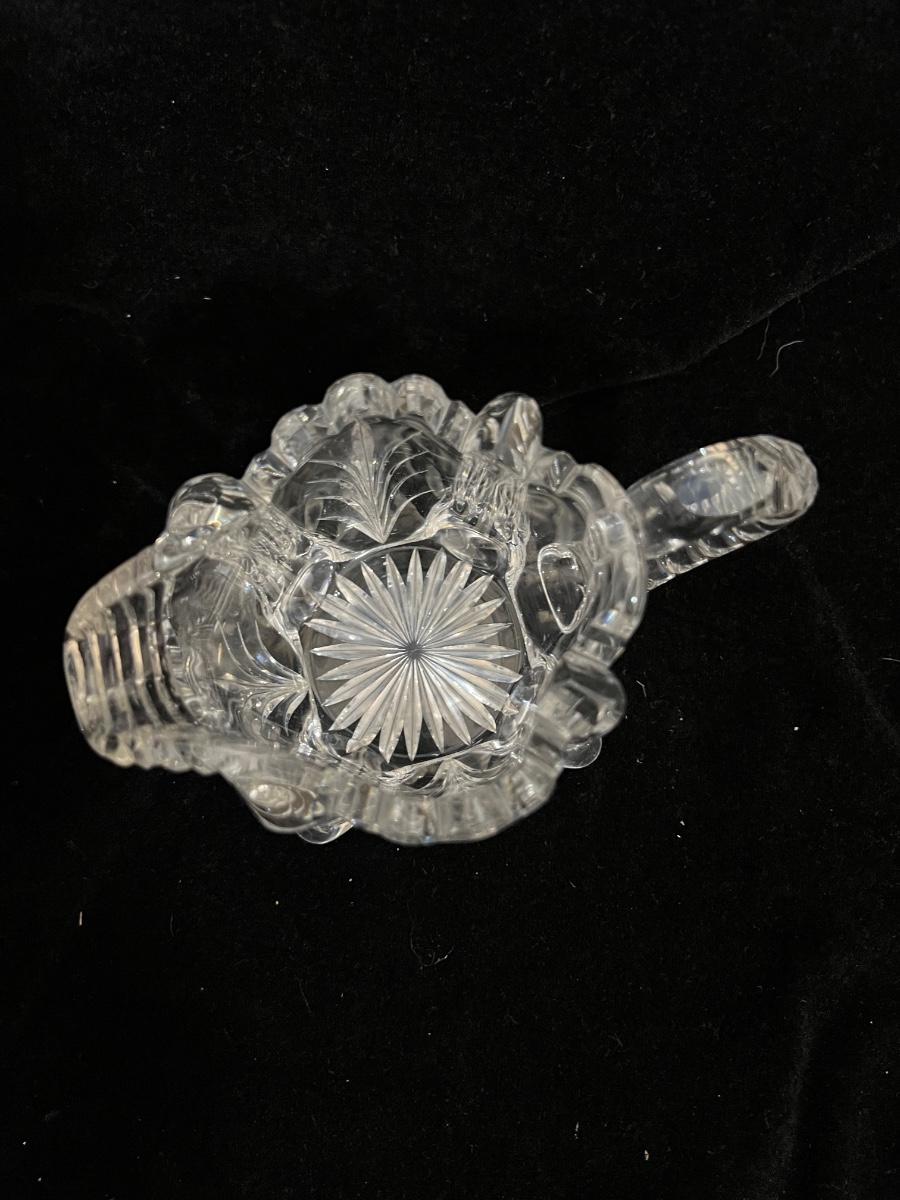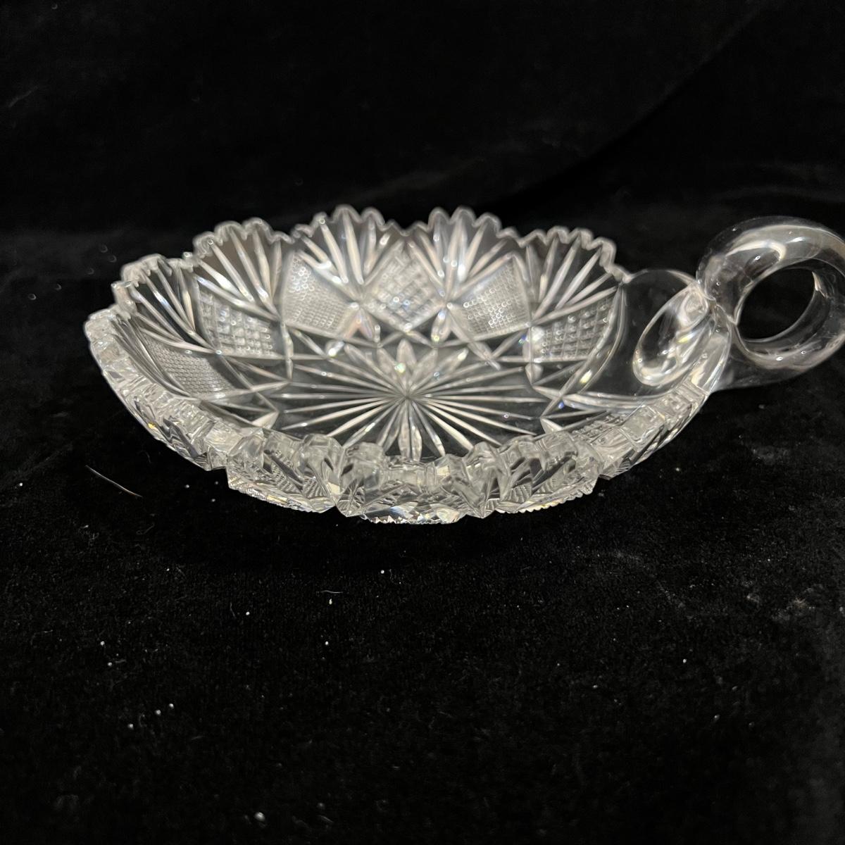 A lovely assortment of crystal and glass entertaining necessities. Four matching glass bowls 5”D x 2.25”H. Sugar and cream matching set both 3”H and the cream pitcher 3.3”D and the sugar bowl 4”D. Glass salt and pepper shakers with rubber stoppers, 3”H x 1.5”D. Low handled serving bowl 6”D x 1.5”H. Stewart lead crystal rose bowl 3”D x 2.75”H with its label still intact. Crystal cracker tray with half-round and high ends makes it a perfect serving tray for round crackers or charcuterie. Made by Crystal Clear is 8.75" long at bottom and 9" long at top, the two end pieces are tapered inward at their foot. The 8" square bowl is 2.5”H and a large serving bowl is 10.5”D x 4”H. Two pedestal bowls, one 4.75”D x 4.75”H and one 6”D x 8”H with a small chip in its round base. Shipping available. Shipping can be costly. We suggest calling our local UPS with dimensions and getting an estimate before bidding: (828) 252-6930.