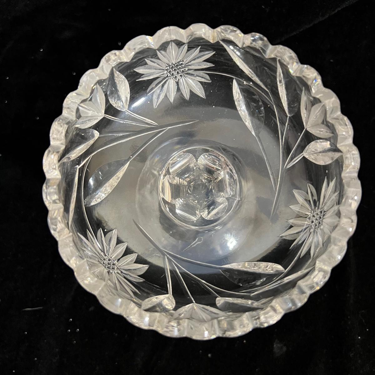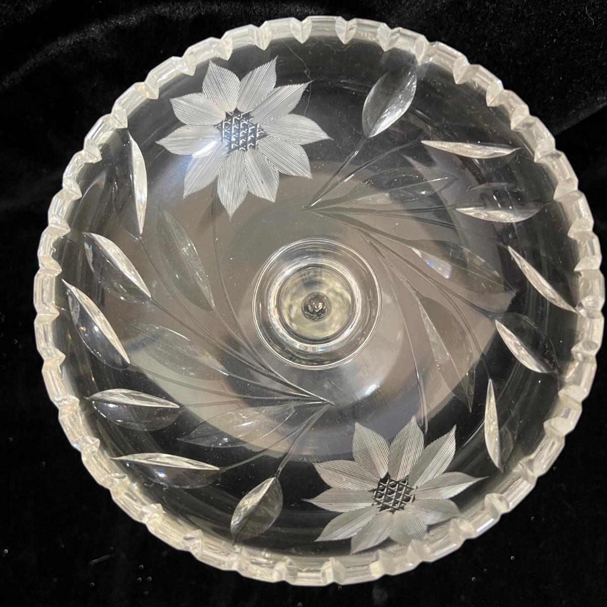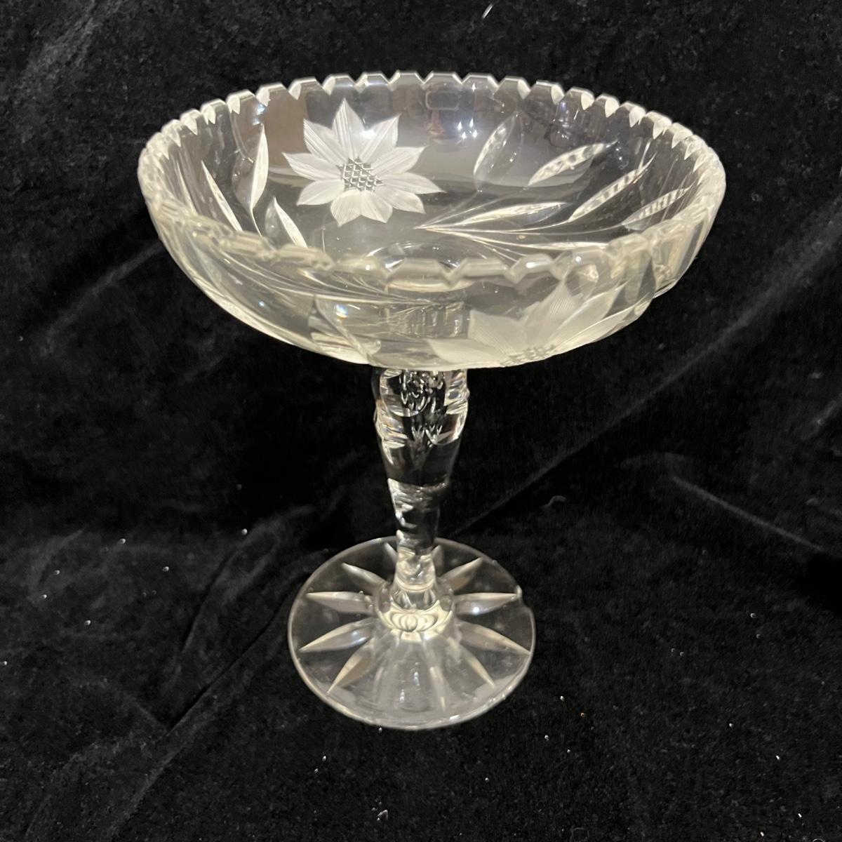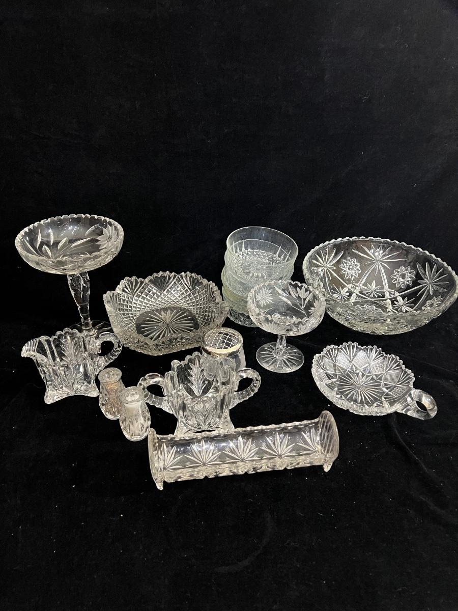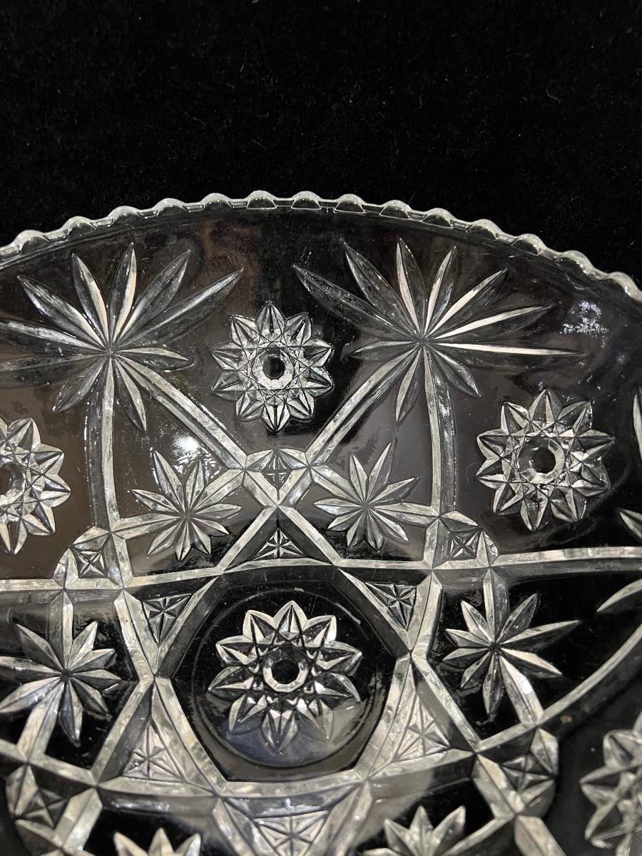 A lovely assortment of crystal and glass entertaining necessities. Four matching glass bowls 5”D x 2.25”H. Sugar and cream matching set both 3”H and the cream pitcher 3.3”D and the sugar bowl 4”D. Glass salt and pepper shakers with rubber stoppers, 3”H x 1.5”D. Low handled serving bowl 6”D x 1.5”H. Stewart lead crystal rose bowl 3”D x 2.75”H with its label still intact. Crystal cracker tray with half-round and high ends makes it a perfect serving tray for round crackers or charcuterie. Made by Crystal Clear is 8.75" long at bottom and 9" long at top, the two end pieces are tapered inward at their foot. The 8" square bowl is 2.5”H and a large serving bowl is 10.5”D x 4”H. Two pedestal bowls, one 4.75”D x 4.75”H and one 6”D x 8”H with a small chip in its round base. Shipping available. Shipping can be costly. We suggest calling our local UPS with dimensions and getting an estimate before bidding: (828) 252-6930.