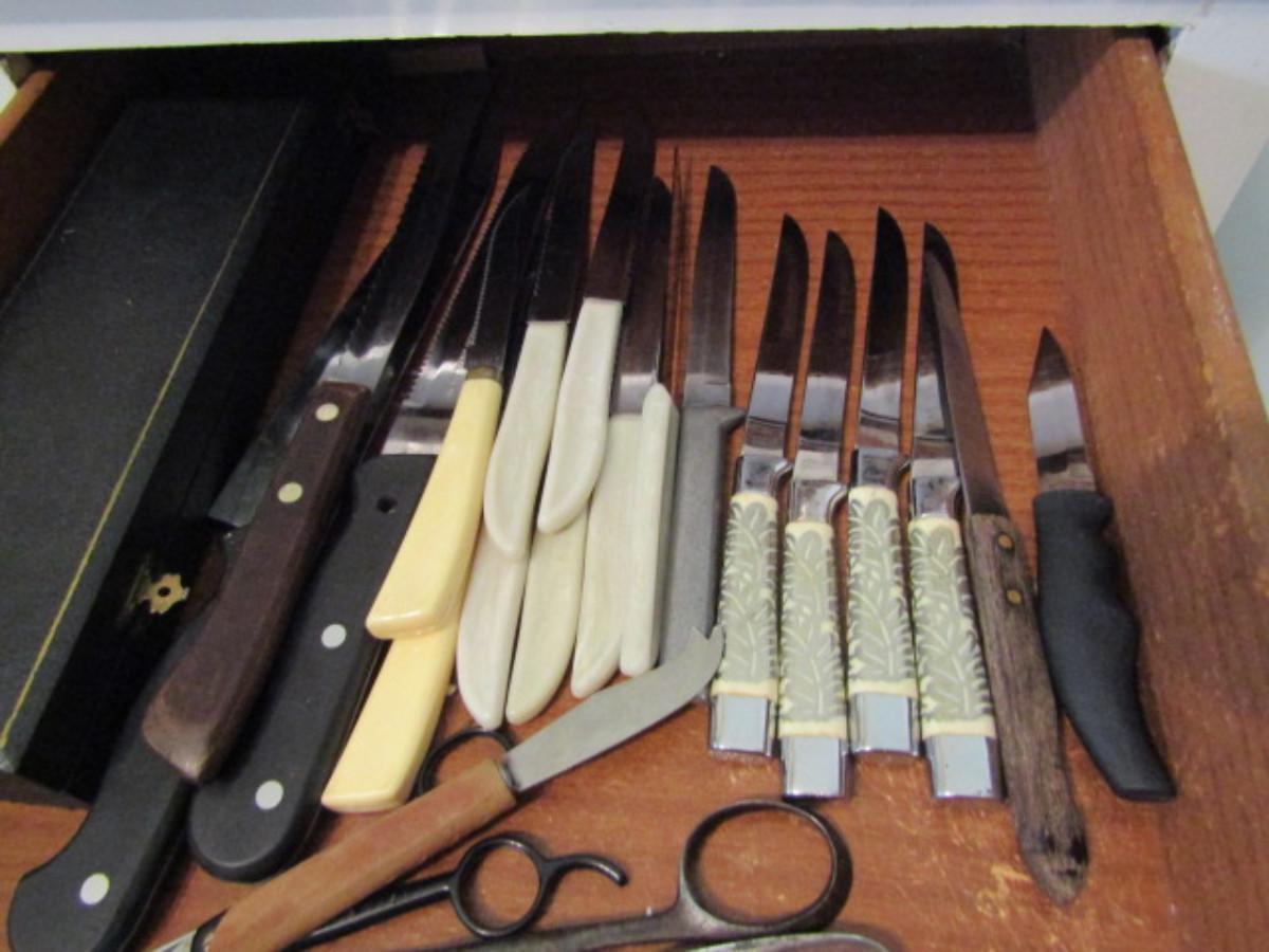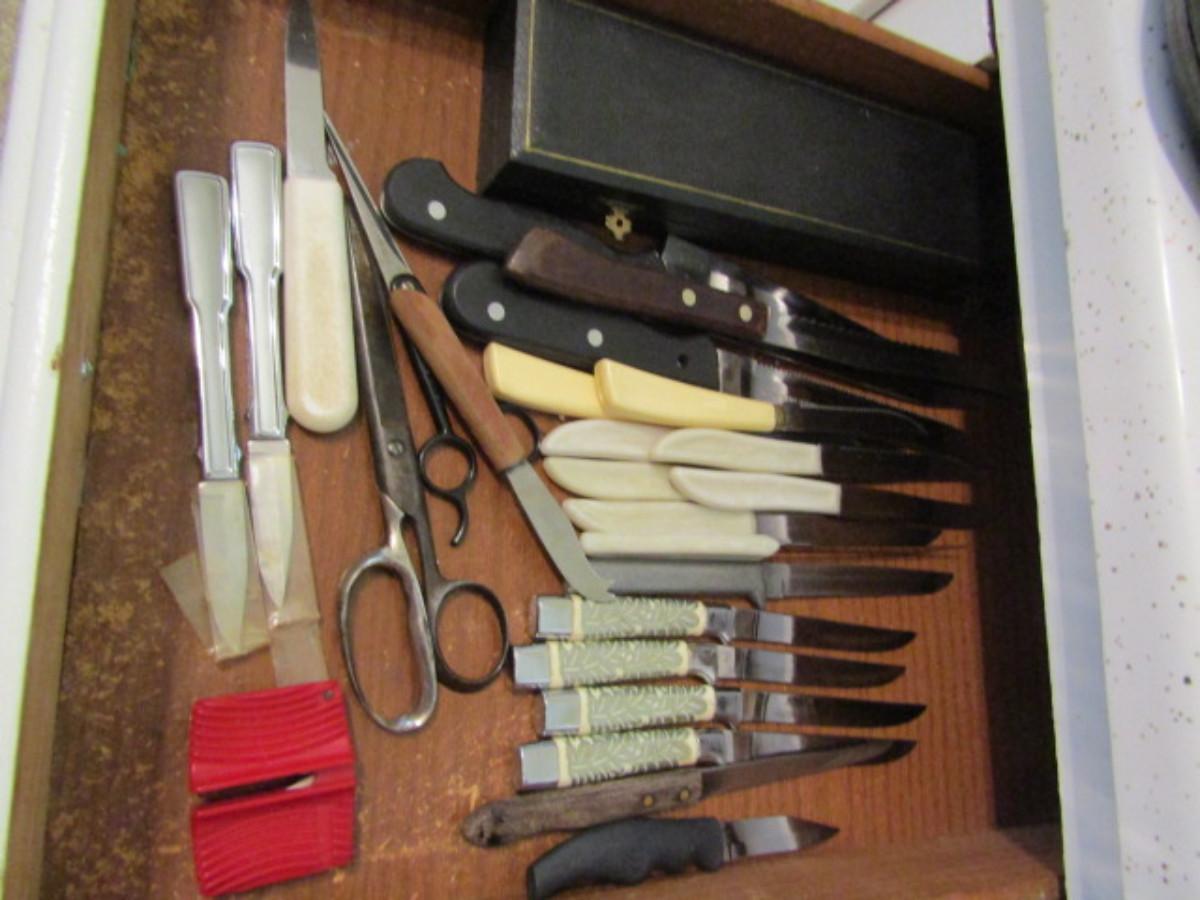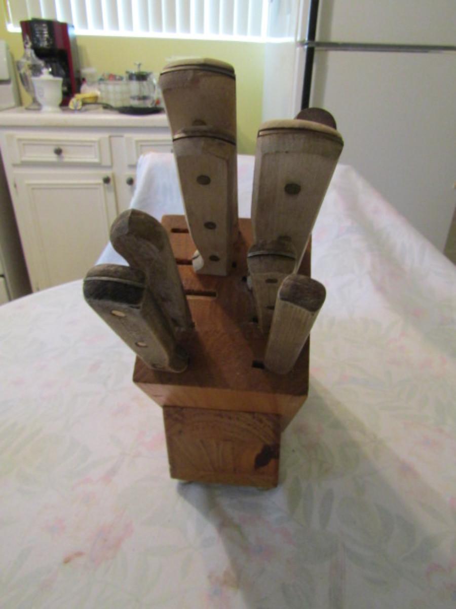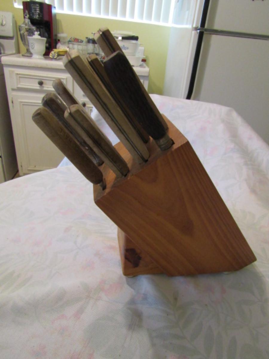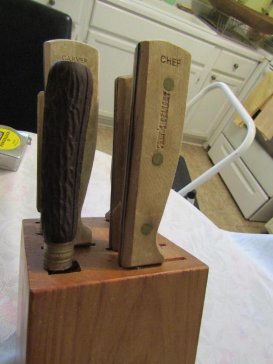 Assorted Cutlery with Wooden Block. Makers include Waverly Edge, Carvel Hall, Chef's Delight, Durex. Please see all pictures.