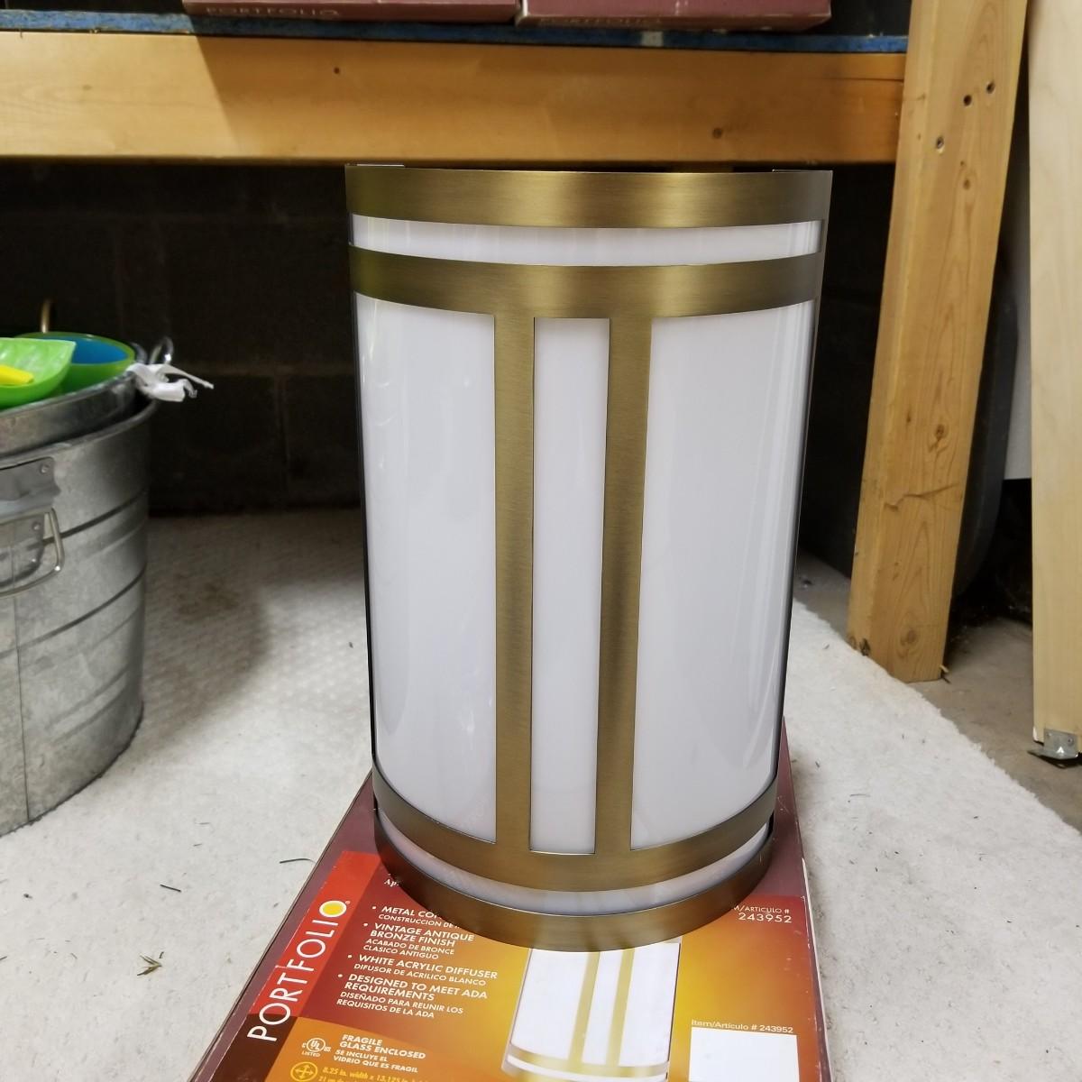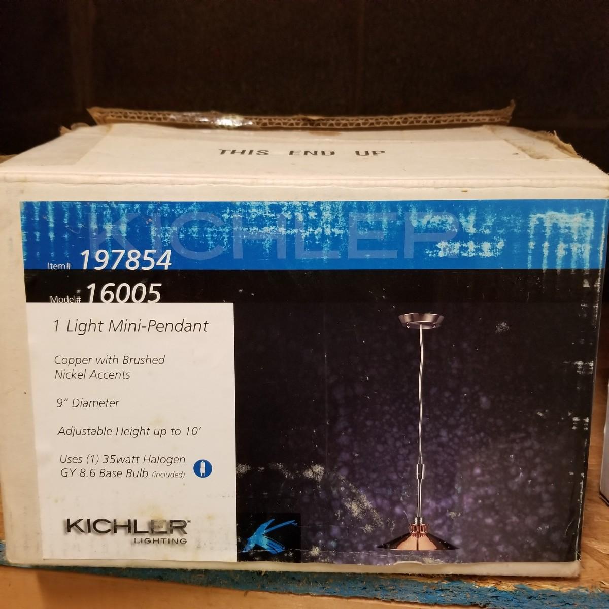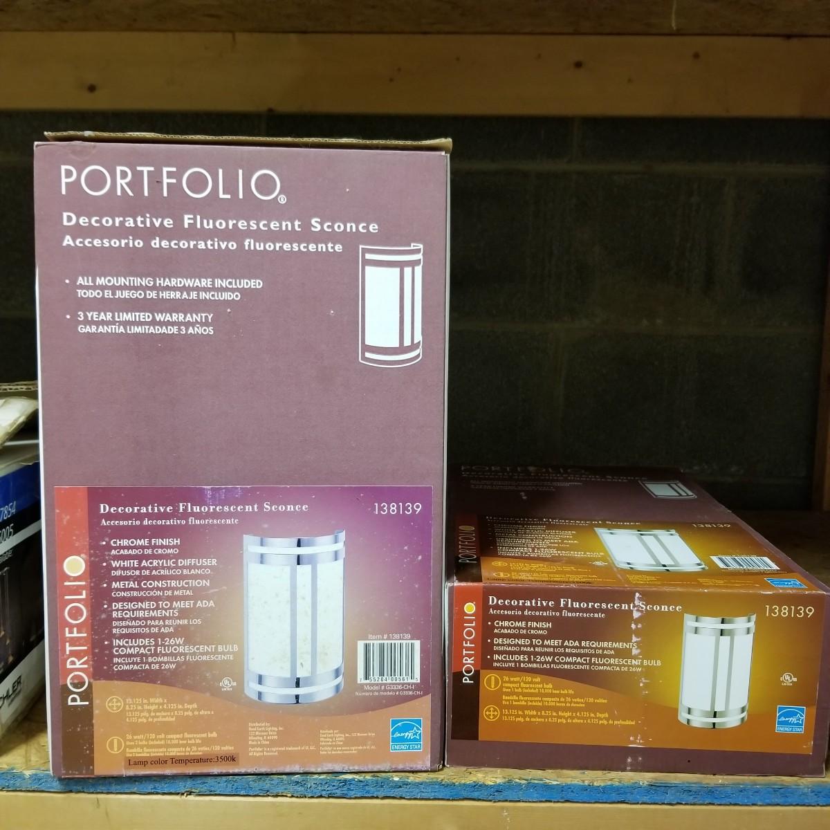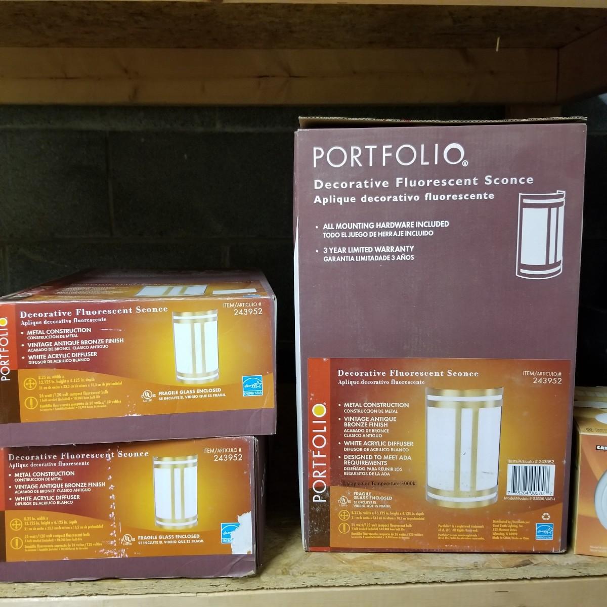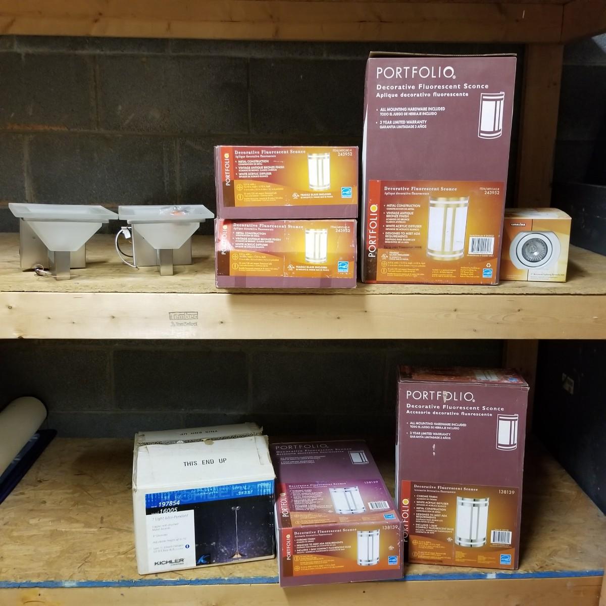 Nine decorative light fixtures, most new in box. Five Portfolio sconces: two in chrome and three in antique bronze finish. All five measure 8.25" x 4.125" x 13" each. One Kichler mini pendant with copper shade brushed with nickel accents, 9"d. We cannot verify if all parts are included. One Catalina recessed light remodel kit in white. And two brushed nickel wall sconces with frosted glass shades, no boxes, 8" x 6" x 5". See photos for details. Shipping available.