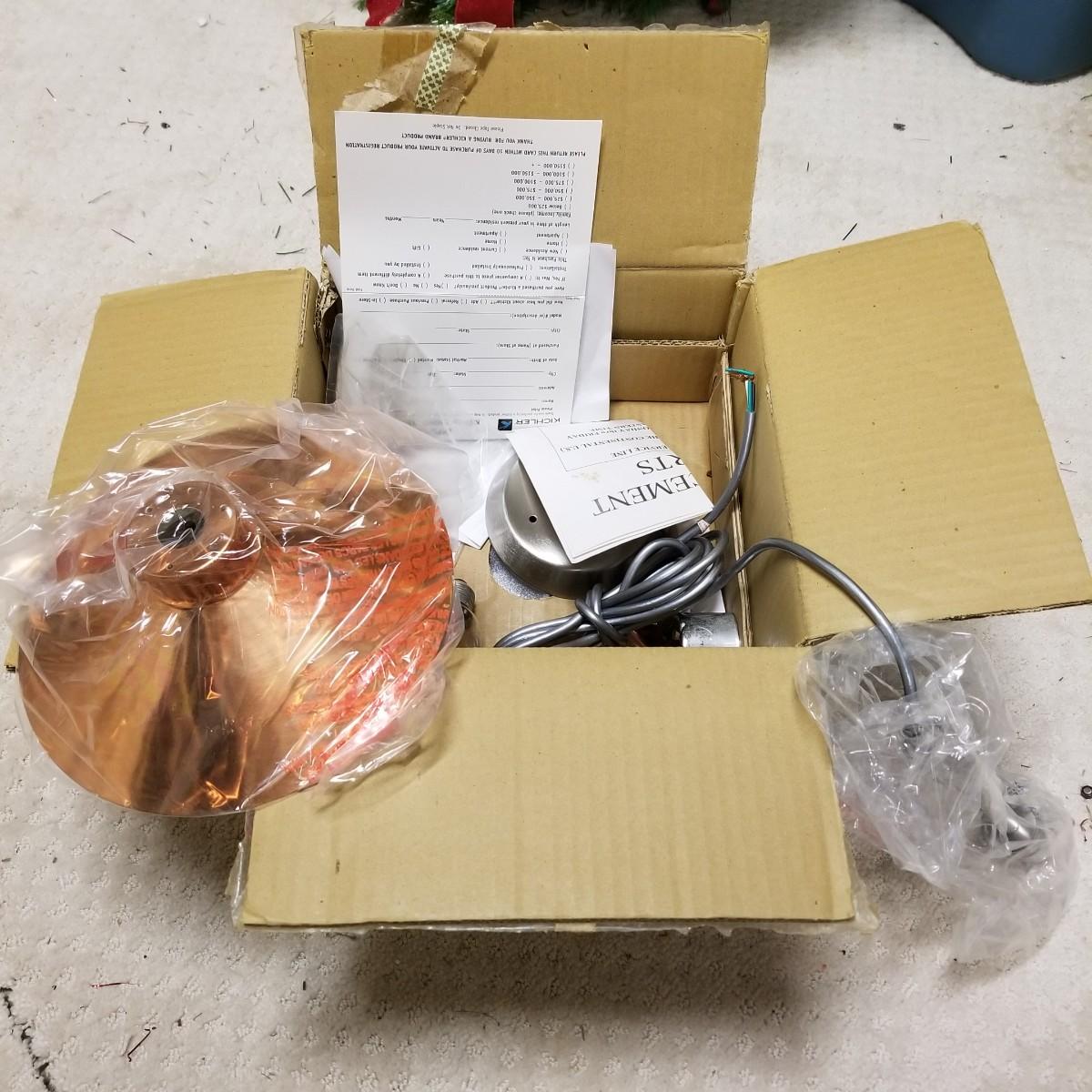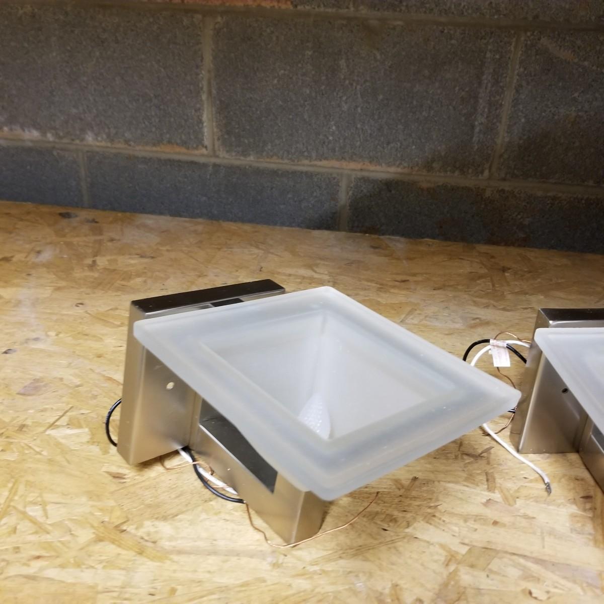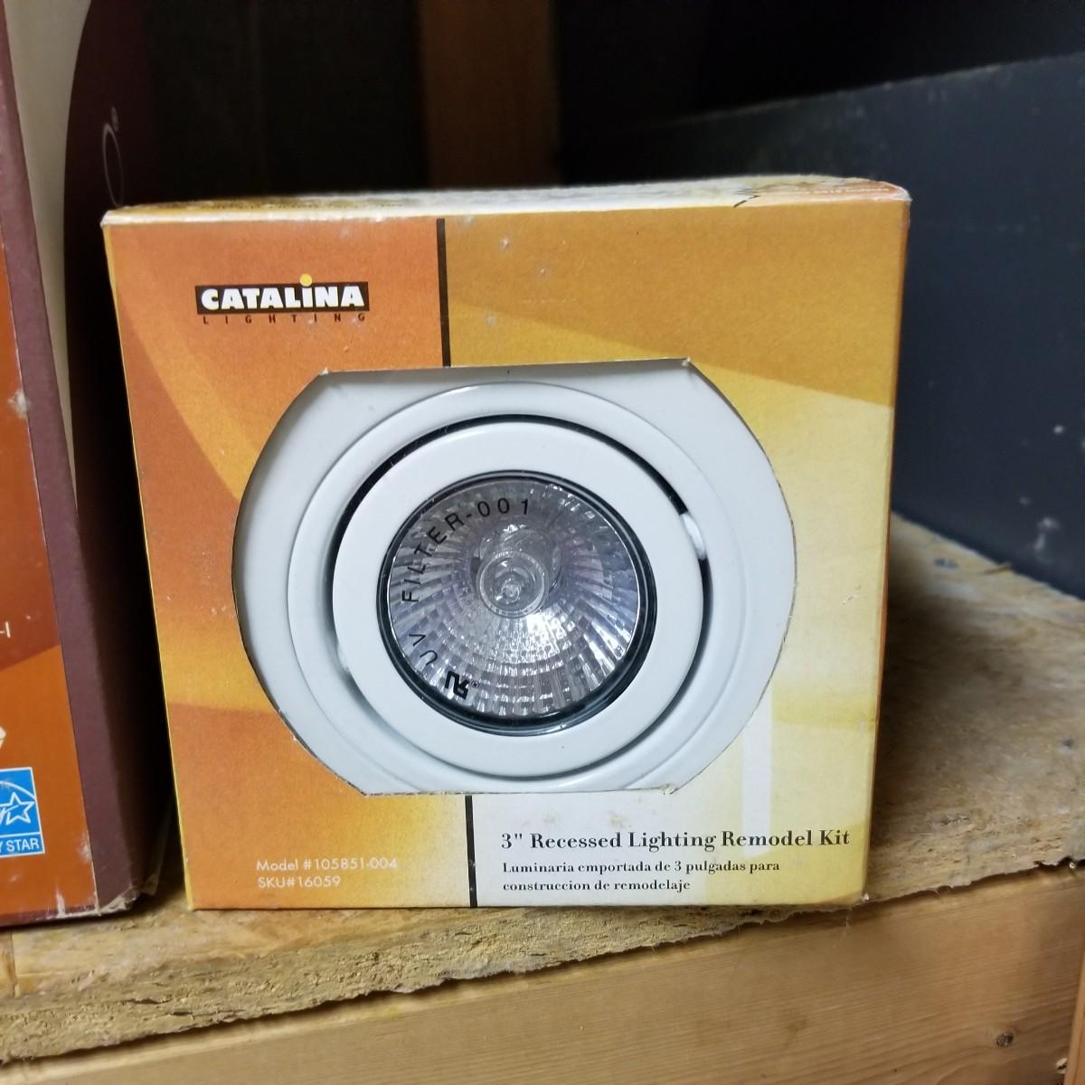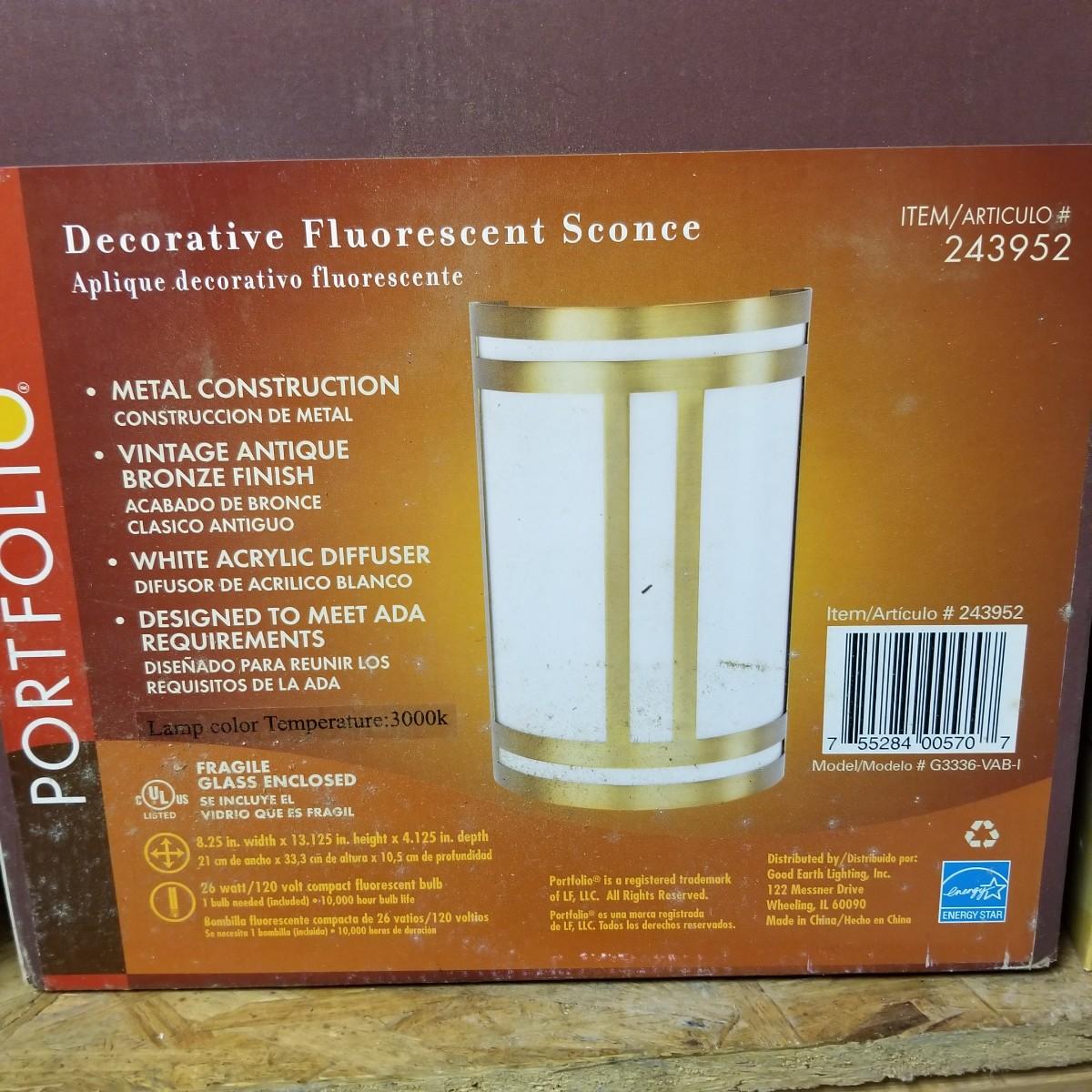 Nine decorative light fixtures, most new in box. Five Portfolio sconces: two in chrome and three in antique bronze finish. All five measure 8.25" x 4.125" x 13" each. One Kichler mini pendant with copper shade brushed with nickel accents, 9"d. We cannot verify if all parts are included. One Catalina recessed light remodel kit in white. And two brushed nickel wall sconces with frosted glass shades, no boxes, 8" x 6" x 5". See photos for details. Shipping available.