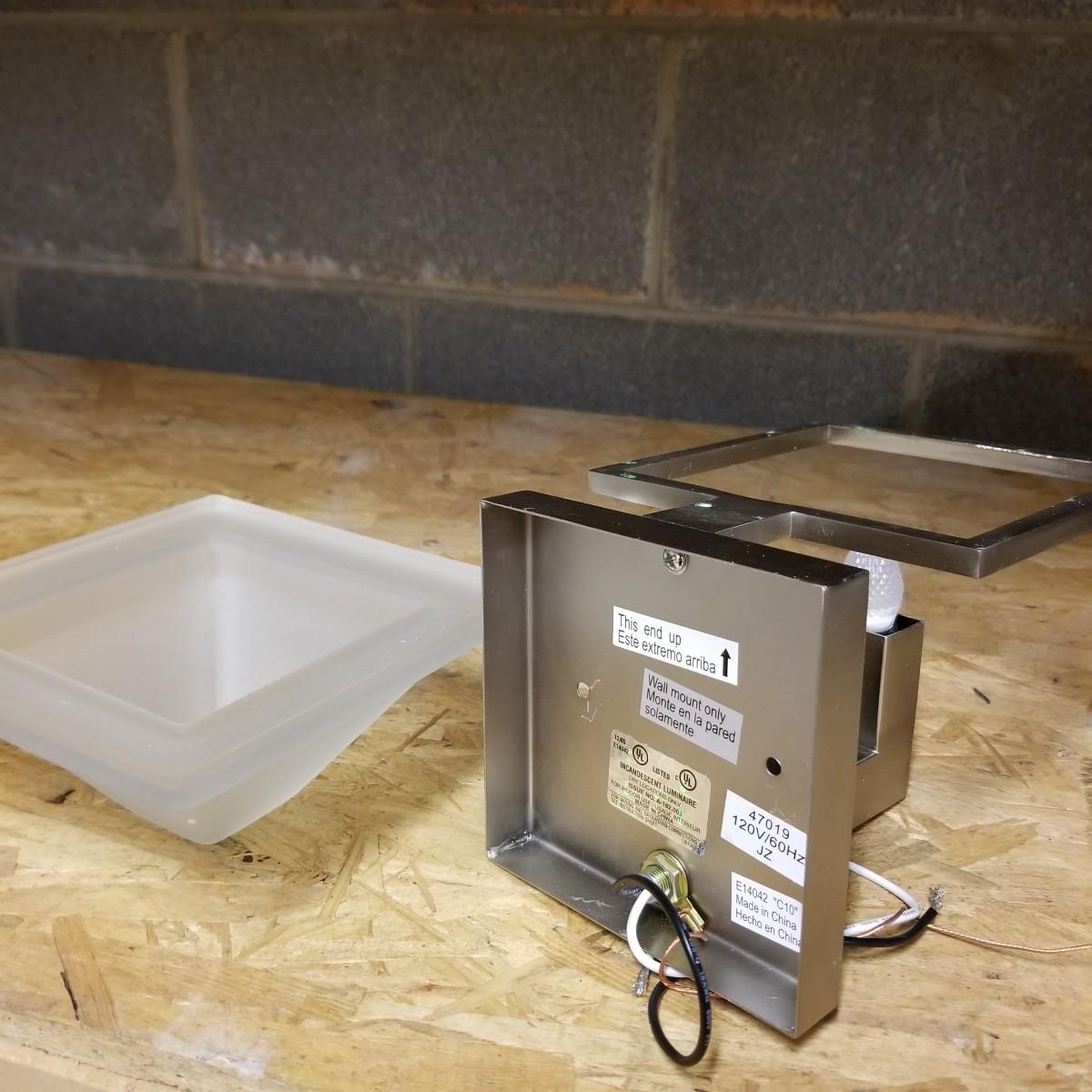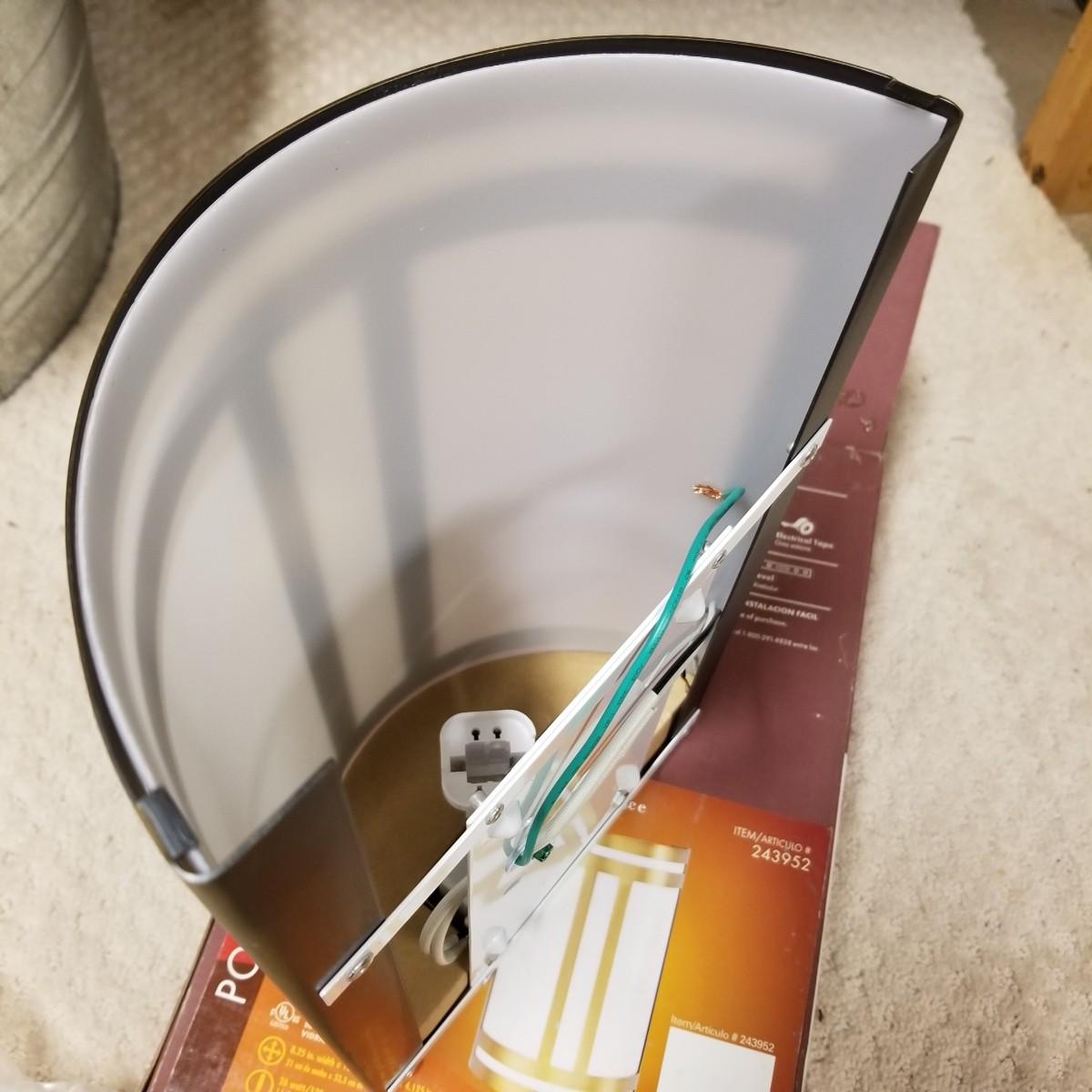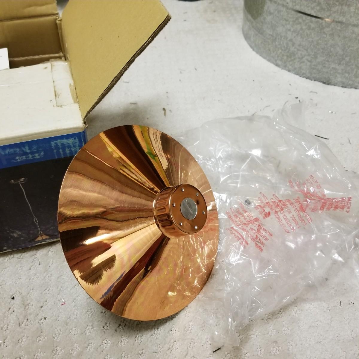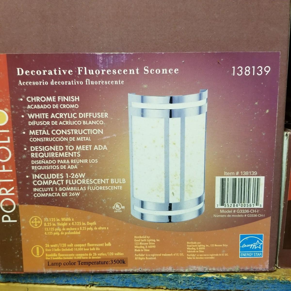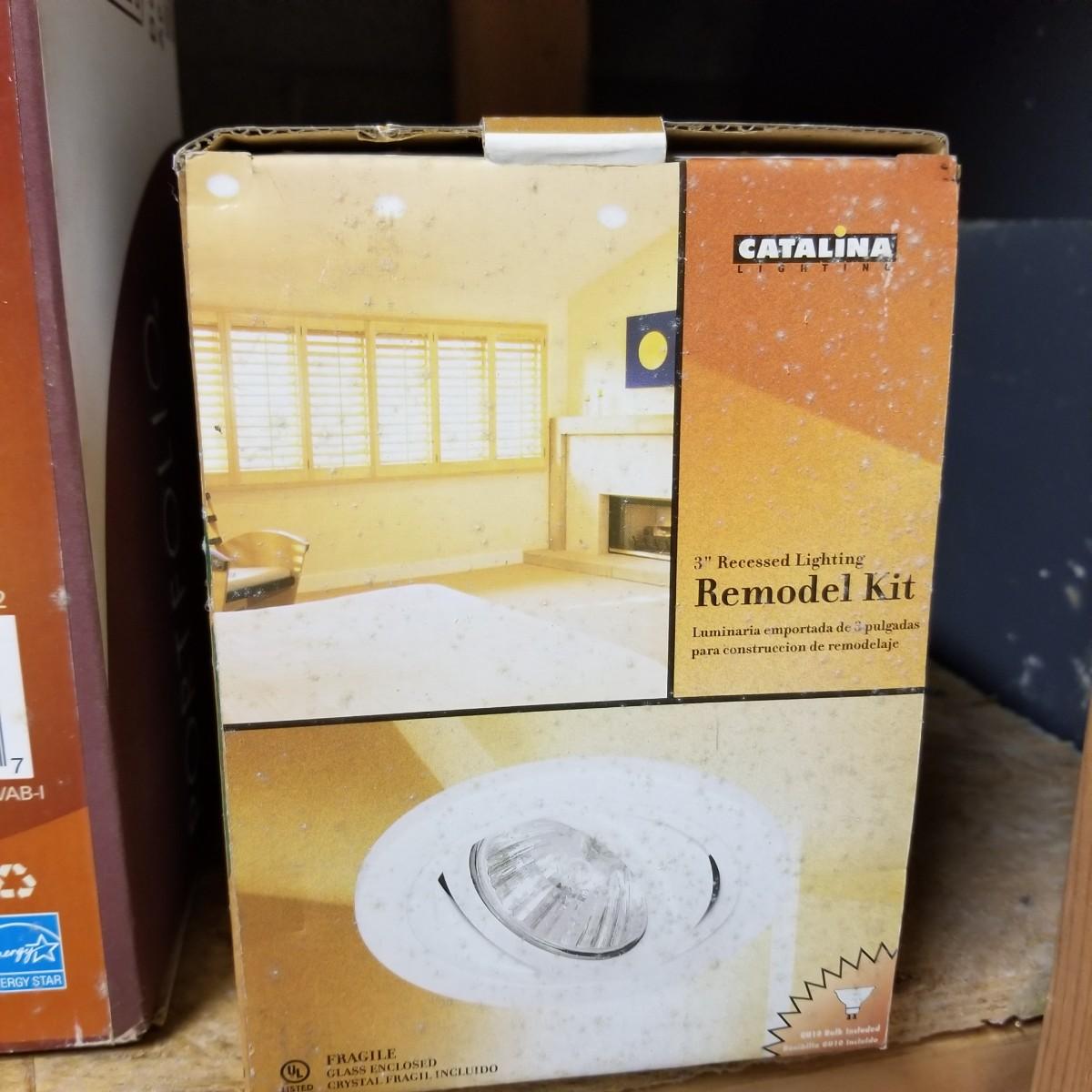 Nine decorative light fixtures, most new in box. Five Portfolio sconces: two in chrome and three in antique bronze finish. All five measure 8.25" x 4.125" x 13" each. One Kichler mini pendant with copper shade brushed with nickel accents, 9"d. We cannot verify if all parts are included. One Catalina recessed light remodel kit in white. And two brushed nickel wall sconces with frosted glass shades, no boxes, 8" x 6" x 5". See photos for details. Shipping available.