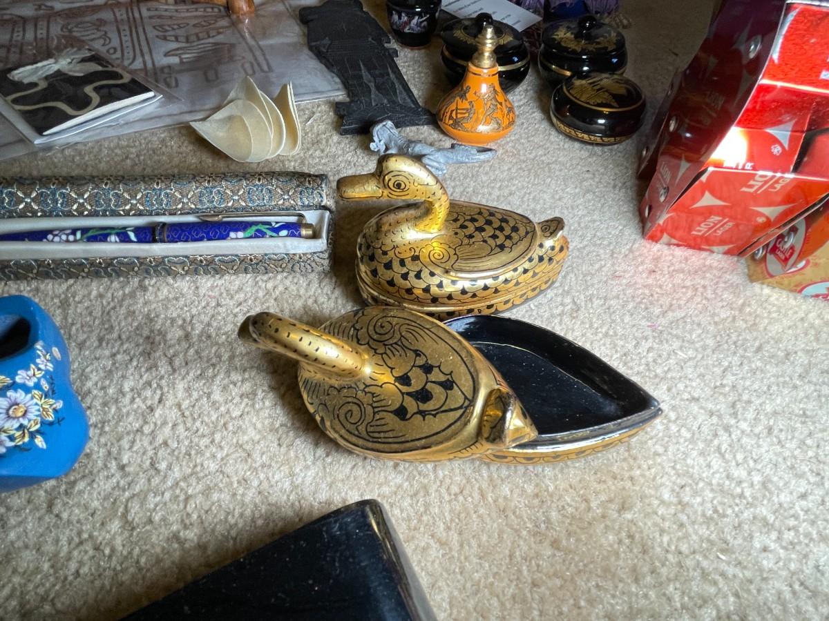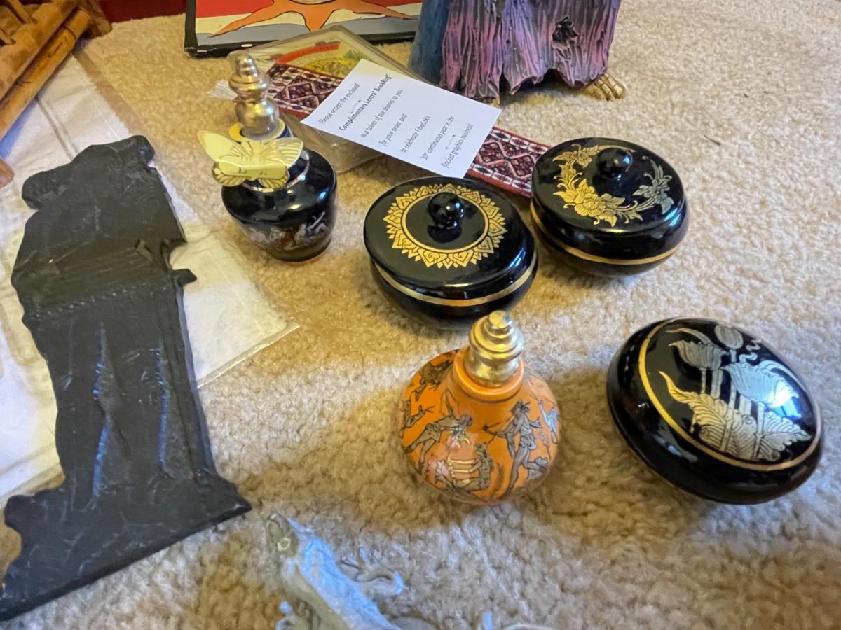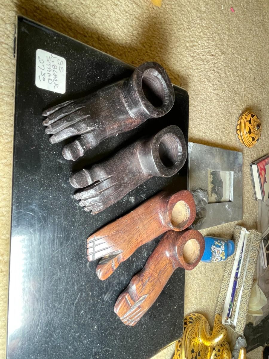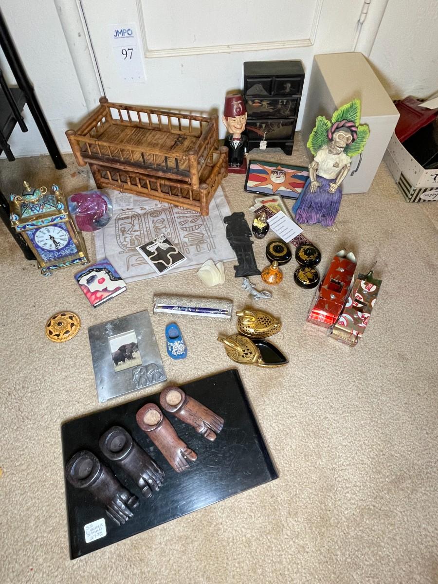Carved feet, Greek wooden boxes, tin banks, Day of the Dead figure. 2 bamboo trays. Small lacquer drawers. Assorted items as shown.