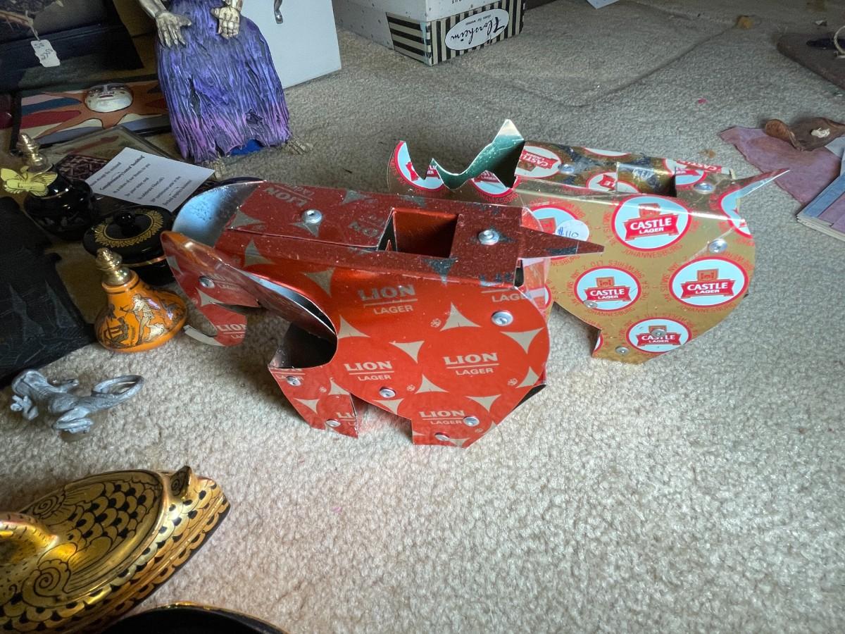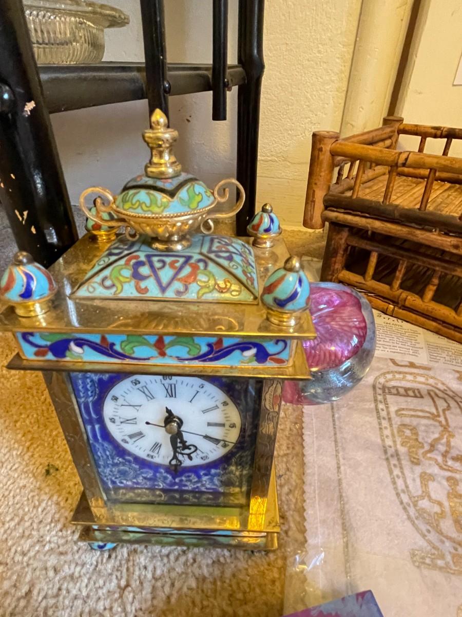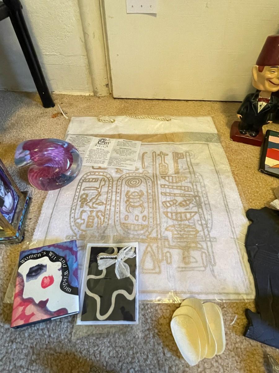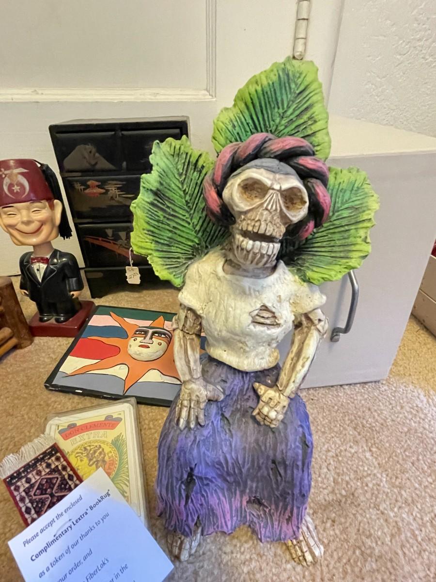 Carved feet, Greek wooden boxes, tin banks, Day of the Dead figure. 2 bamboo trays. Small lacquer drawers. Assorted items as shown.
