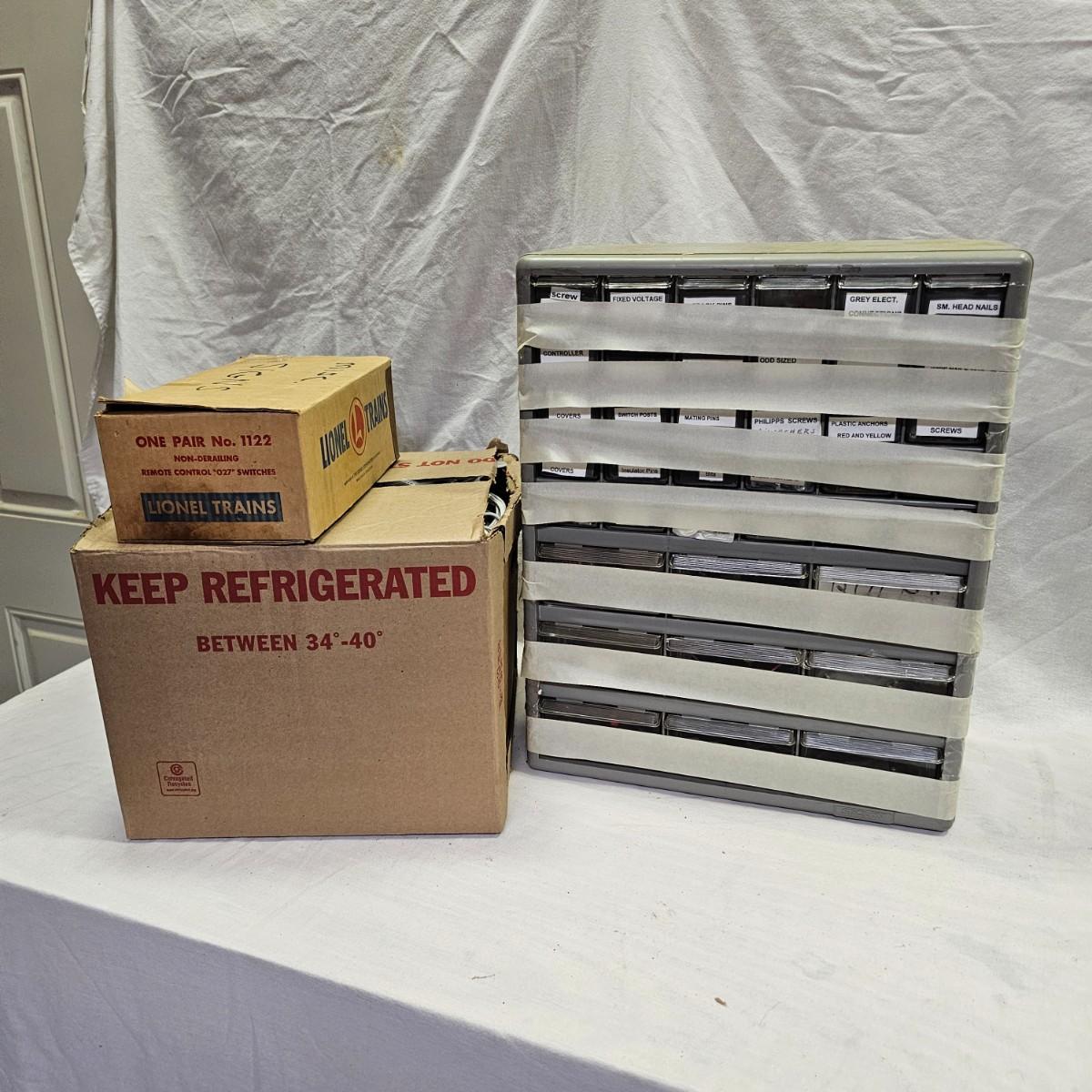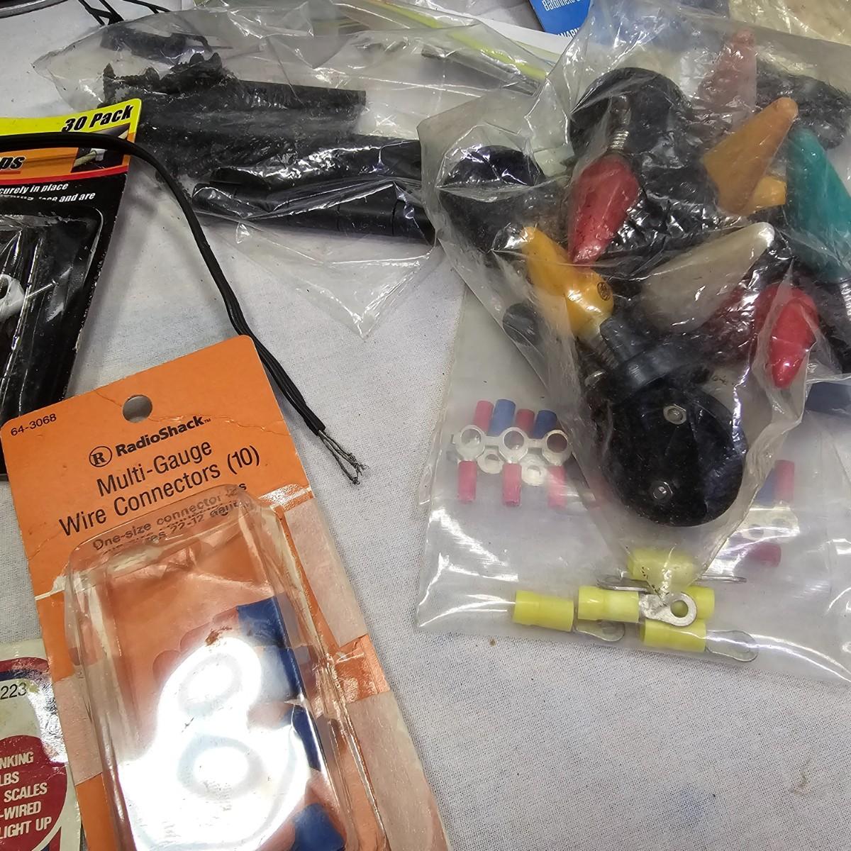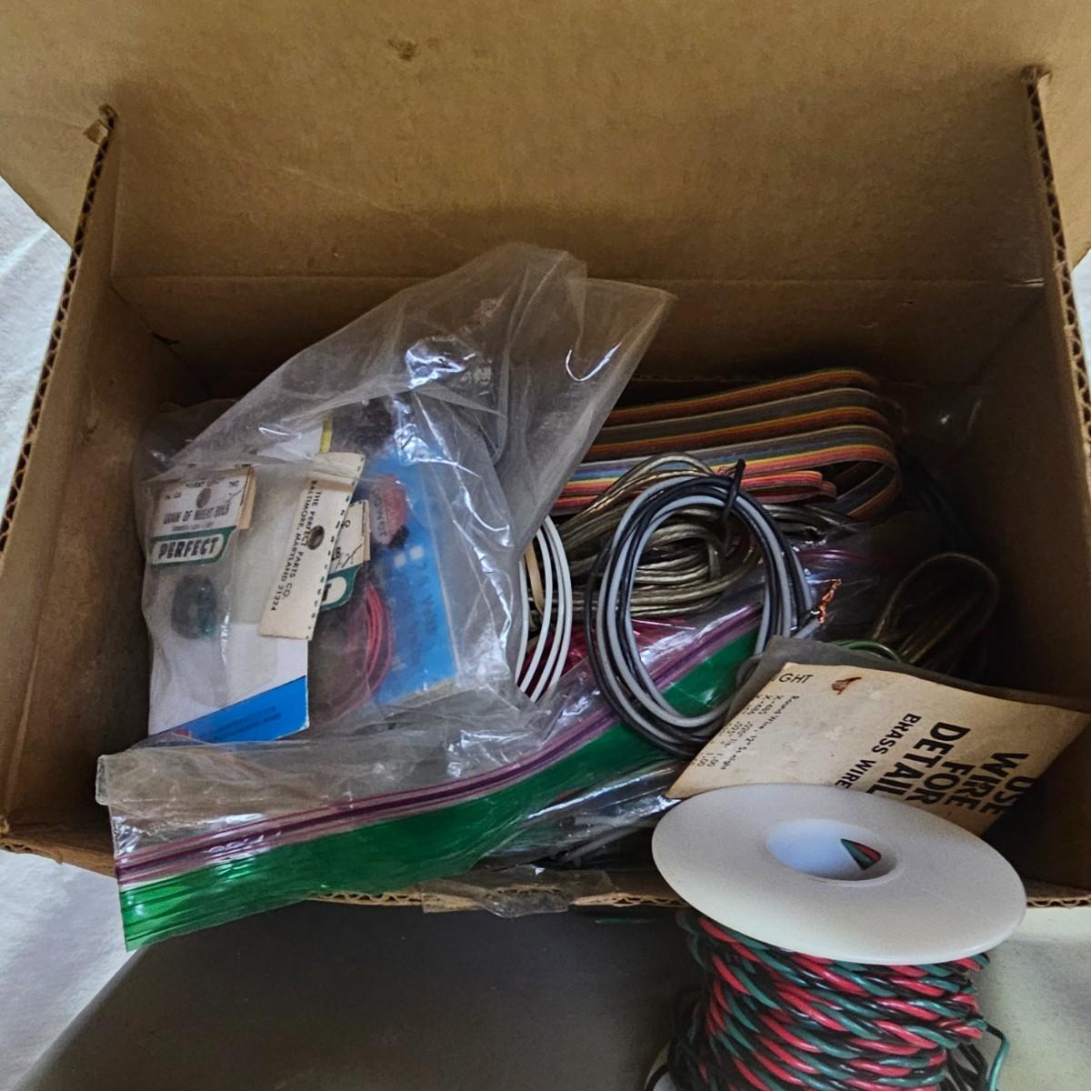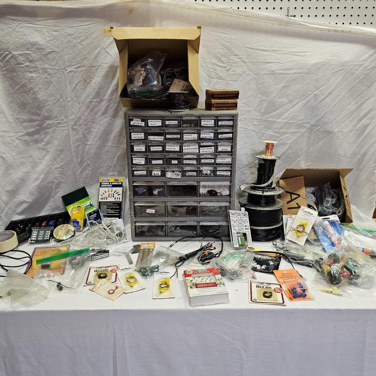 A little bit of everything. Screws, terminal strips, spools of wire, connectors, mini bulbs and more. Two boxes full and a set of pull out drawers that has screws, pins, nails, etc. Drawer units measures 15" x 6.5" x 18"H. See photos for details. Local pickup only. Please note that any price tag seen on an item was not put there by Sterling Transitions and does not reflect the current value of the item.