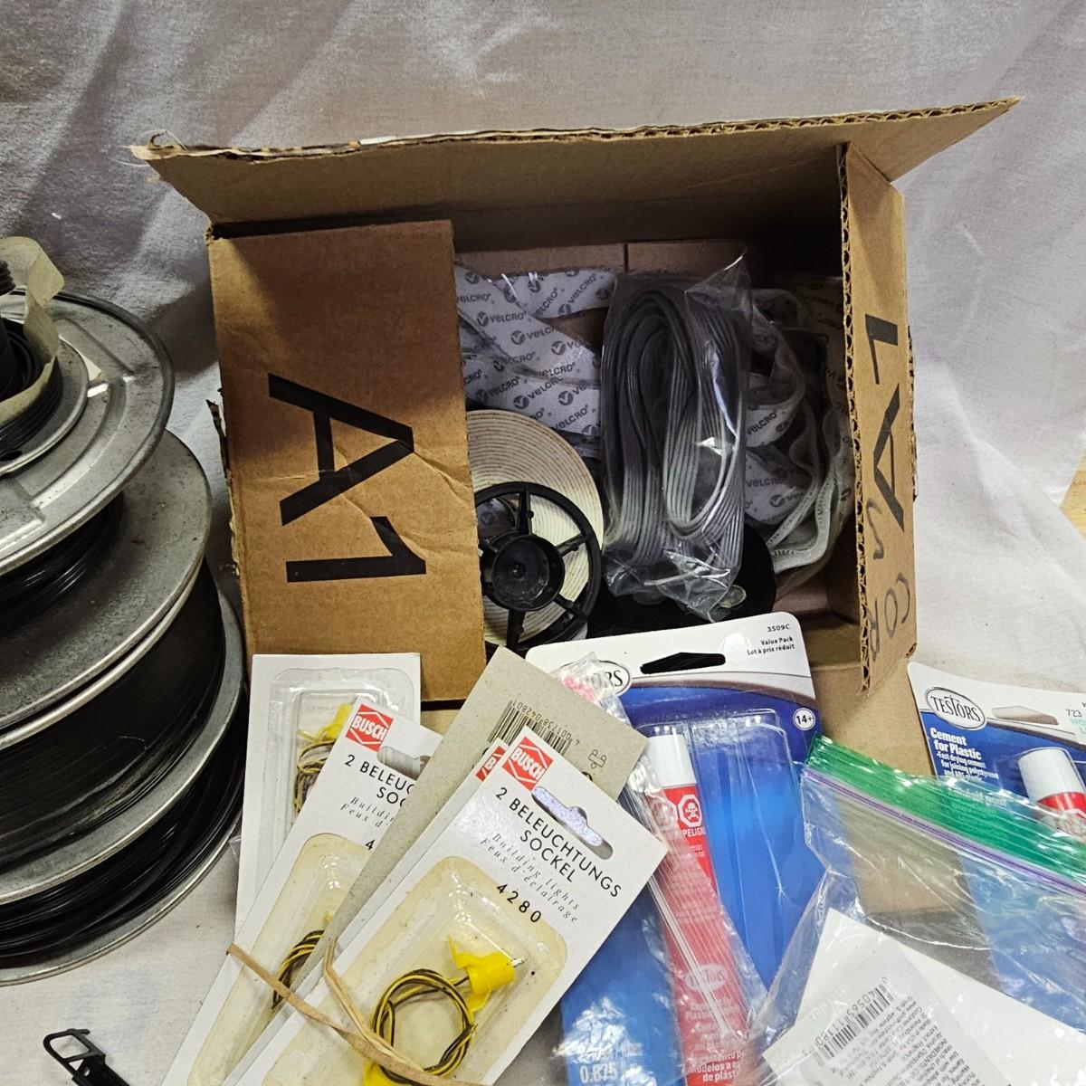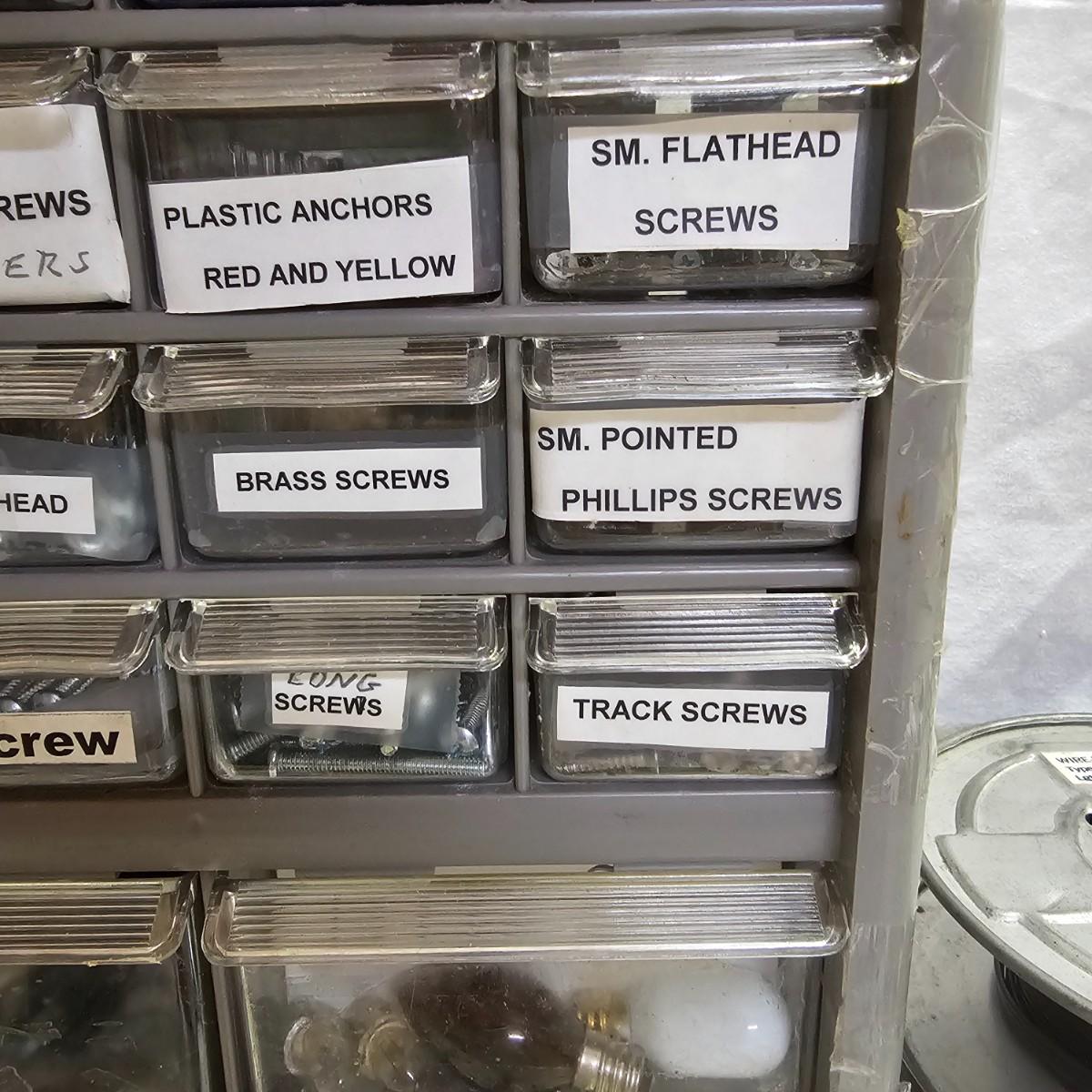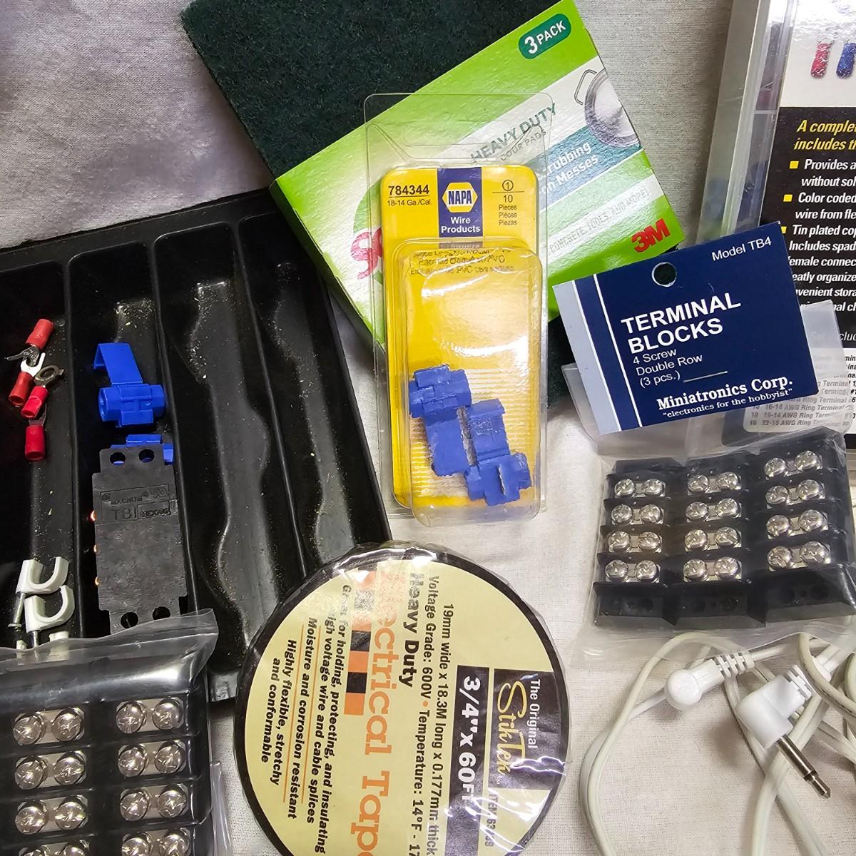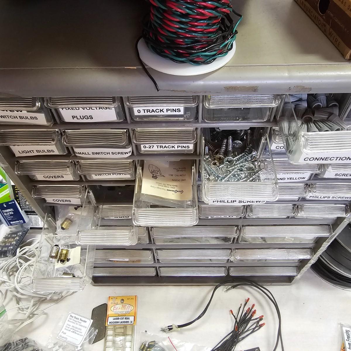 A little bit of everything. Screws, terminal strips, spools of wire, connectors, mini bulbs and more. Two boxes full and a set of pull out drawers that has screws, pins, nails, etc. Drawer units measures 15" x 6.5" x 18"H. See photos for details. Local pickup only. Please note that any price tag seen on an item was not put there by Sterling Transitions and does not reflect the current value of the item.