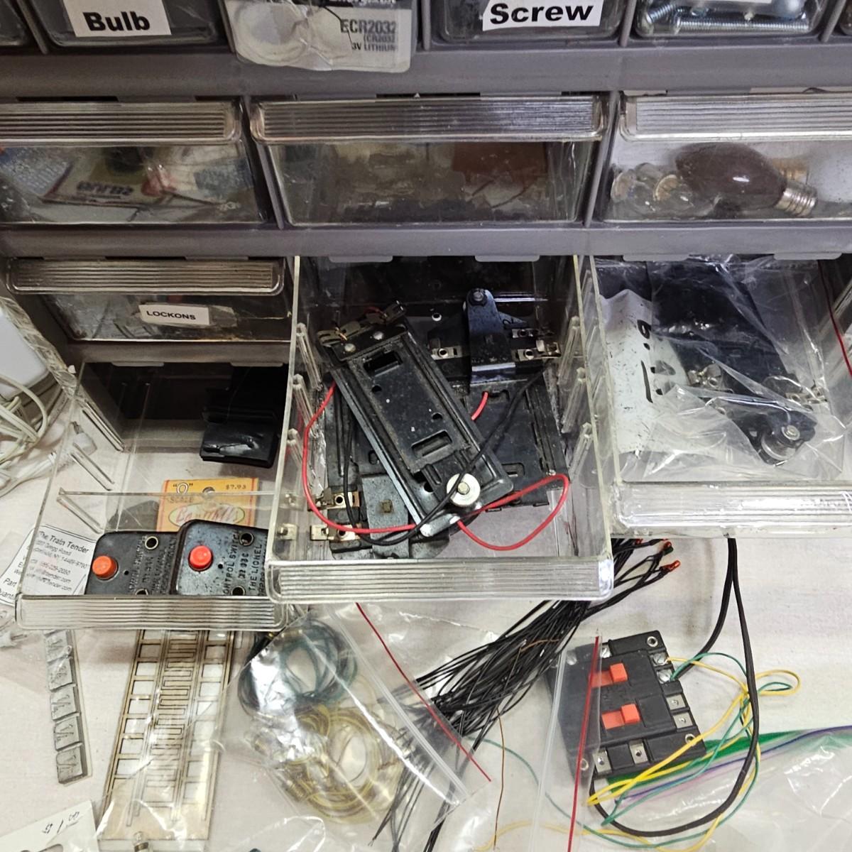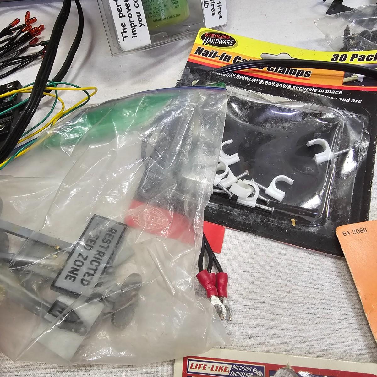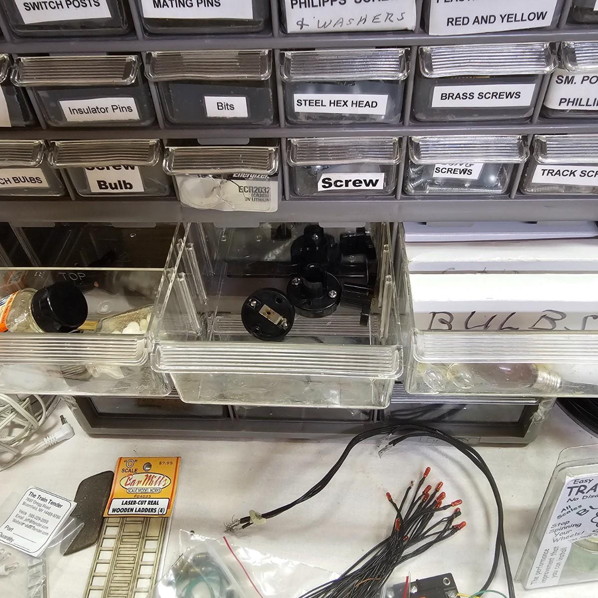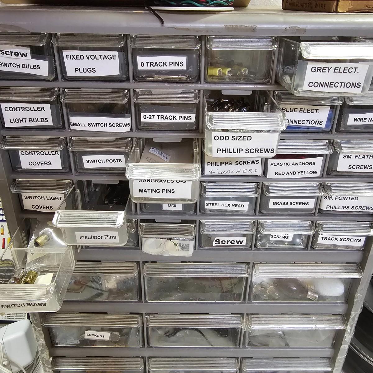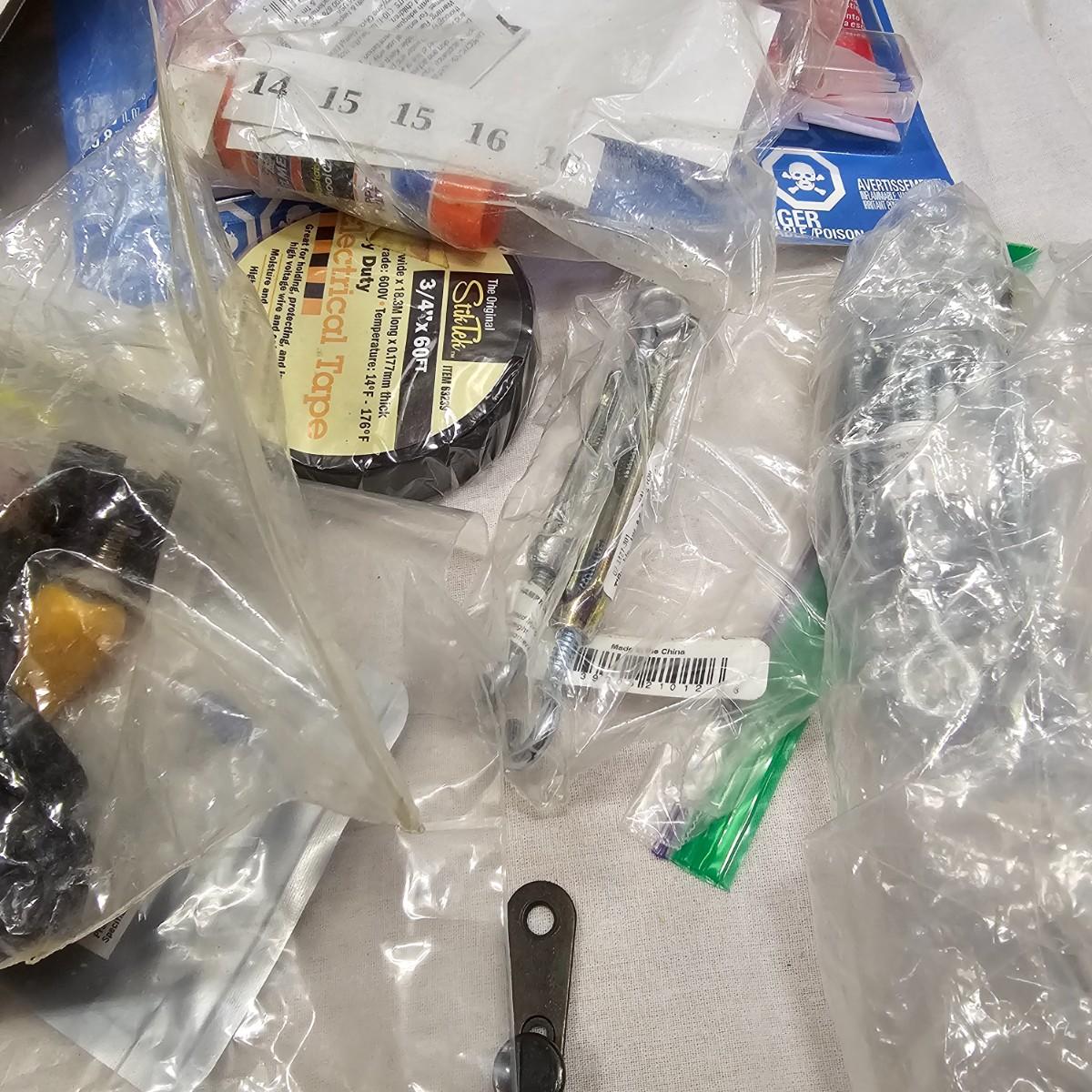 A little bit of everything. Screws, terminal strips, spools of wire, connectors, mini bulbs and more. Two boxes full and a set of pull out drawers that has screws, pins, nails, etc. Drawer units measures 15" x 6.5" x 18"H. See photos for details. Local pickup only. Please note that any price tag seen on an item was not put there by Sterling Transitions and does not reflect the current value of the item.