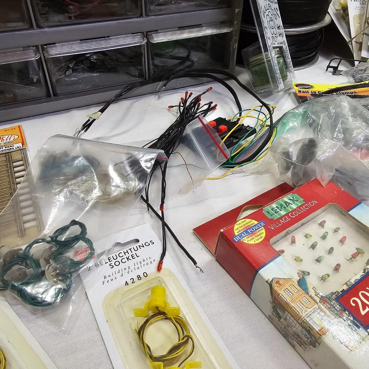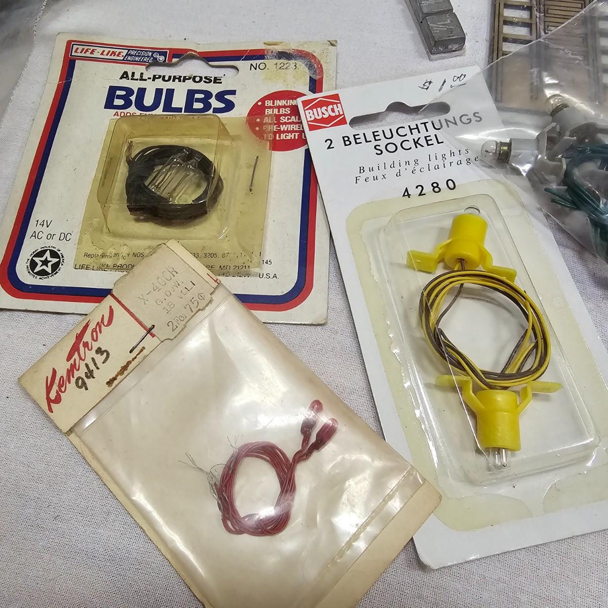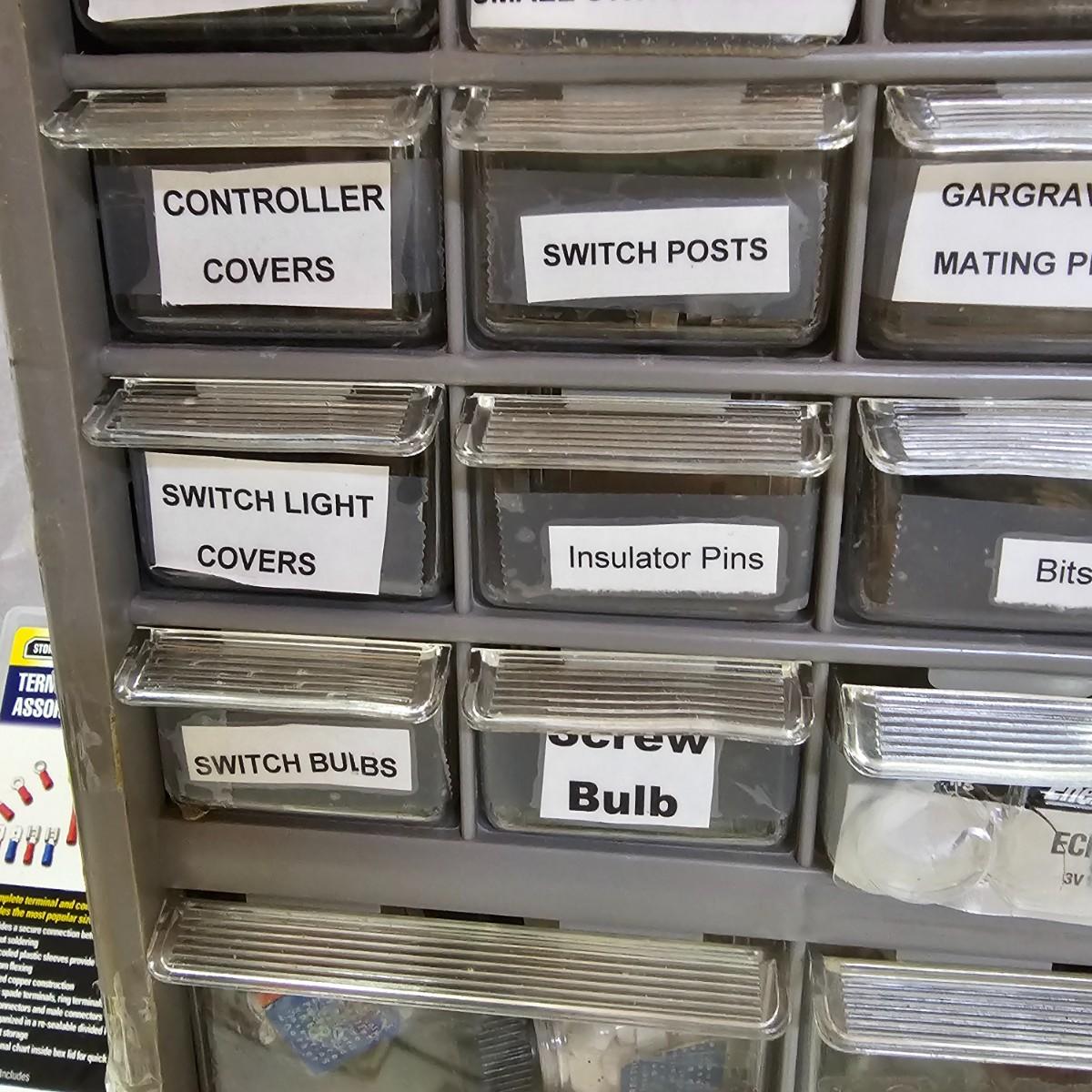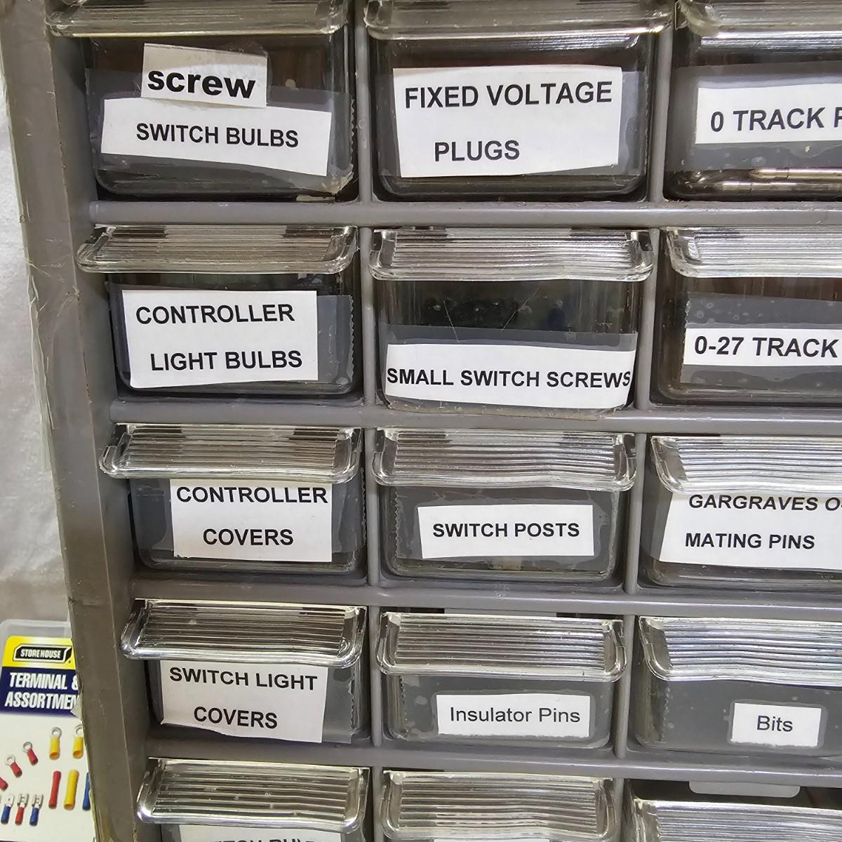 A little bit of everything. Screws, terminal strips, spools of wire, connectors, mini bulbs and more. Two boxes full and a set of pull out drawers that has screws, pins, nails, etc. Drawer units measures 15" x 6.5" x 18"H. See photos for details. Local pickup only. Please note that any price tag seen on an item was not put there by Sterling Transitions and does not reflect the current value of the item.