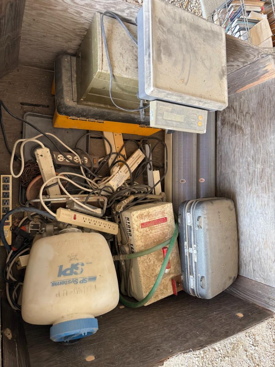 Mixed lot includes extension cords, testers, cases, and spray tank. Sold as-is. Great for DIY or parts.