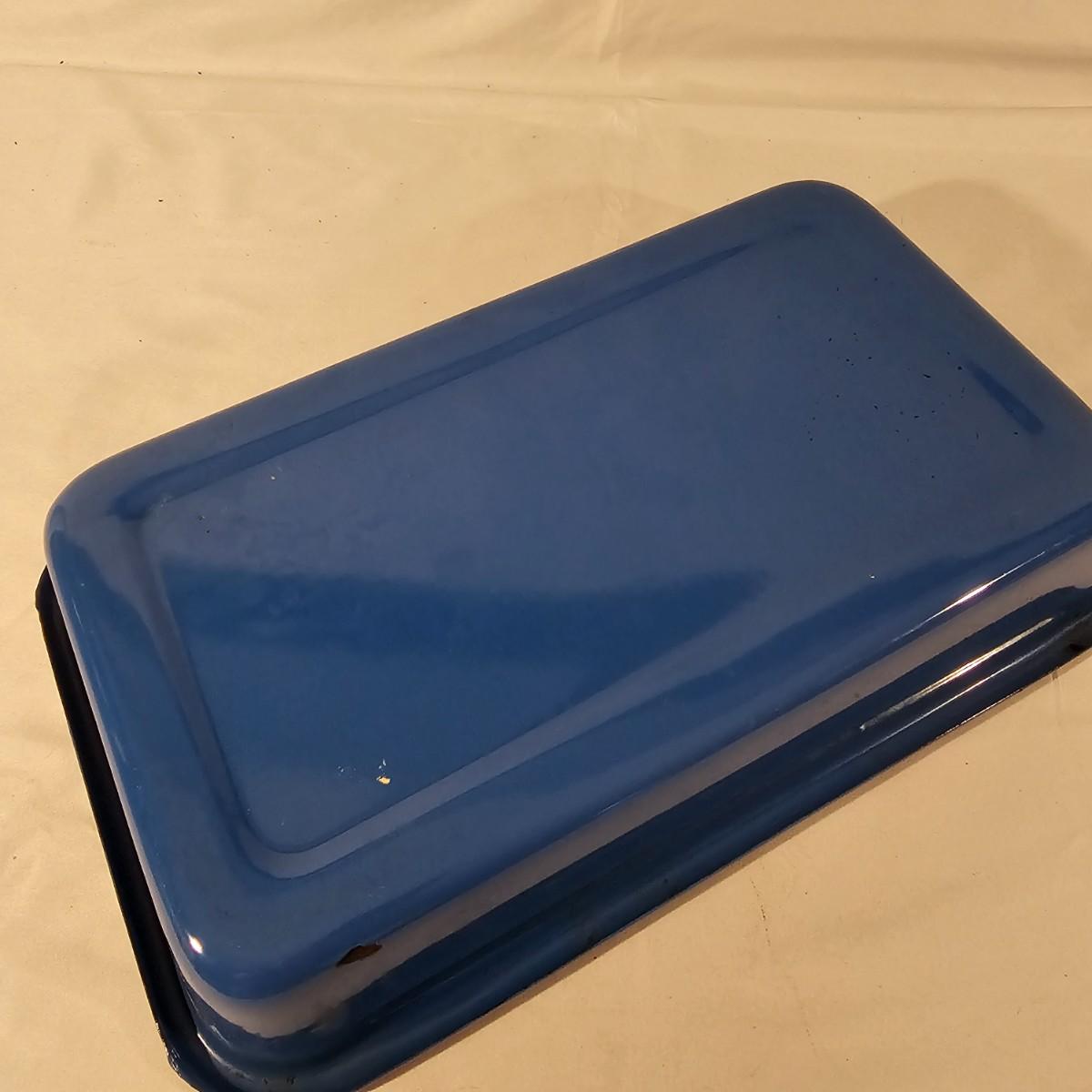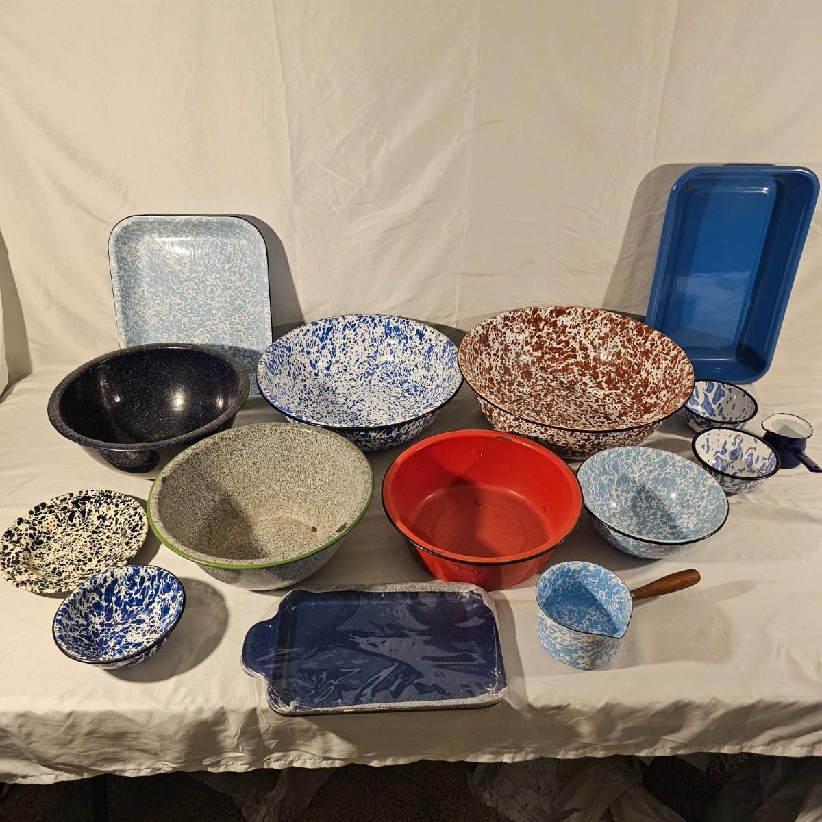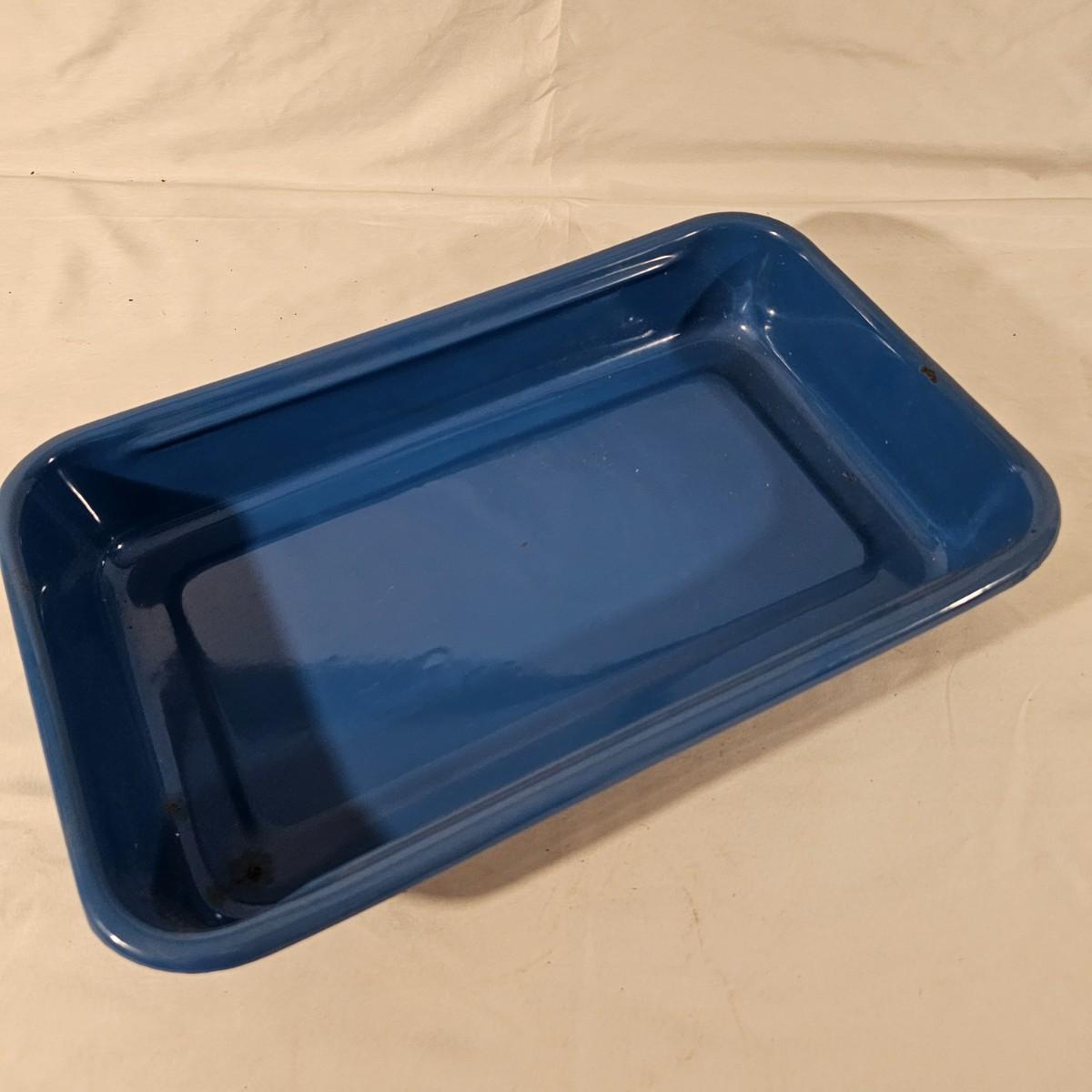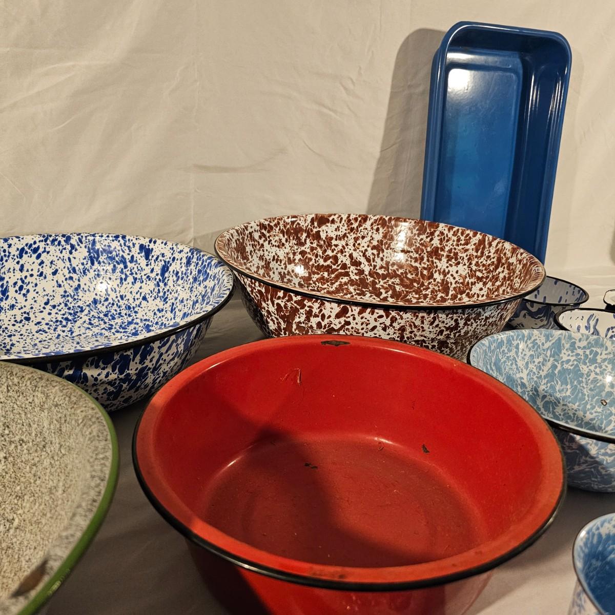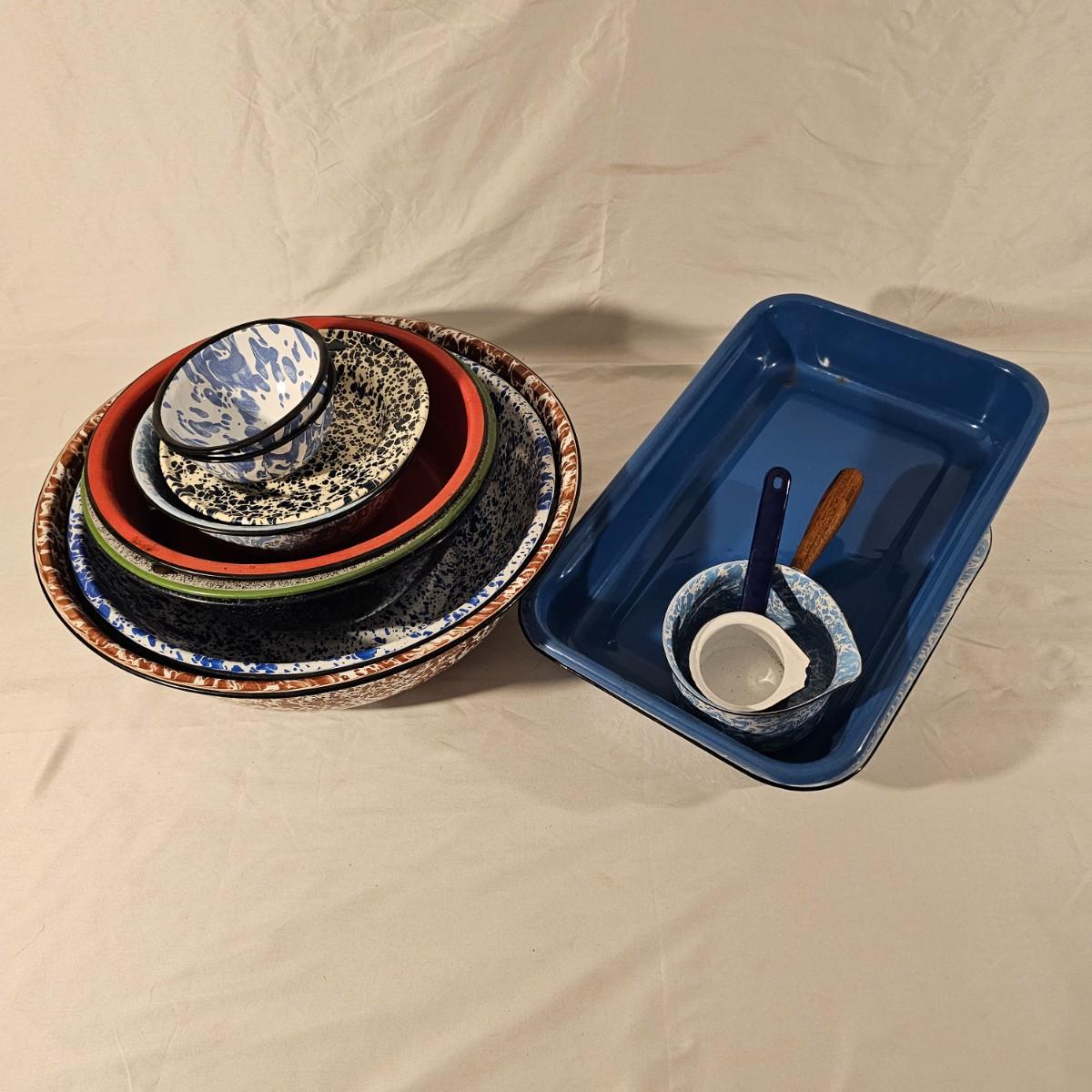 Various sizes of enameled steel ware for mixing, serving, and more. Large round brown bowl is 16"D x 5"H, blue one is 14.5"D x 4"H. Long blue rectangle pan is 16.5" x 10" x 2.5"H. Some used and some new items. See photos for details. Shipping available.