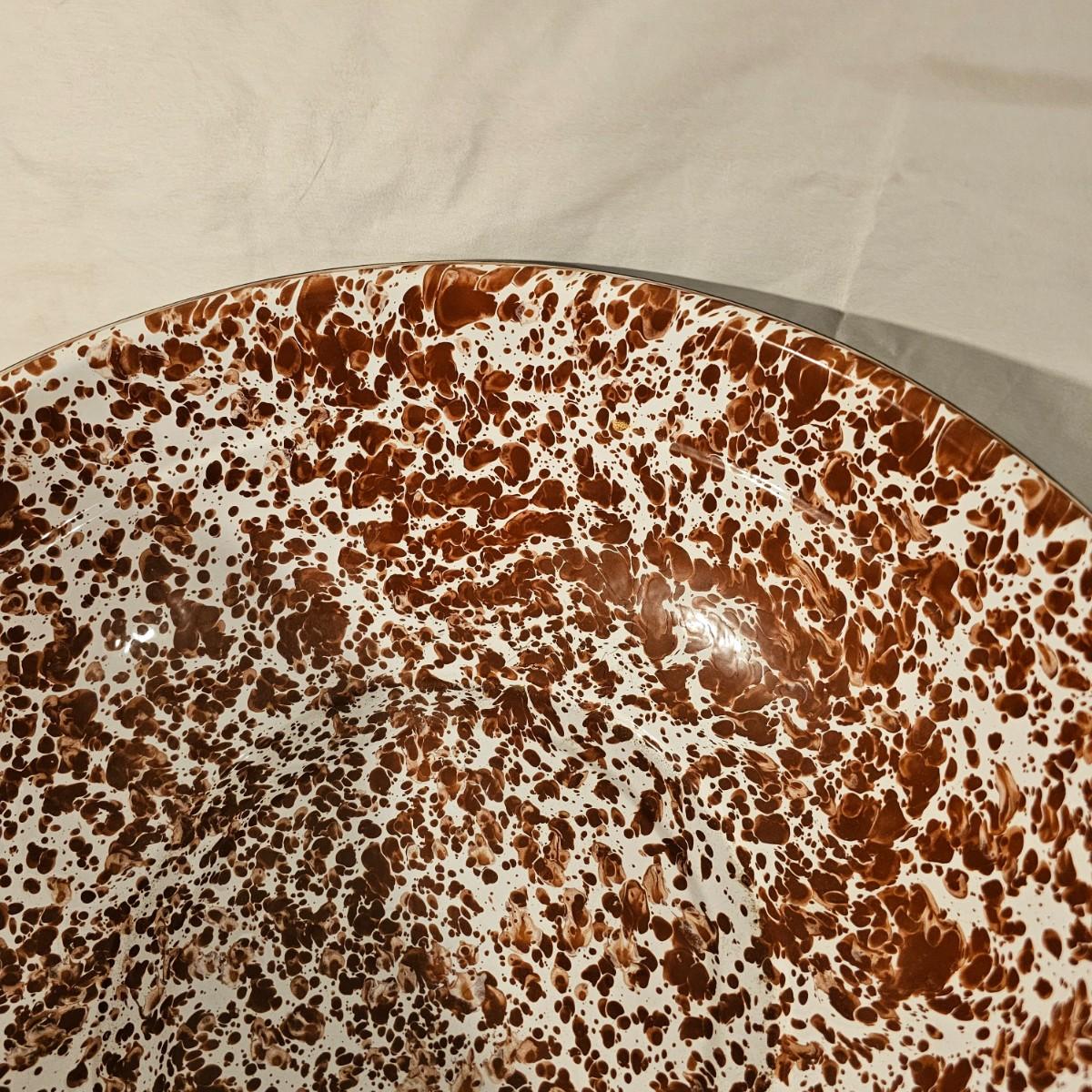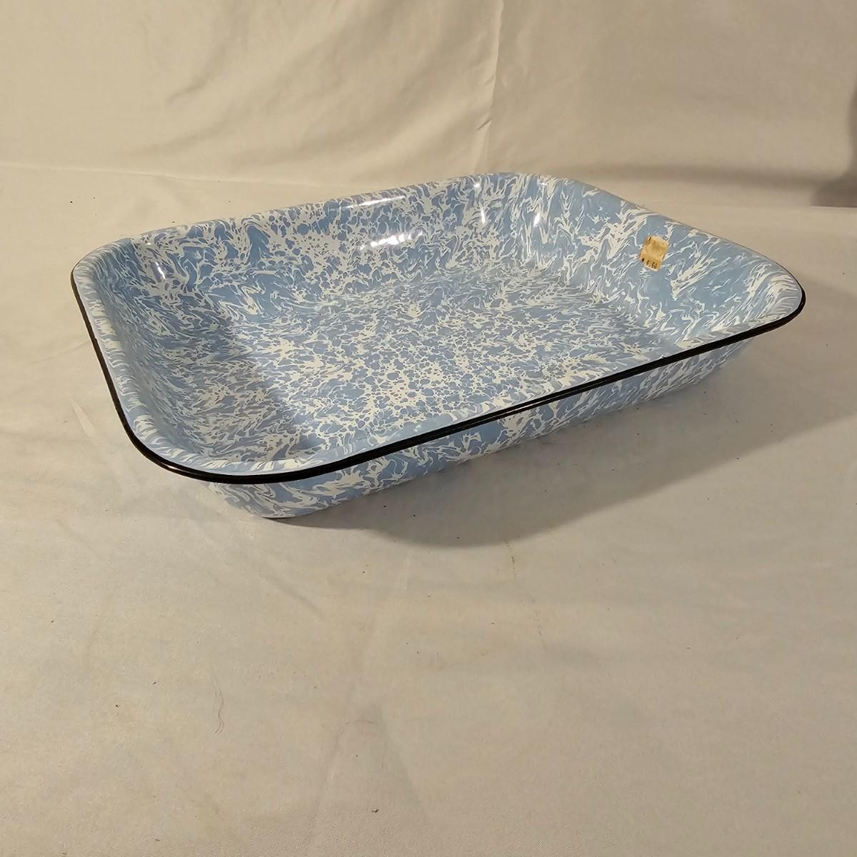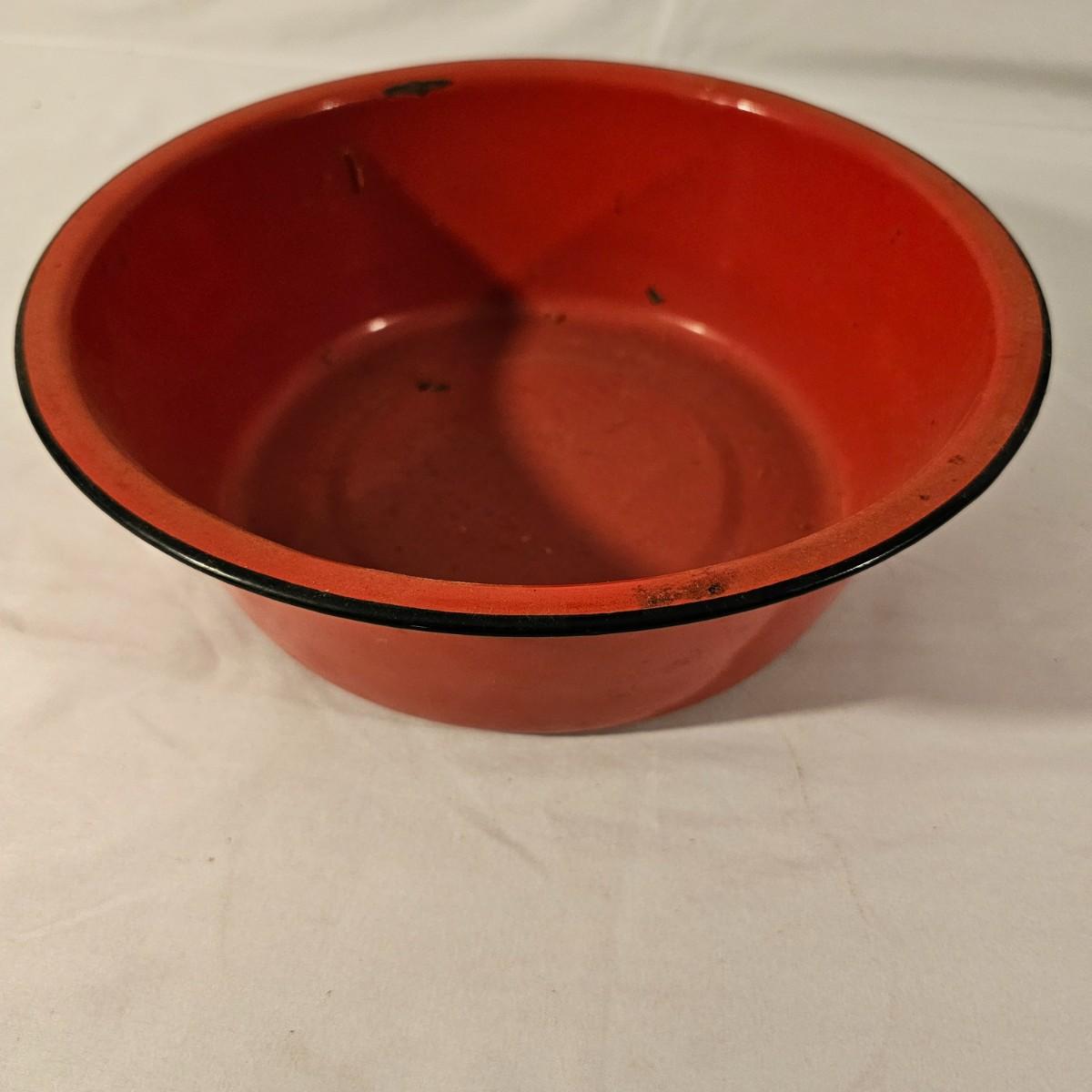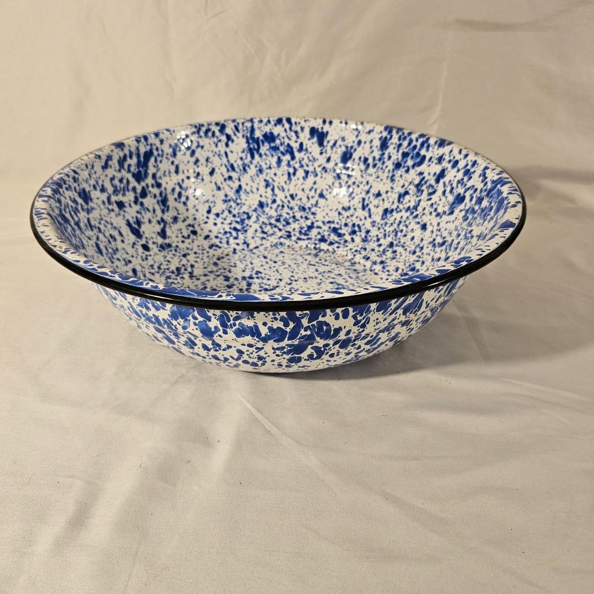 Various sizes of enameled steel ware for mixing, serving, and more. Large round brown bowl is 16"D x 5"H, blue one is 14.5"D x 4"H. Long blue rectangle pan is 16.5" x 10" x 2.5"H. Some used and some new items. See photos for details. Shipping available.