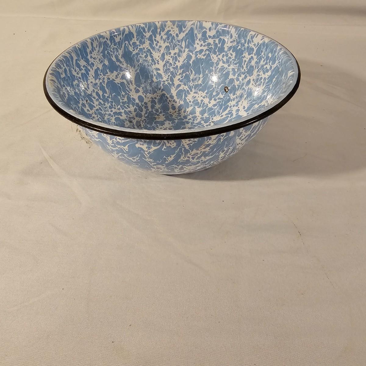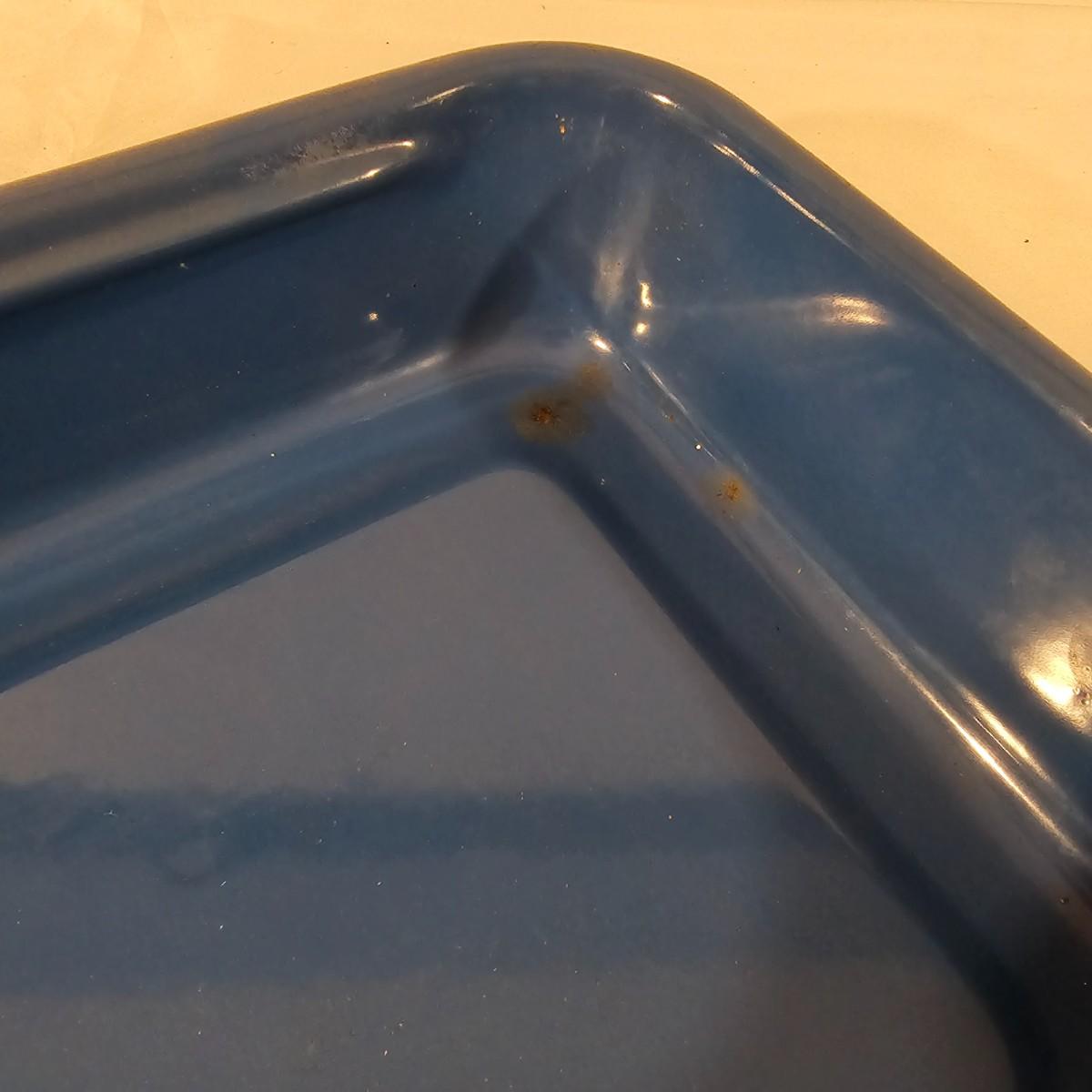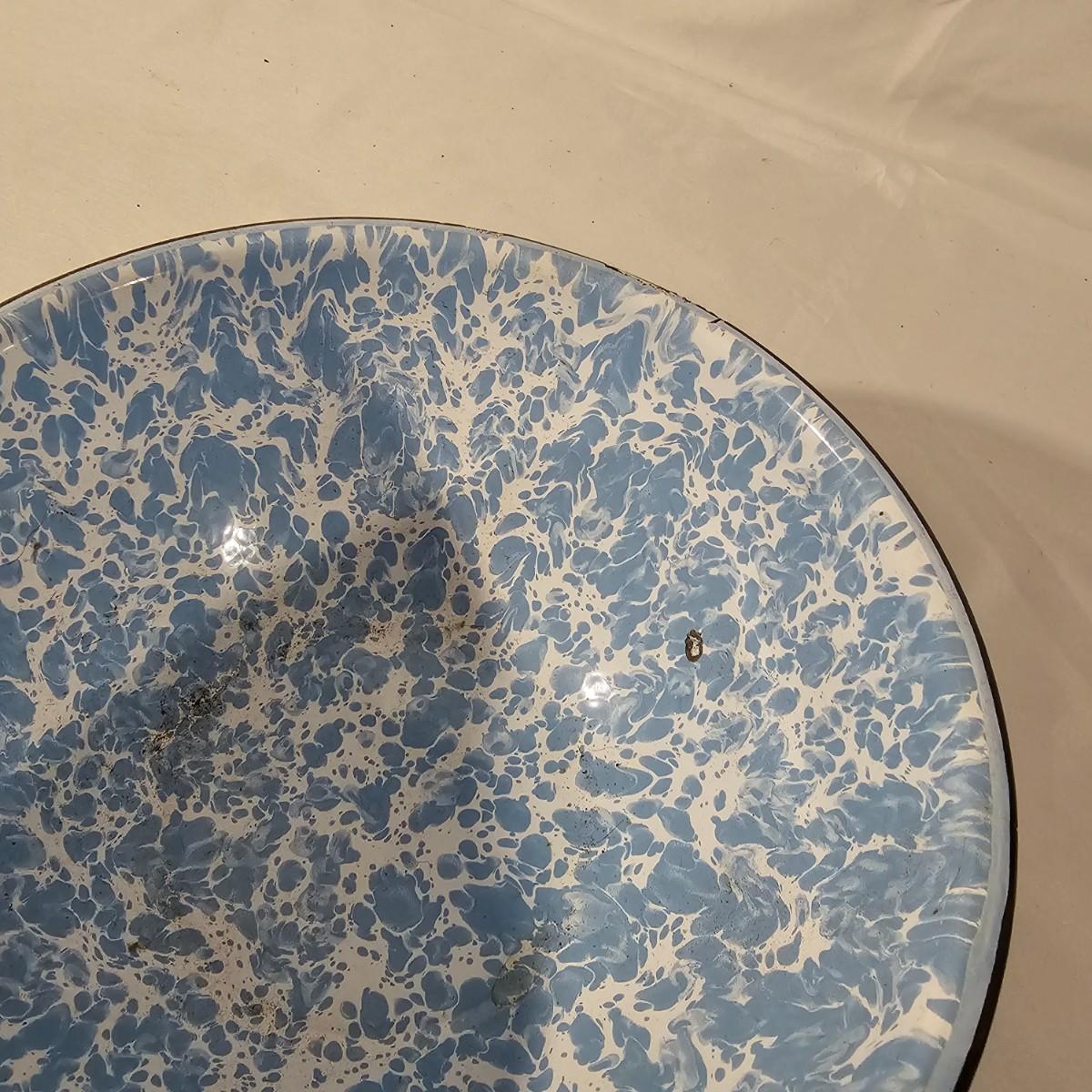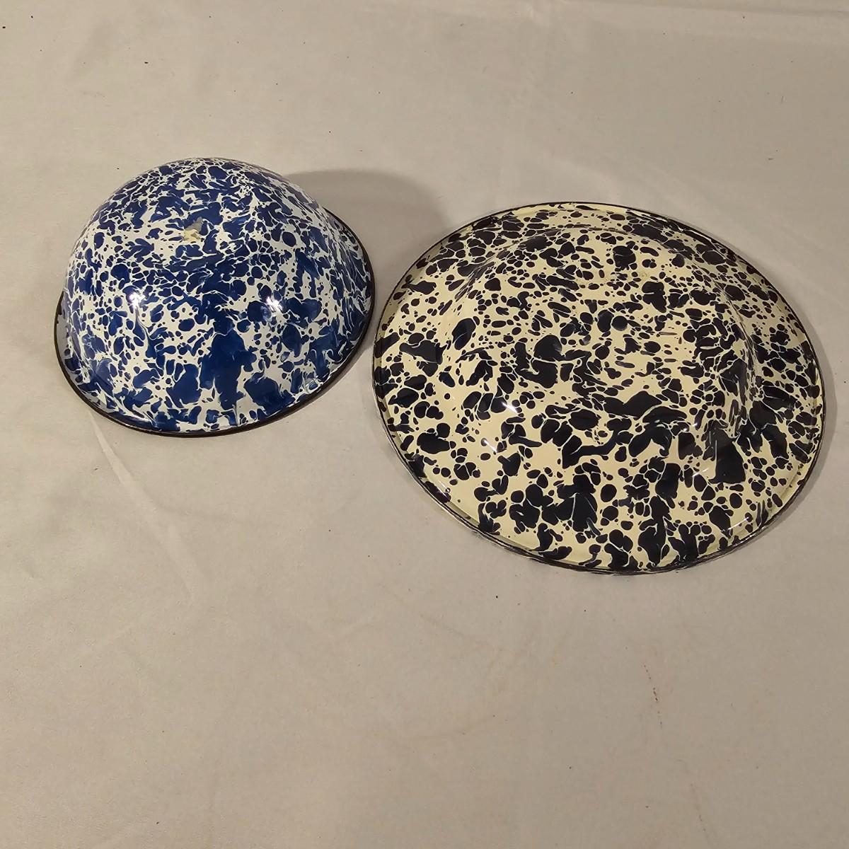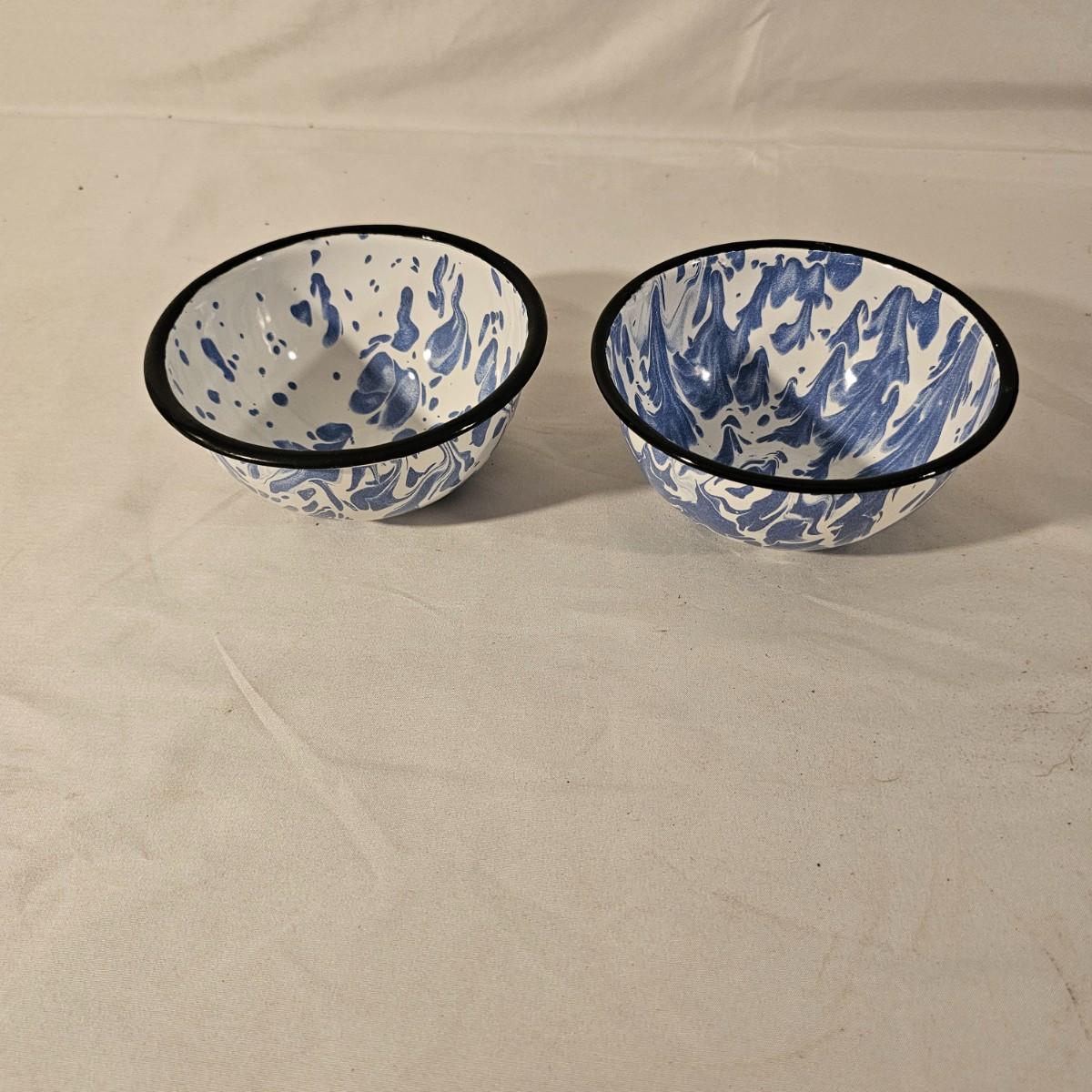 Various sizes of enameled steel ware for mixing, serving, and more. Large round brown bowl is 16"D x 5"H, blue one is 14.5"D x 4"H. Long blue rectangle pan is 16.5" x 10" x 2.5"H. Some used and some new items. See photos for details. Shipping available.