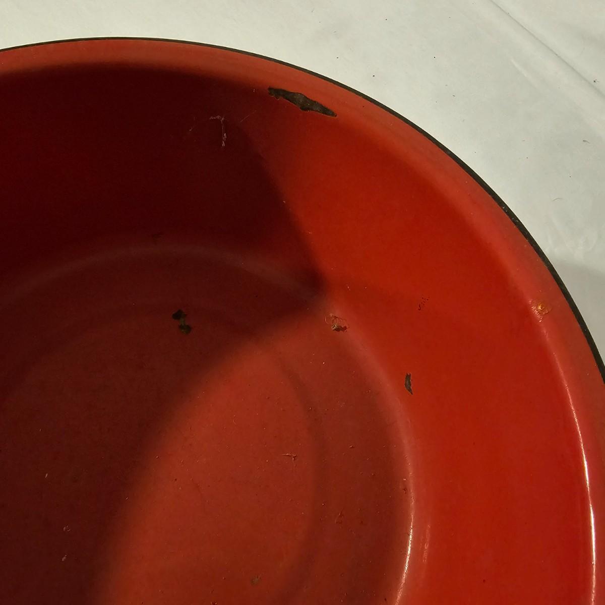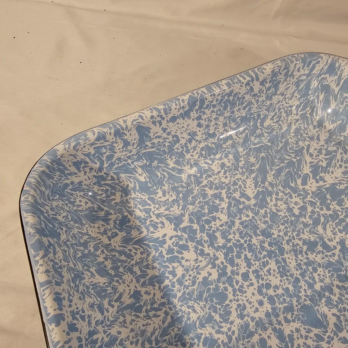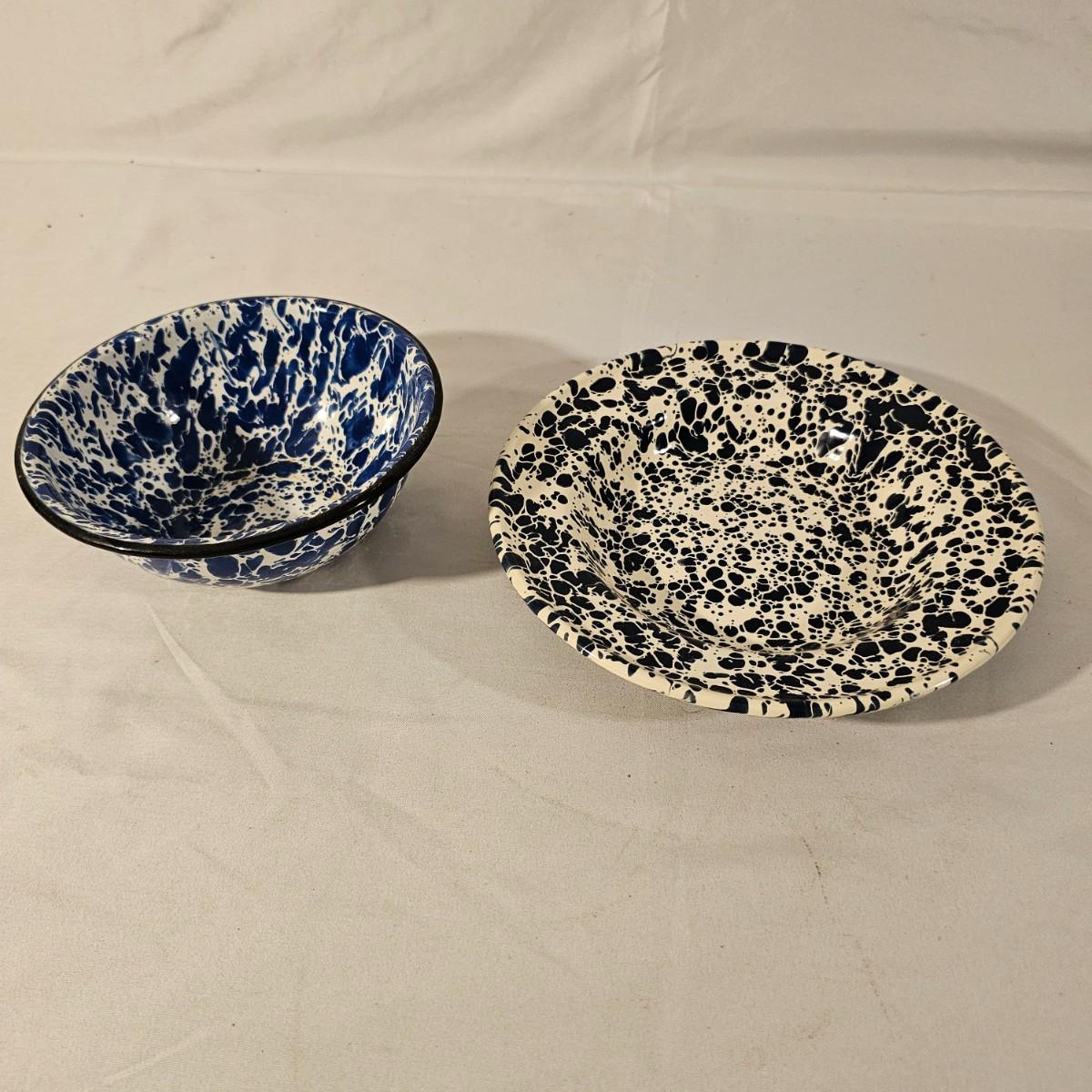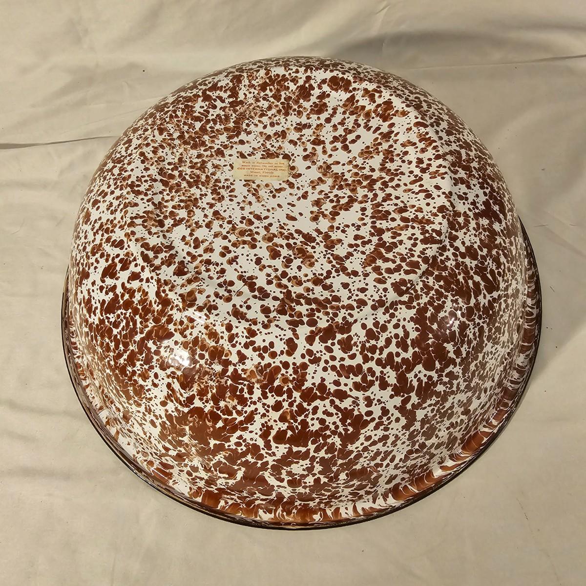 Various sizes of enameled steel ware for mixing, serving, and more. Large round brown bowl is 16"D x 5"H, blue one is 14.5"D x 4"H. Long blue rectangle pan is 16.5" x 10" x 2.5"H. Some used and some new items. See photos for details. Shipping available.