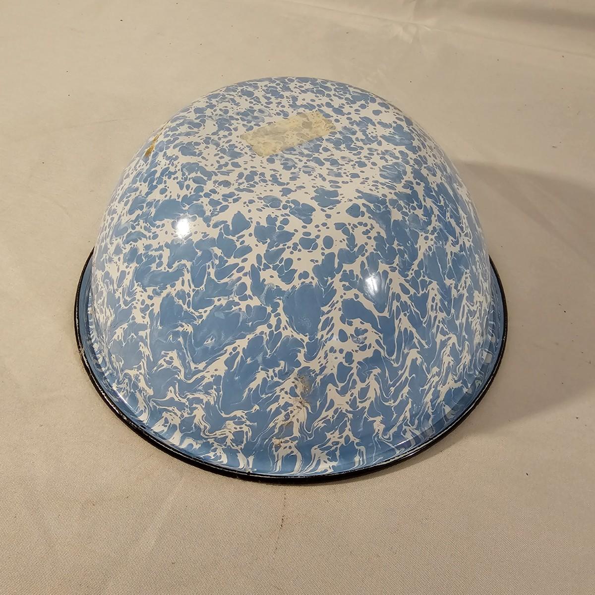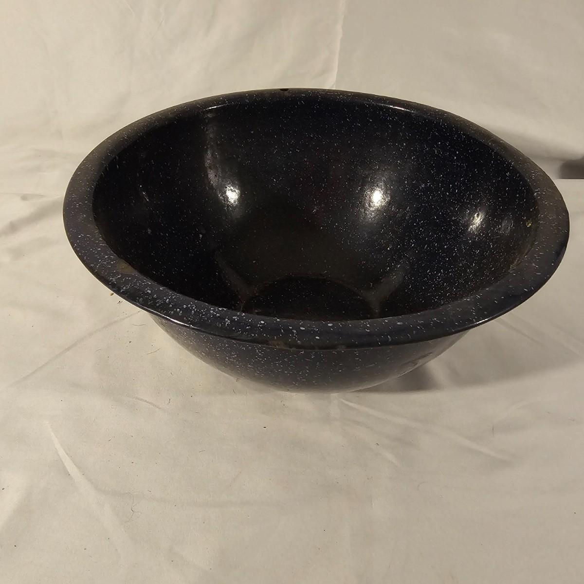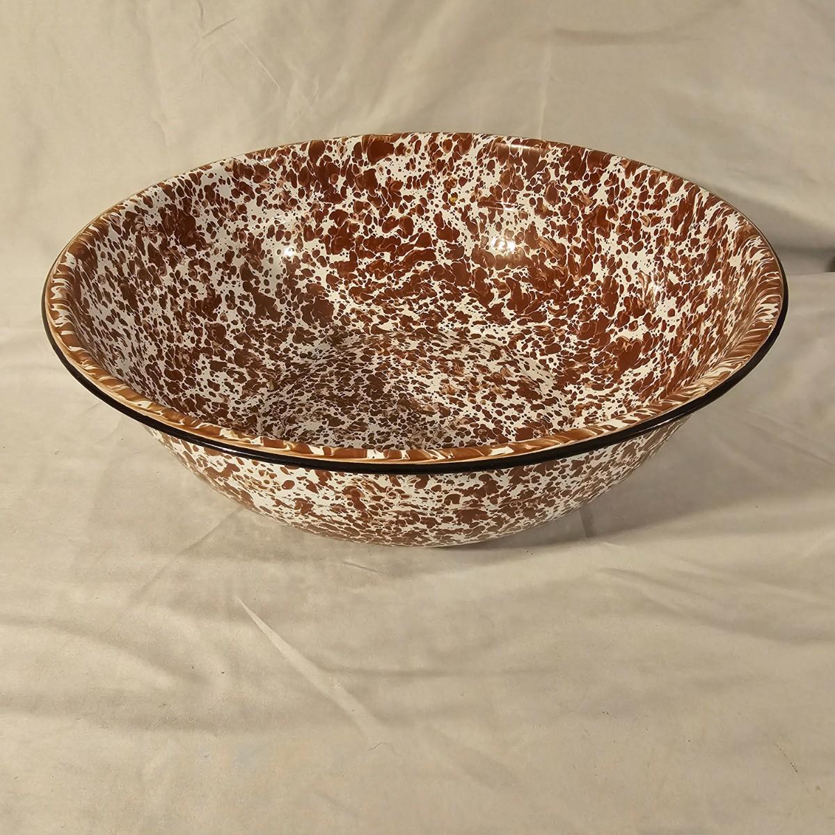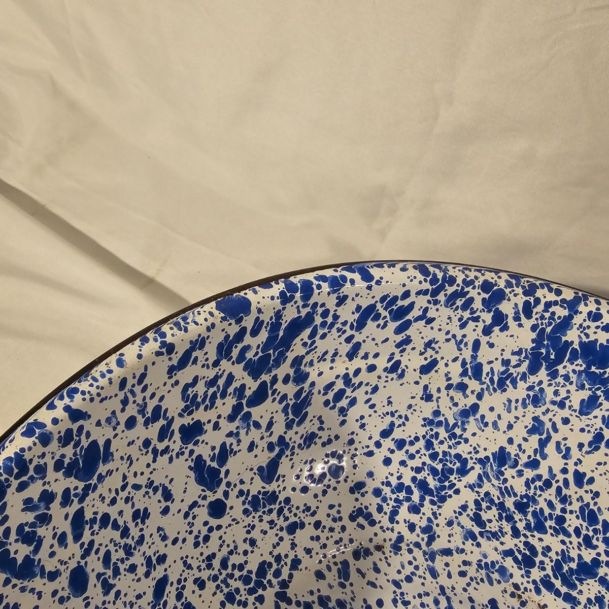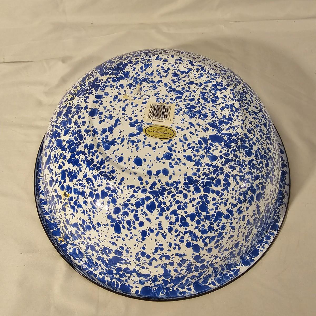 Various sizes of enameled steel ware for mixing, serving, and more. Large round brown bowl is 16"D x 5"H, blue one is 14.5"D x 4"H. Long blue rectangle pan is 16.5" x 10" x 2.5"H. Some used and some new items. See photos for details. Shipping available.