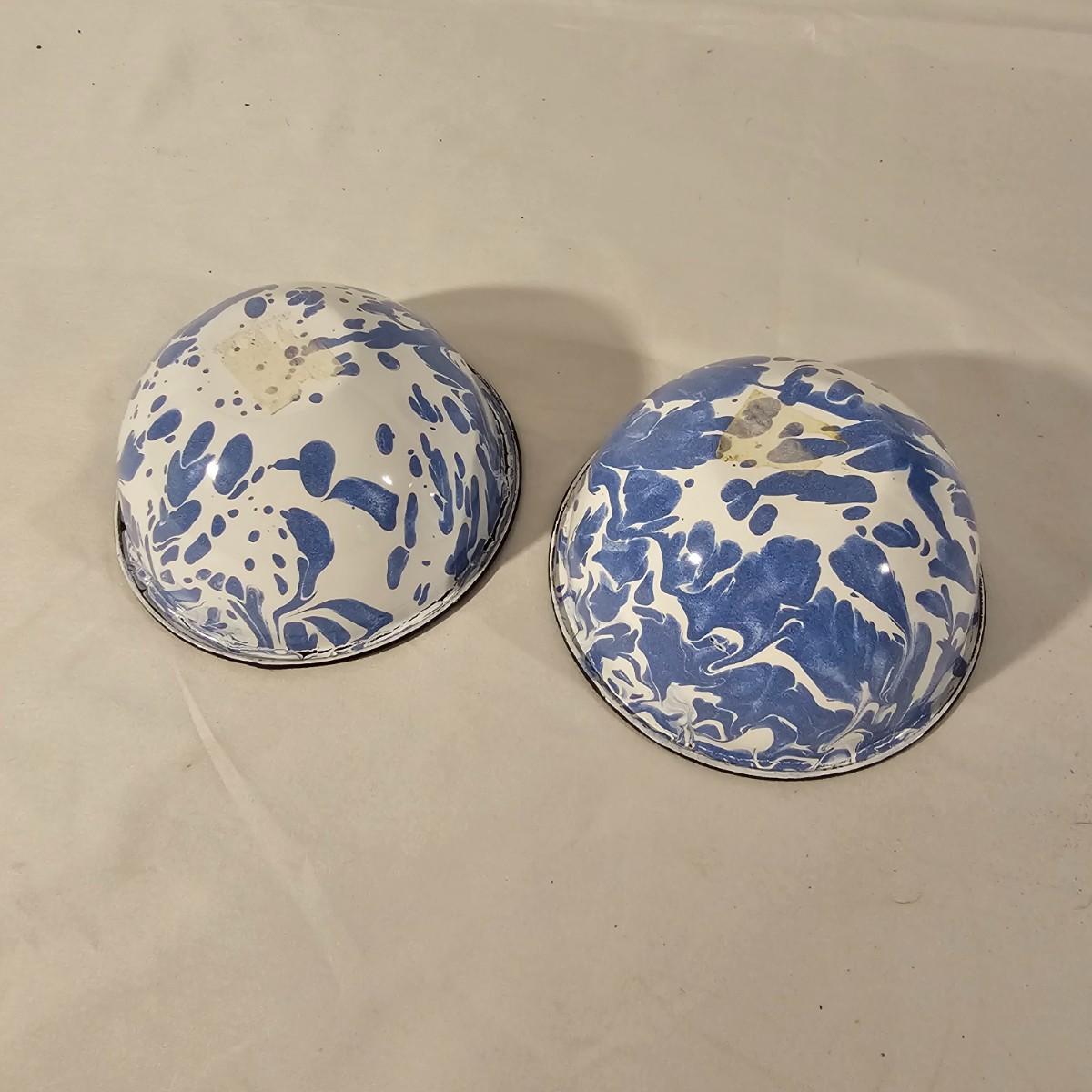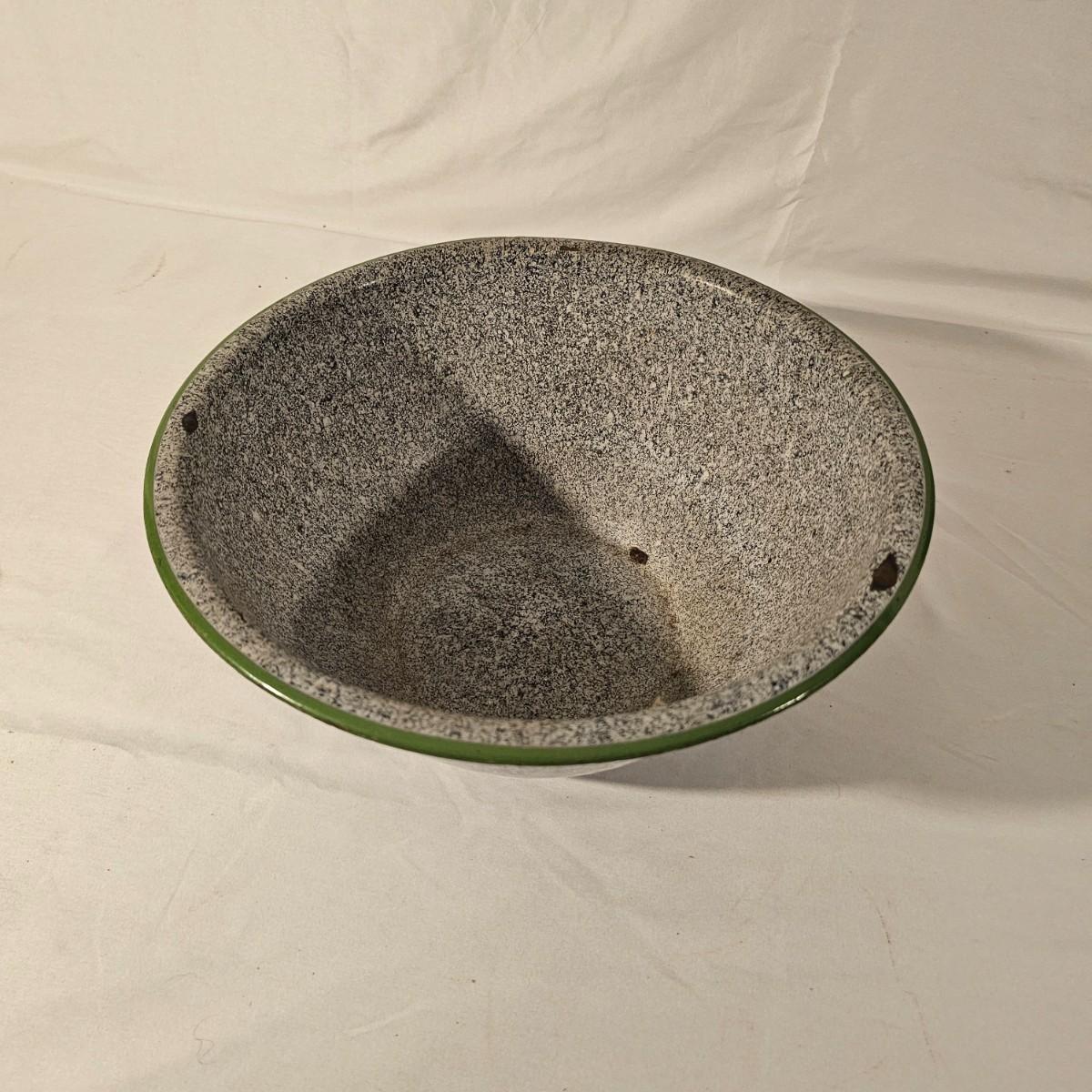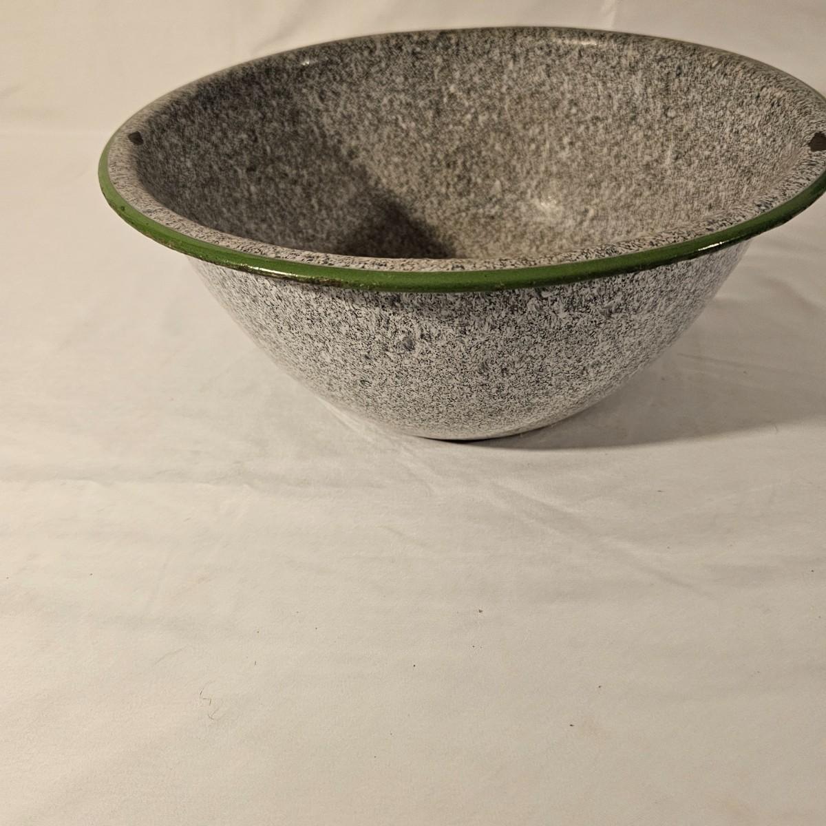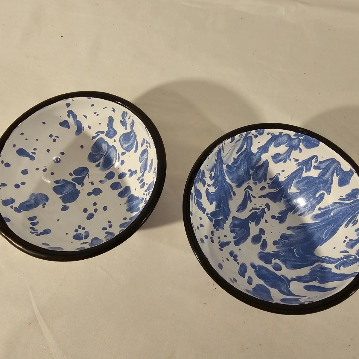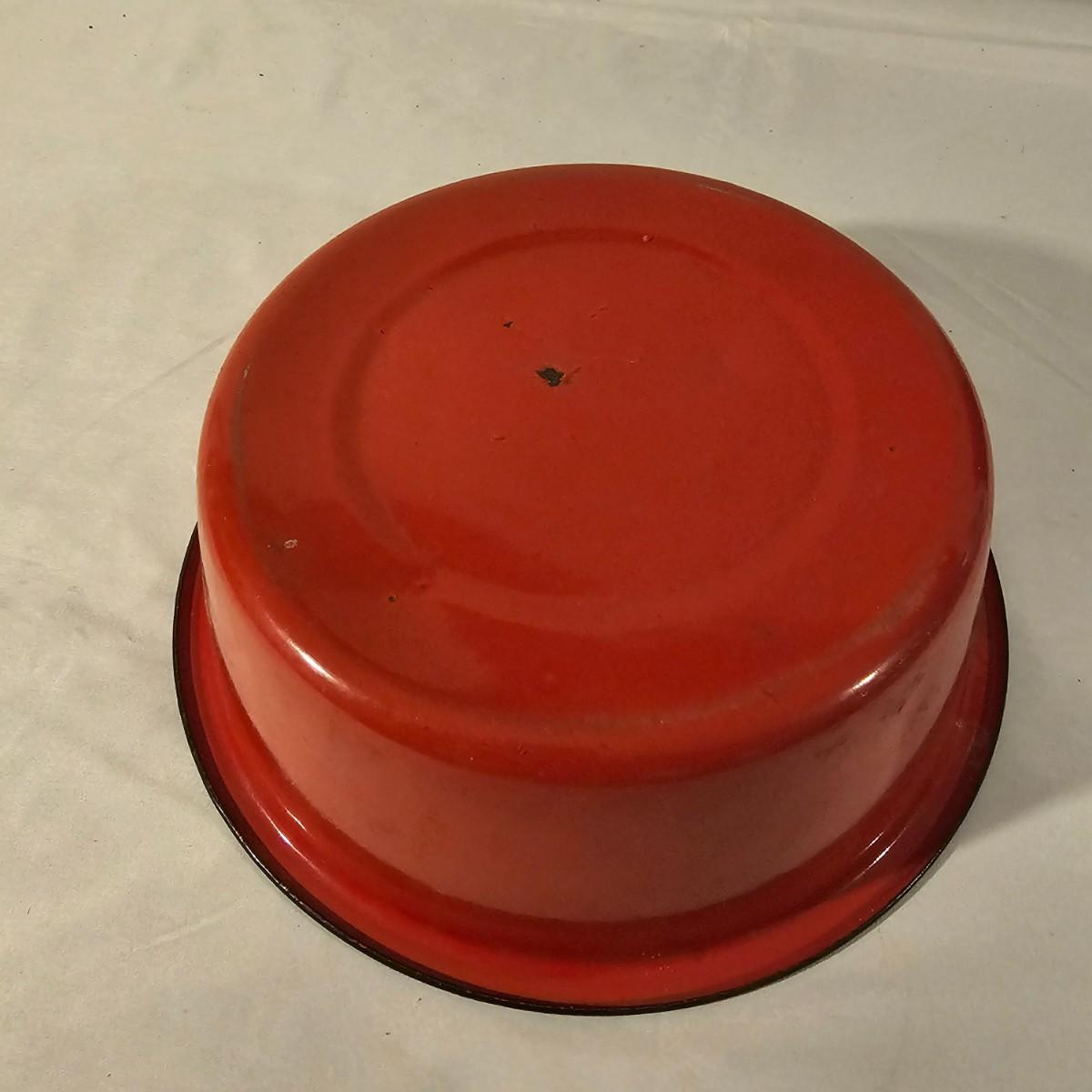 Various sizes of enameled steel ware for mixing, serving, and more. Large round brown bowl is 16"D x 5"H, blue one is 14.5"D x 4"H. Long blue rectangle pan is 16.5" x 10" x 2.5"H. Some used and some new items. See photos for details. Shipping available.