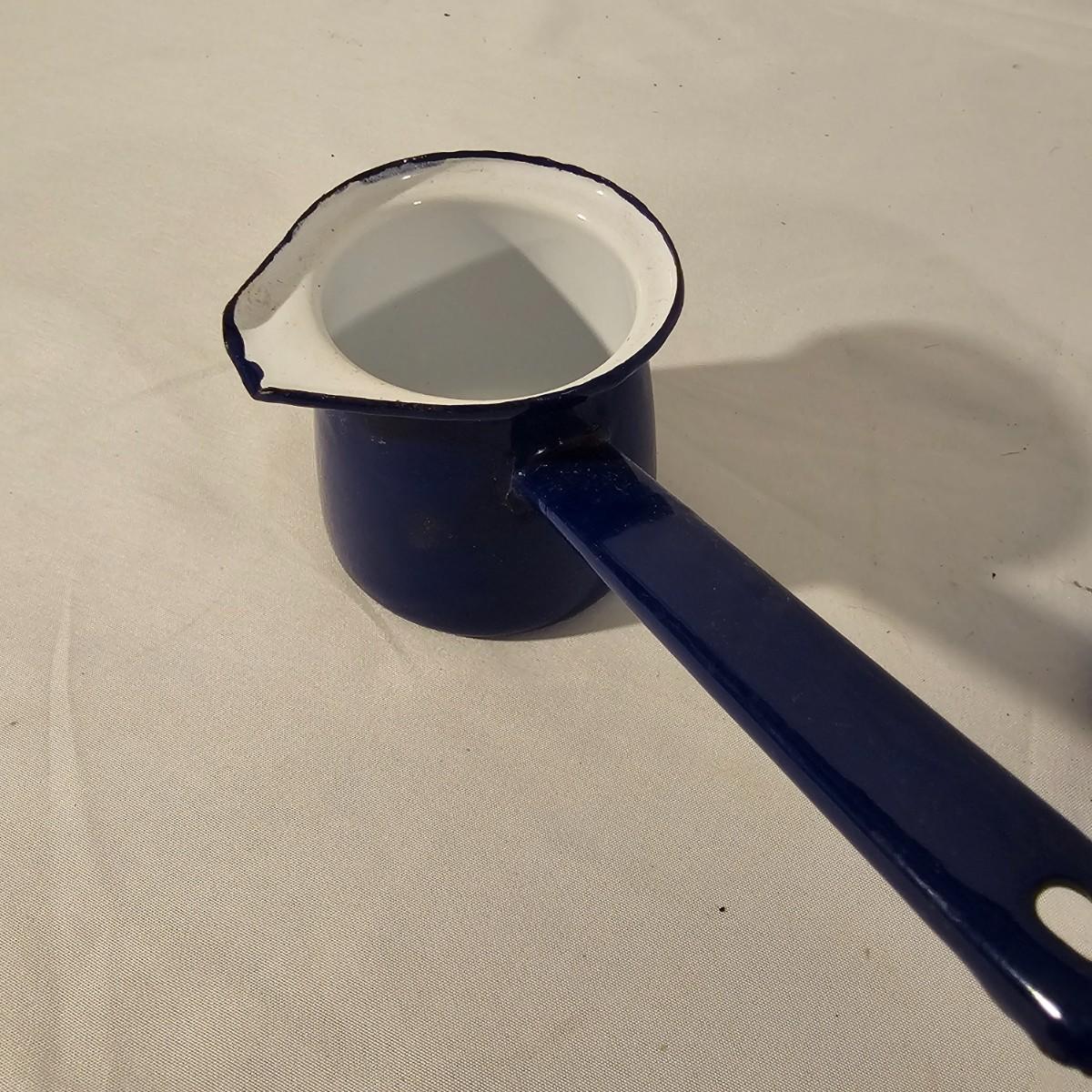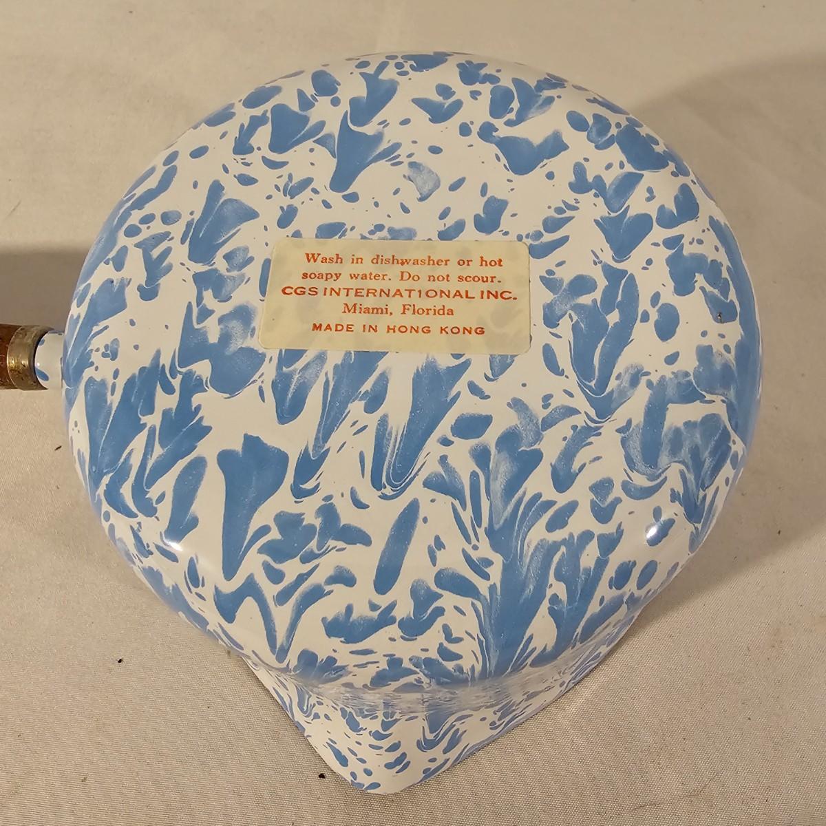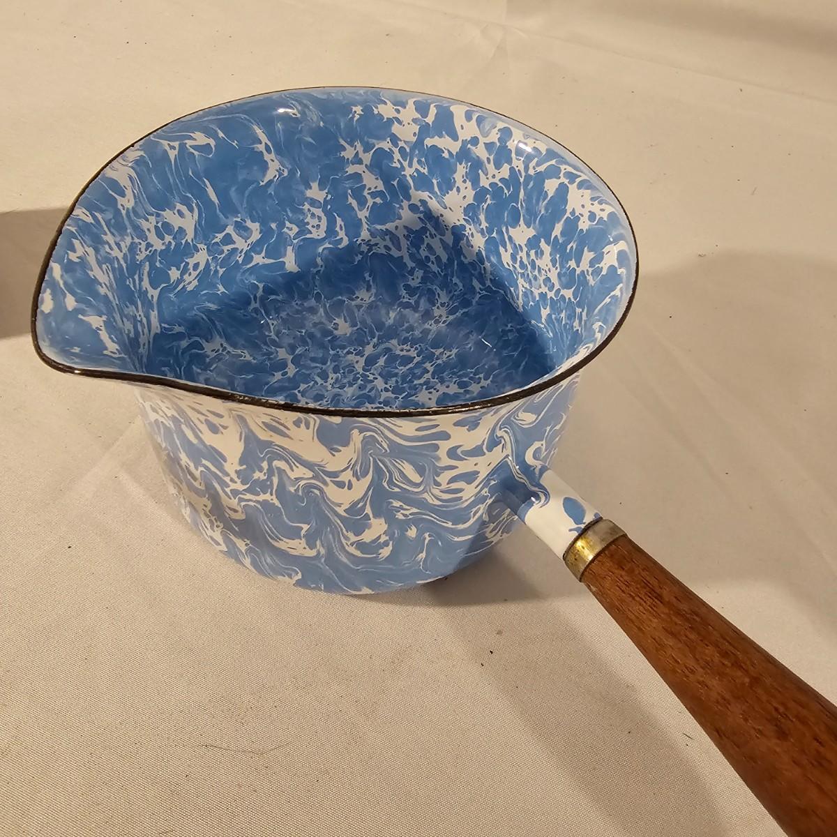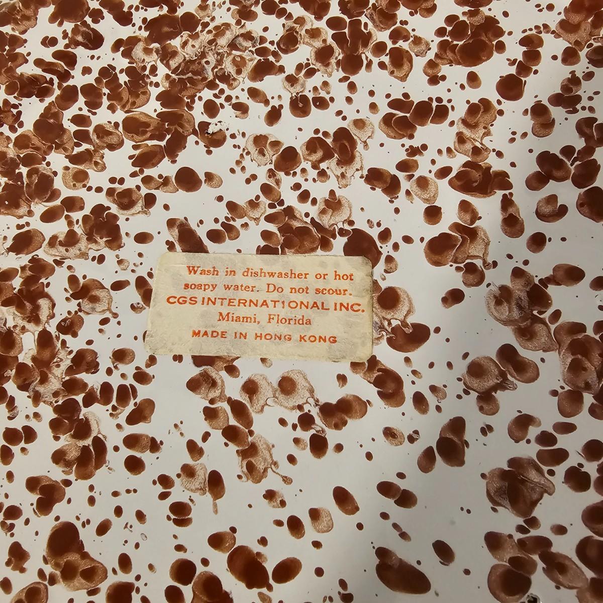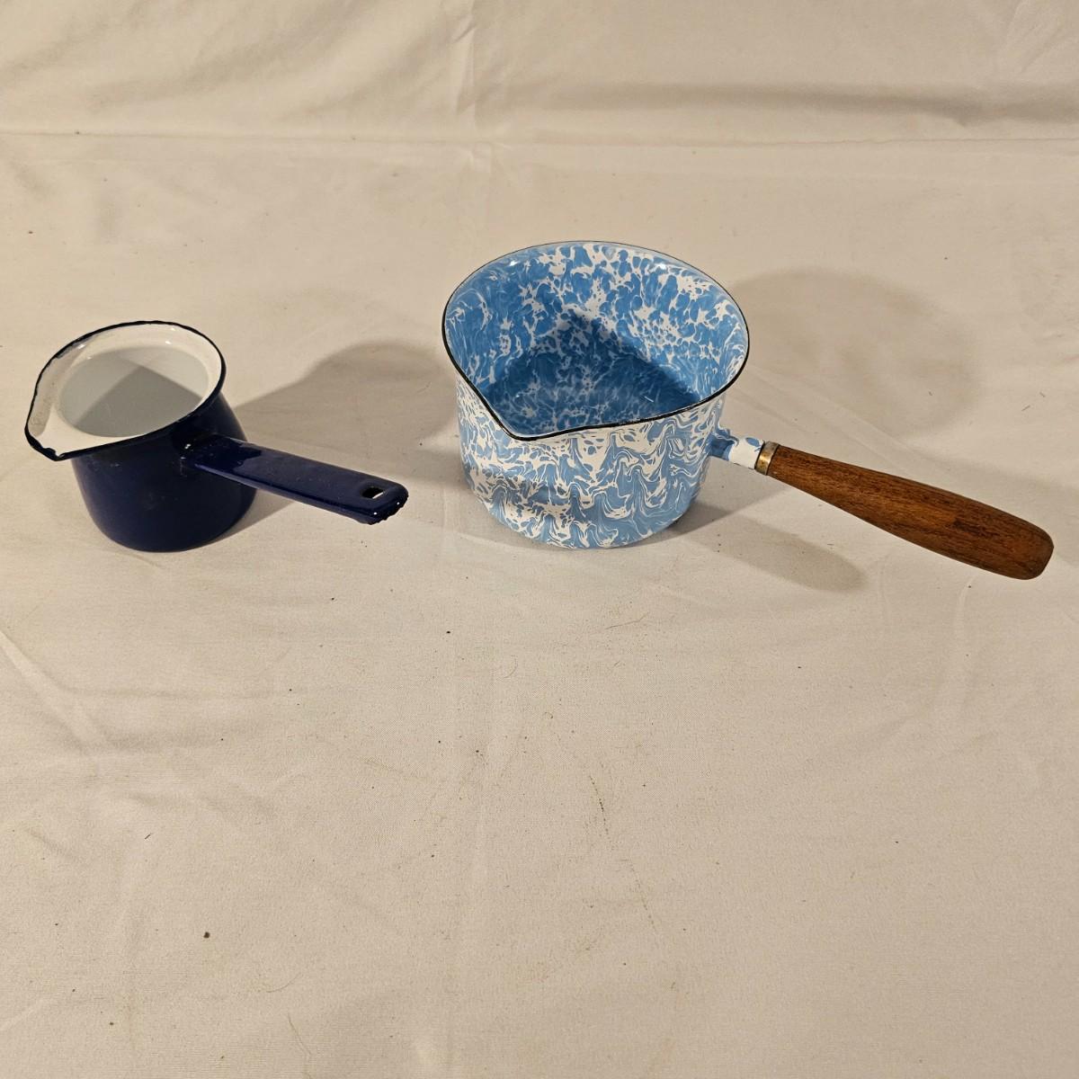 Various sizes of enameled steel ware for mixing, serving, and more. Large round brown bowl is 16"D x 5"H, blue one is 14.5"D x 4"H. Long blue rectangle pan is 16.5" x 10" x 2.5"H. Some used and some new items. See photos for details. Shipping available.