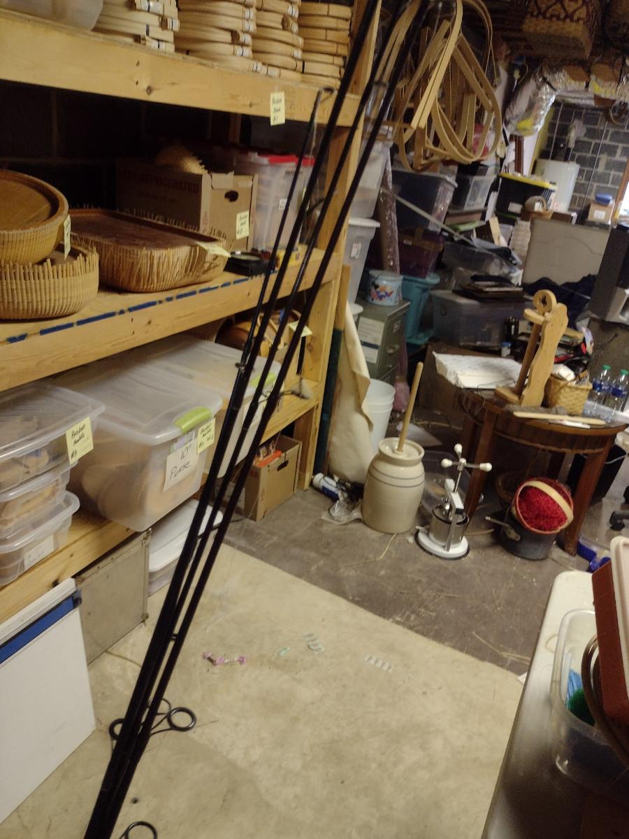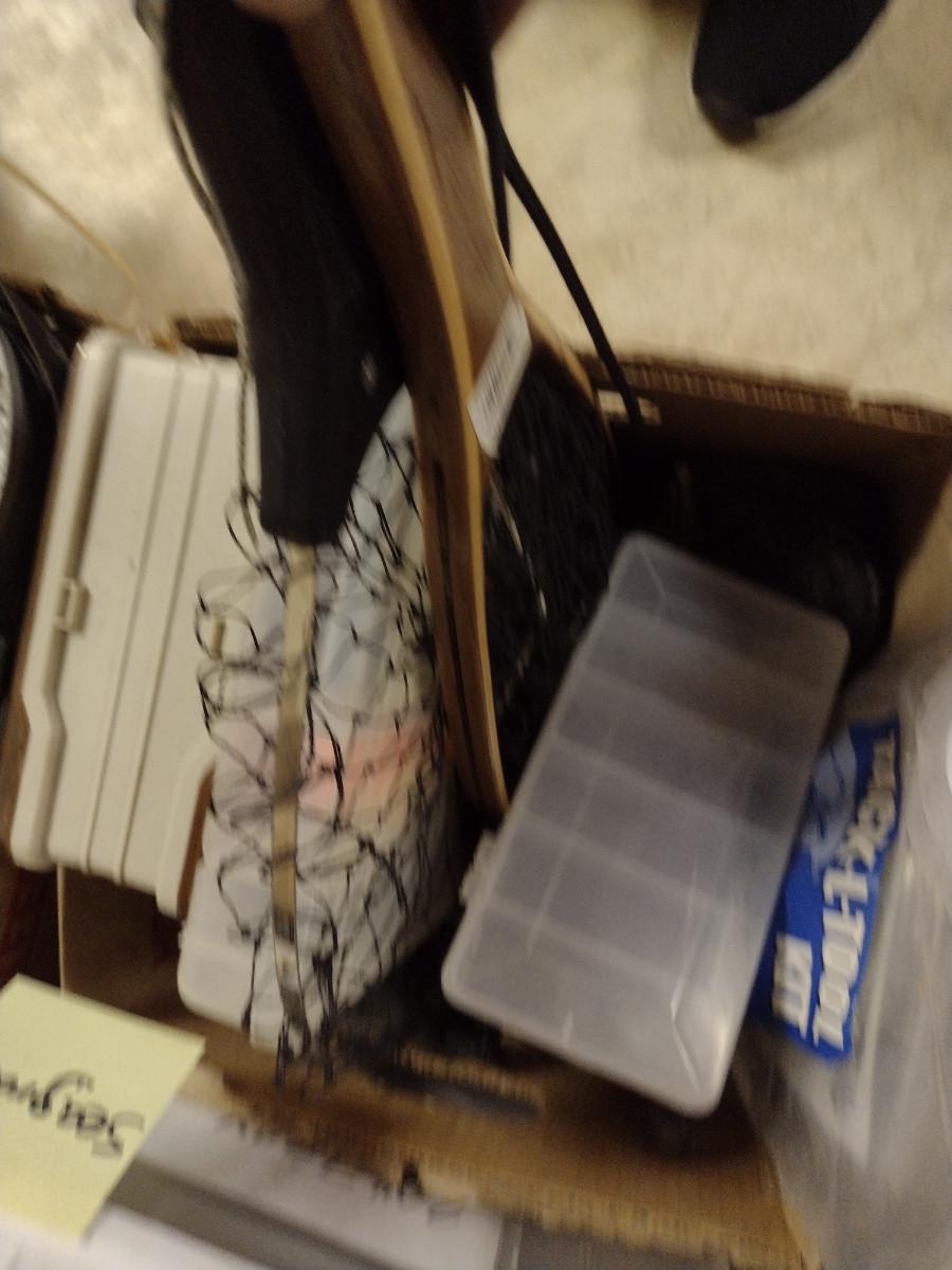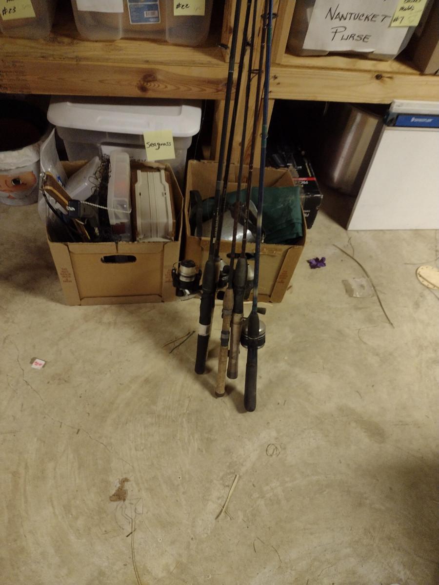 Assorted Fishing Accessories- Poles with Reels, Minnow Bucket, Tackle Boxes