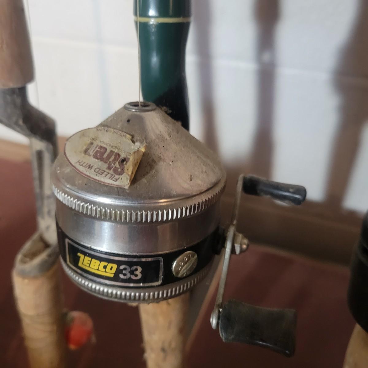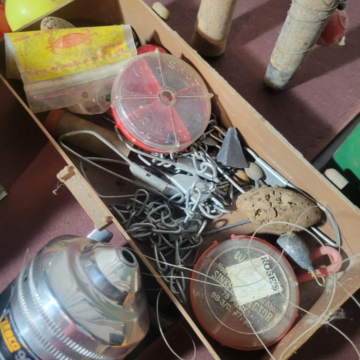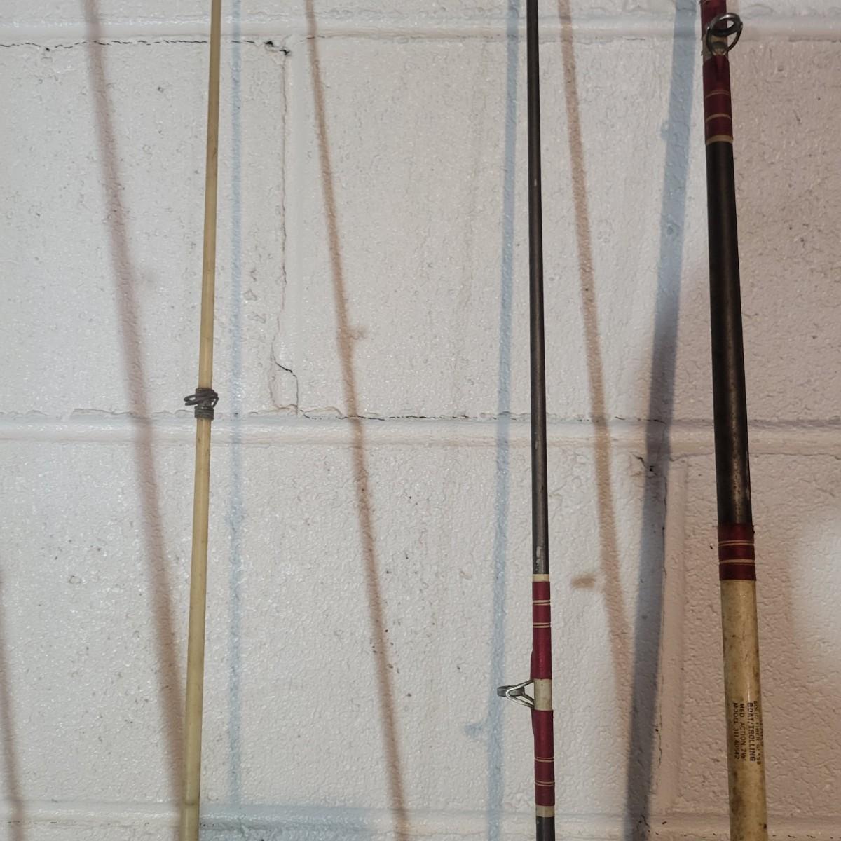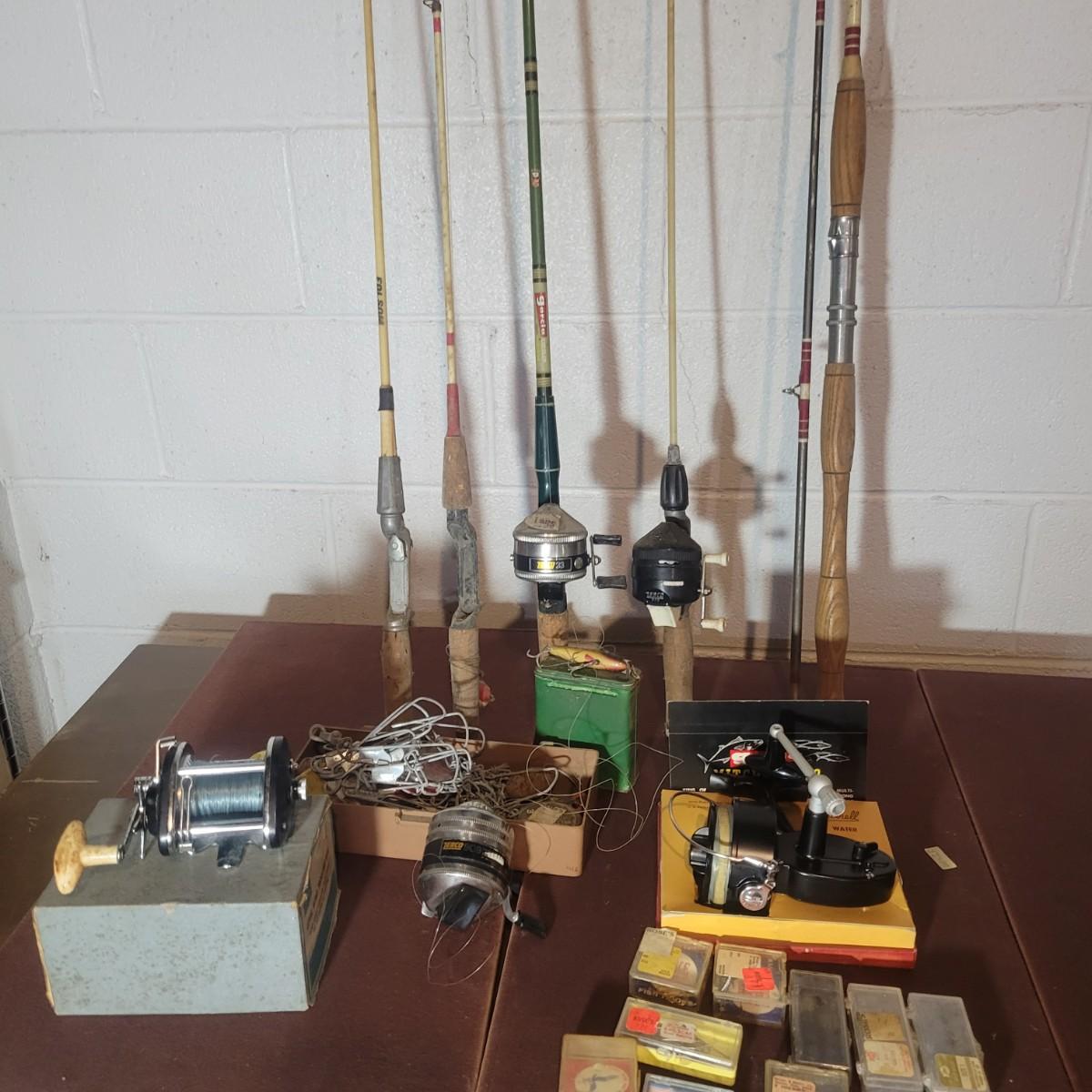 An assortment of rods, reels, hooks, sinkers, stringers and more. Included Is a Garcia Mitchel 392 reel, a Sears trolling reel and rod, three Zebco reels and four rods. Rods all appear to be fiber glass and could definitely be called vintage. The Sears rod is a 3 piece and is missing its top section. Local pickup only