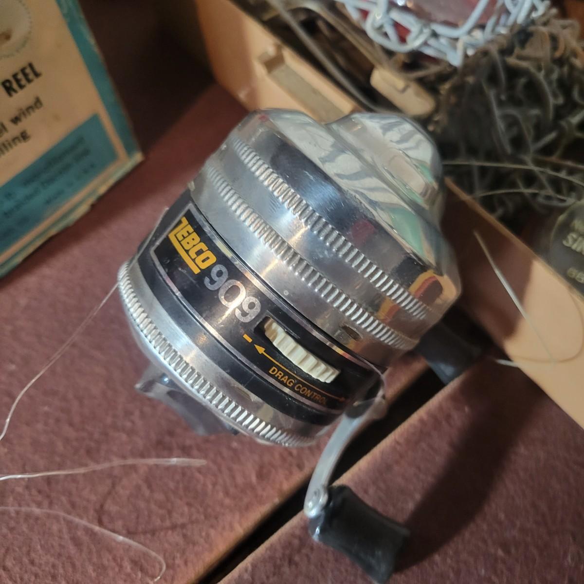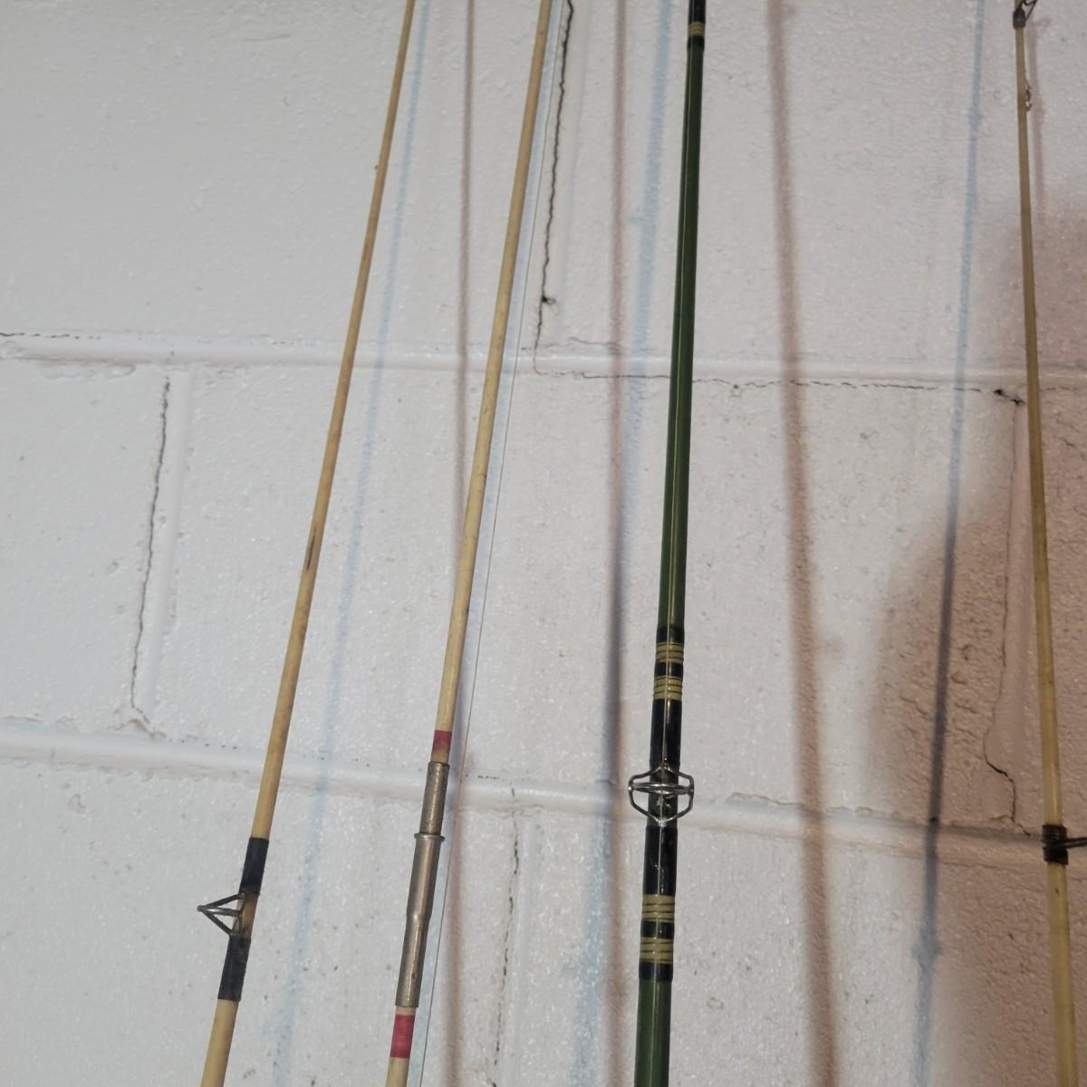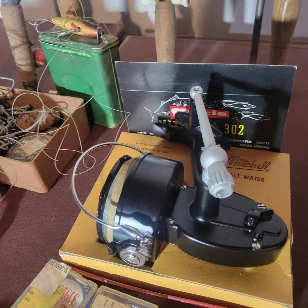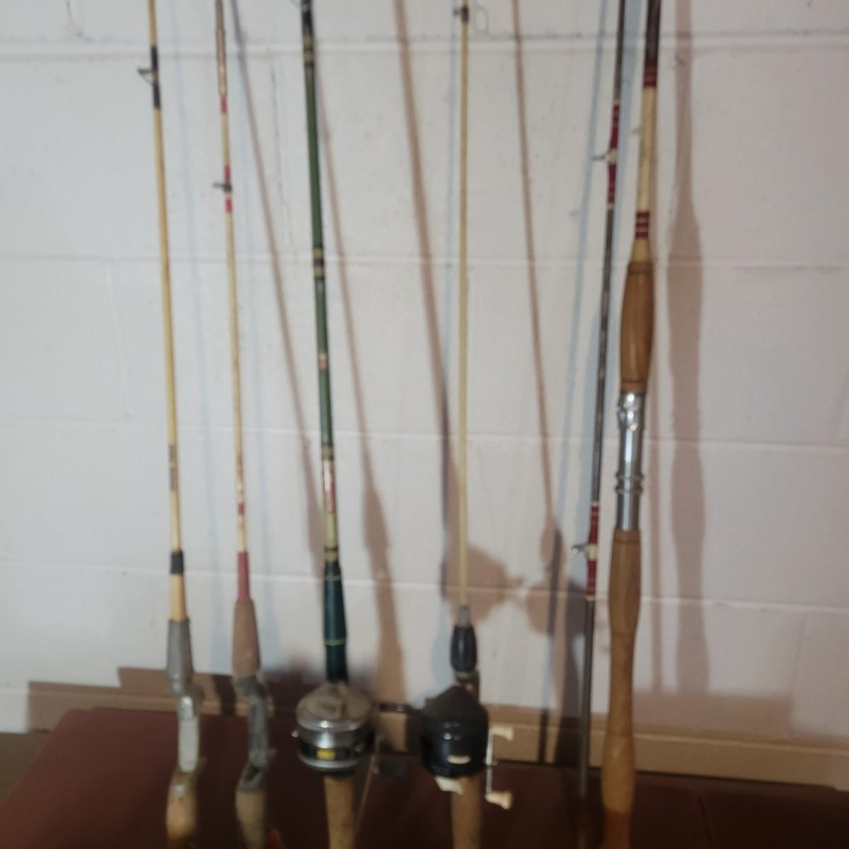 An assortment of rods, reels, hooks, sinkers, stringers and more. Included Is a Garcia Mitchel 392 reel, a Sears trolling reel and rod, three Zebco reels and four rods. Rods all appear to be fiber glass and could definitely be called vintage. The Sears rod is a 3 piece and is missing its top section. Local pickup only