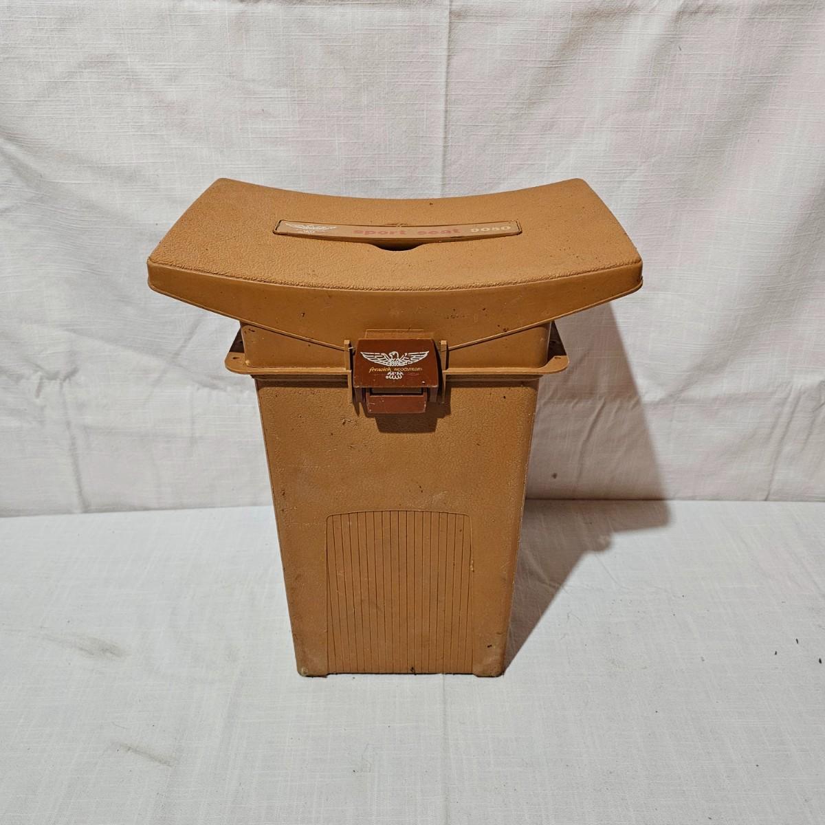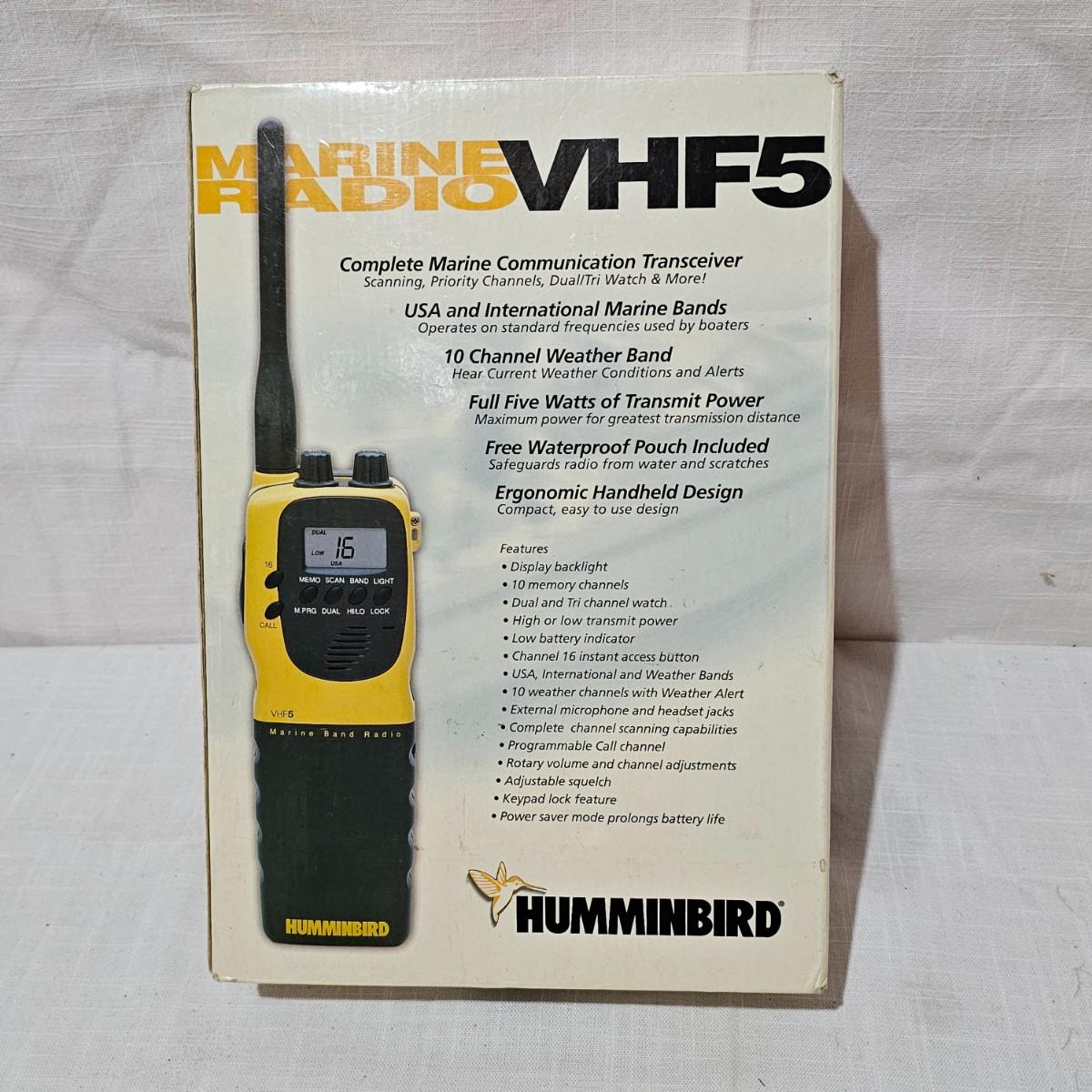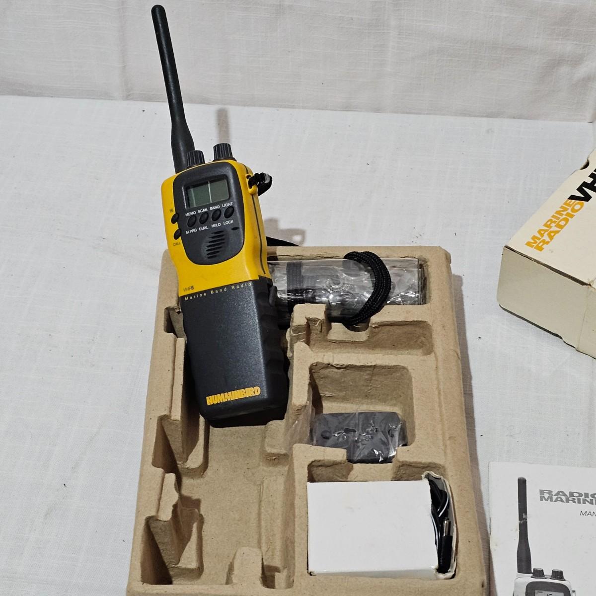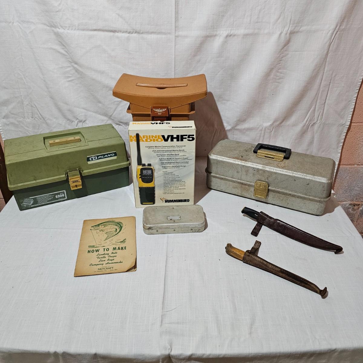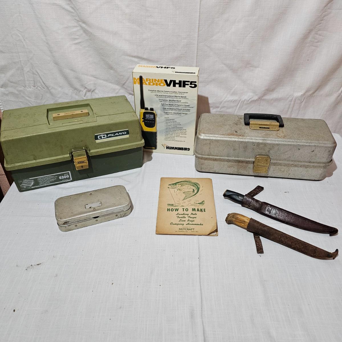 Two rods, two tackle boxes and more in this lot. One Garcia Conolon 6.5' rod with Mitchell Garcia 301A open face reel. One Okuma 6.5' lightweight rod. May be missing one ferrule. Two tackle boxes, one Plano and one Umco with a few assorted vintage lures and plugs. Plano box measures 15" x 7" x 8"H. Two filet knives, one 6" and one 7". Small box of fly fishing lures, assorted. A Fenwick Sport Seat with handle, two inner trays and a small coolong area. 12" x 8" x 15"H. One Humminbird VHF5 marine radio in original box. Unit powered on when charged and turned on. See photos for details. Local pickup only.