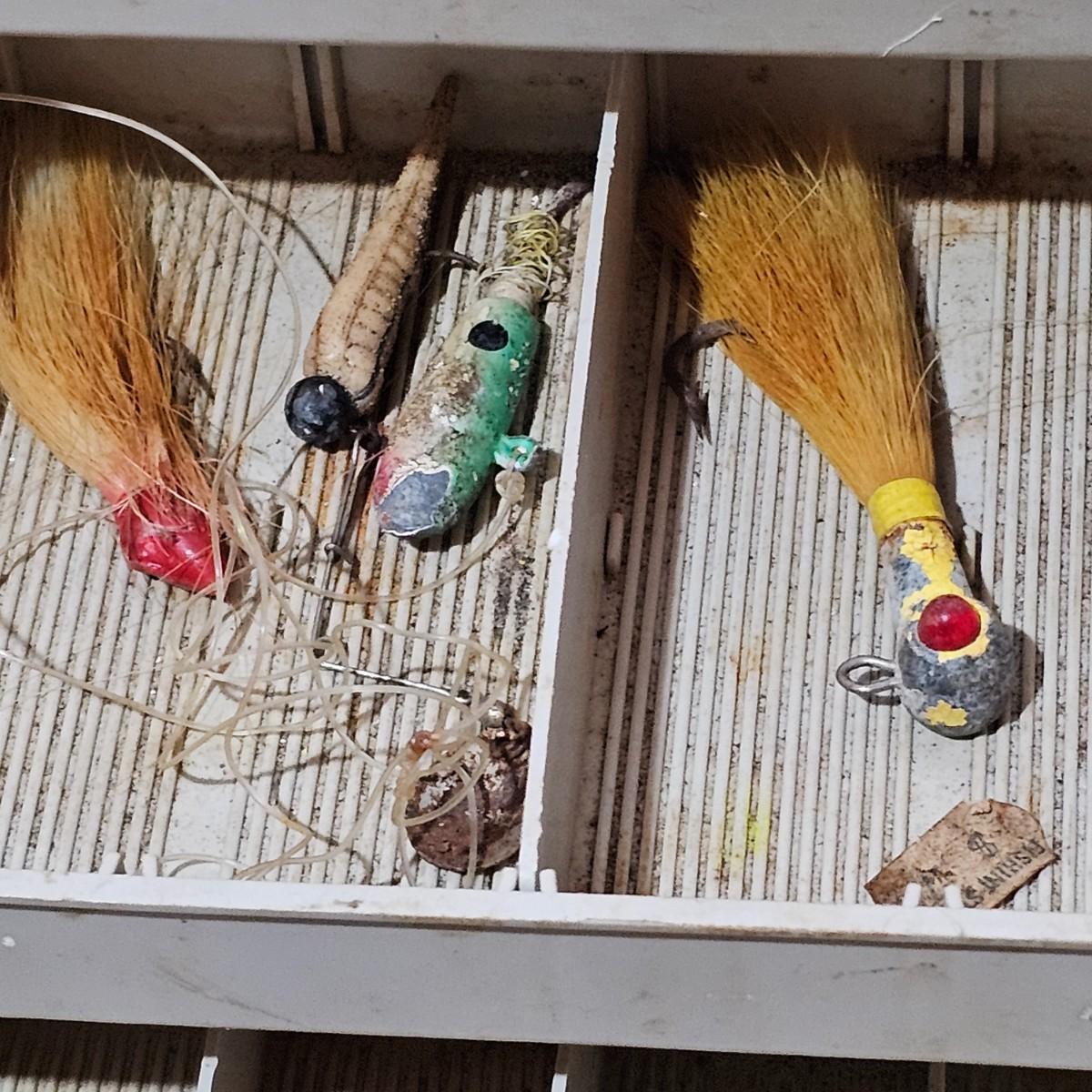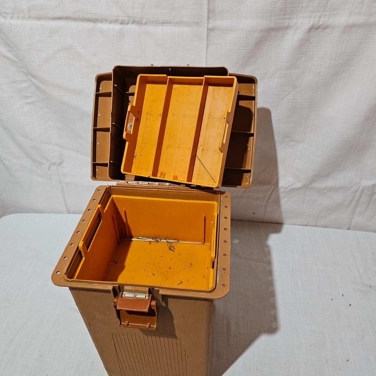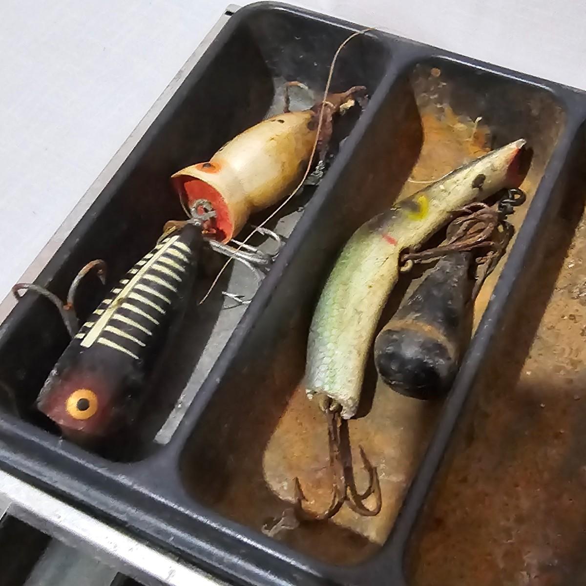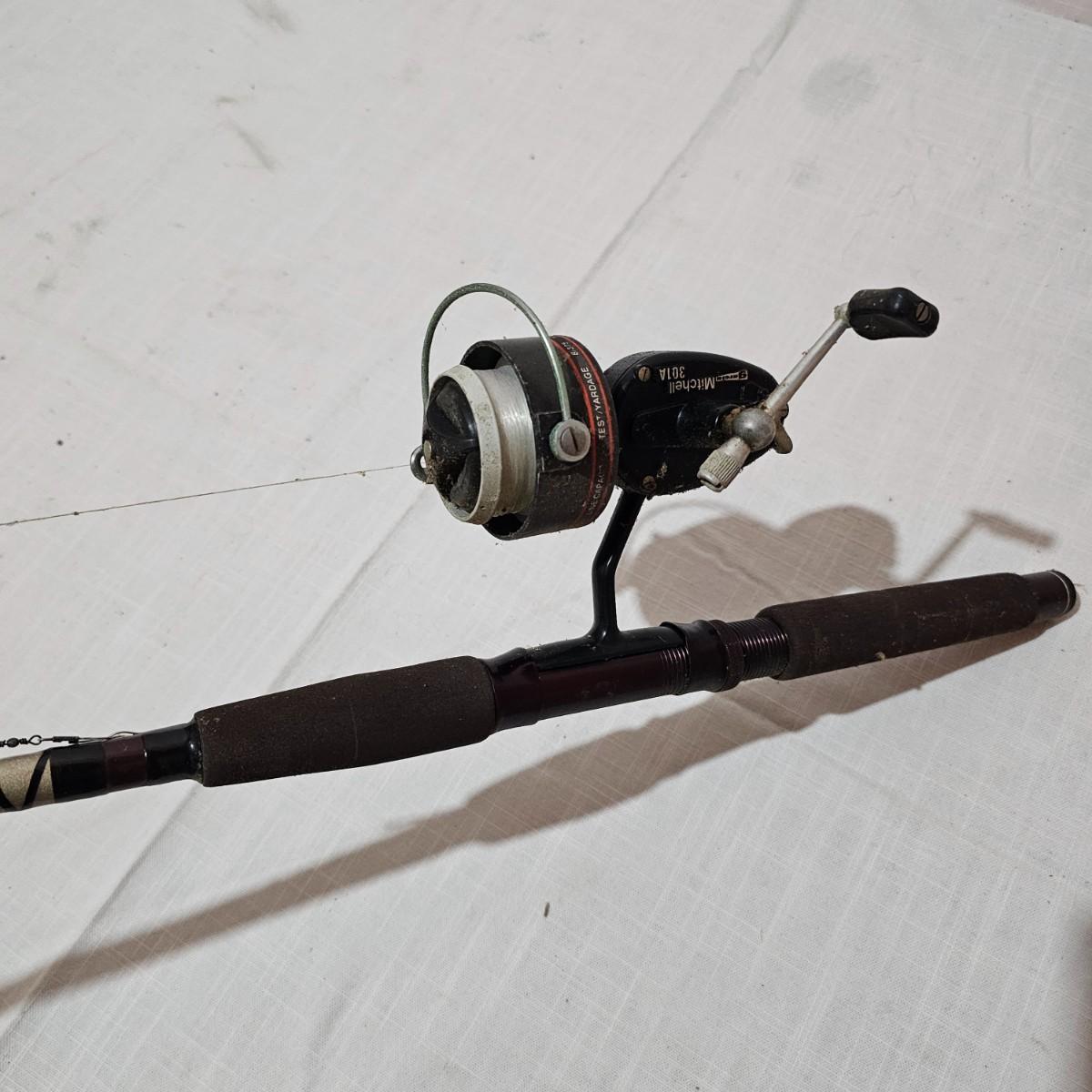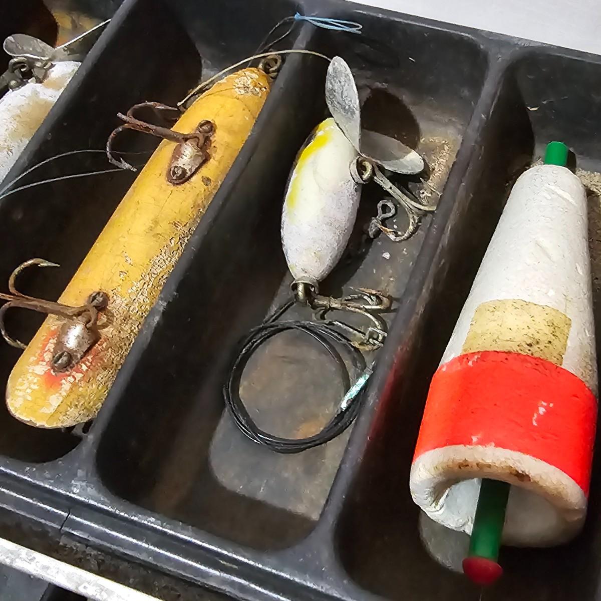 Two rods, two tackle boxes and more in this lot. One Garcia Conolon 6.5' rod with Mitchell Garcia 301A open face reel. One Okuma 6.5' lightweight rod. May be missing one ferrule. Two tackle boxes, one Plano and one Umco with a few assorted vintage lures and plugs. Plano box measures 15" x 7" x 8"H. Two filet knives, one 6" and one 7". Small box of fly fishing lures, assorted. A Fenwick Sport Seat with handle, two inner trays and a small coolong area. 12" x 8" x 15"H. One Humminbird VHF5 marine radio in original box. Unit powered on when charged and turned on. See photos for details. Local pickup only.
