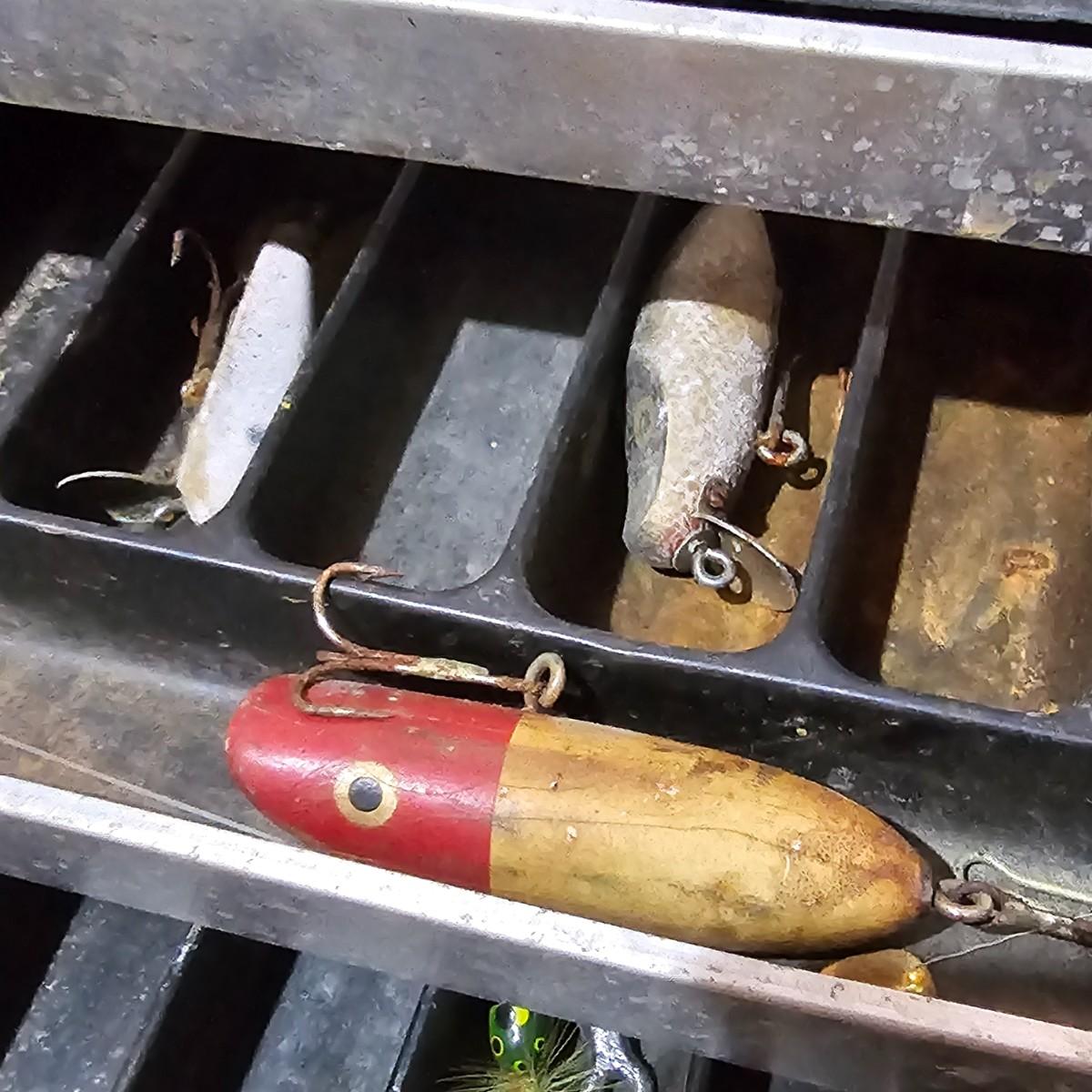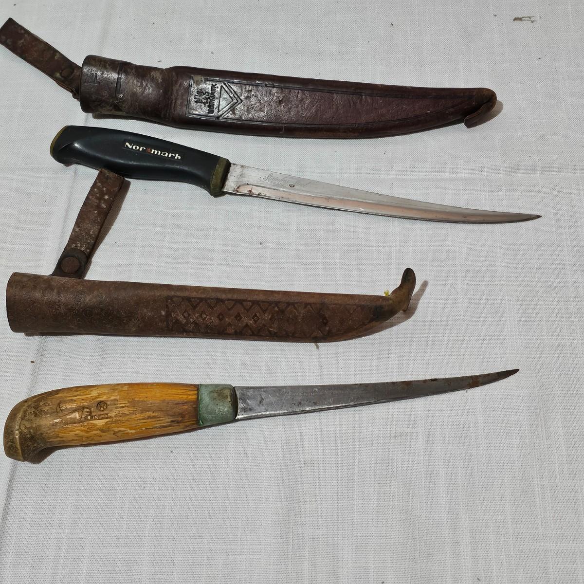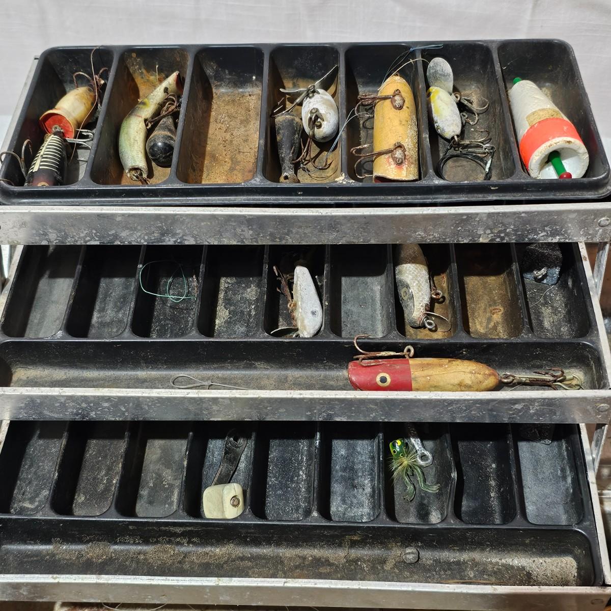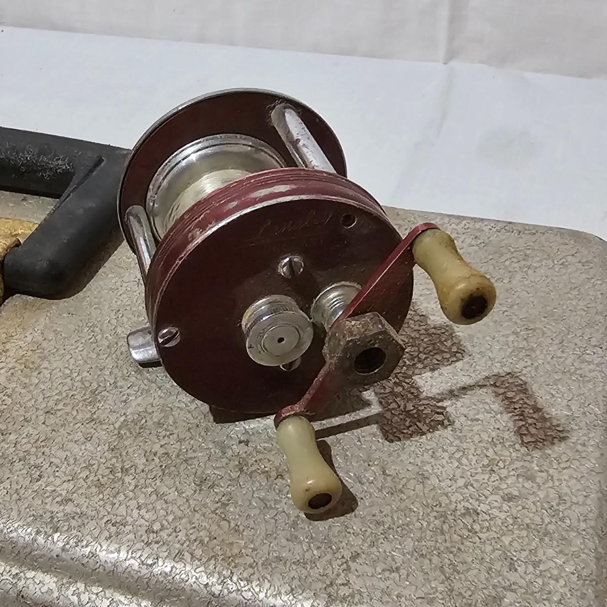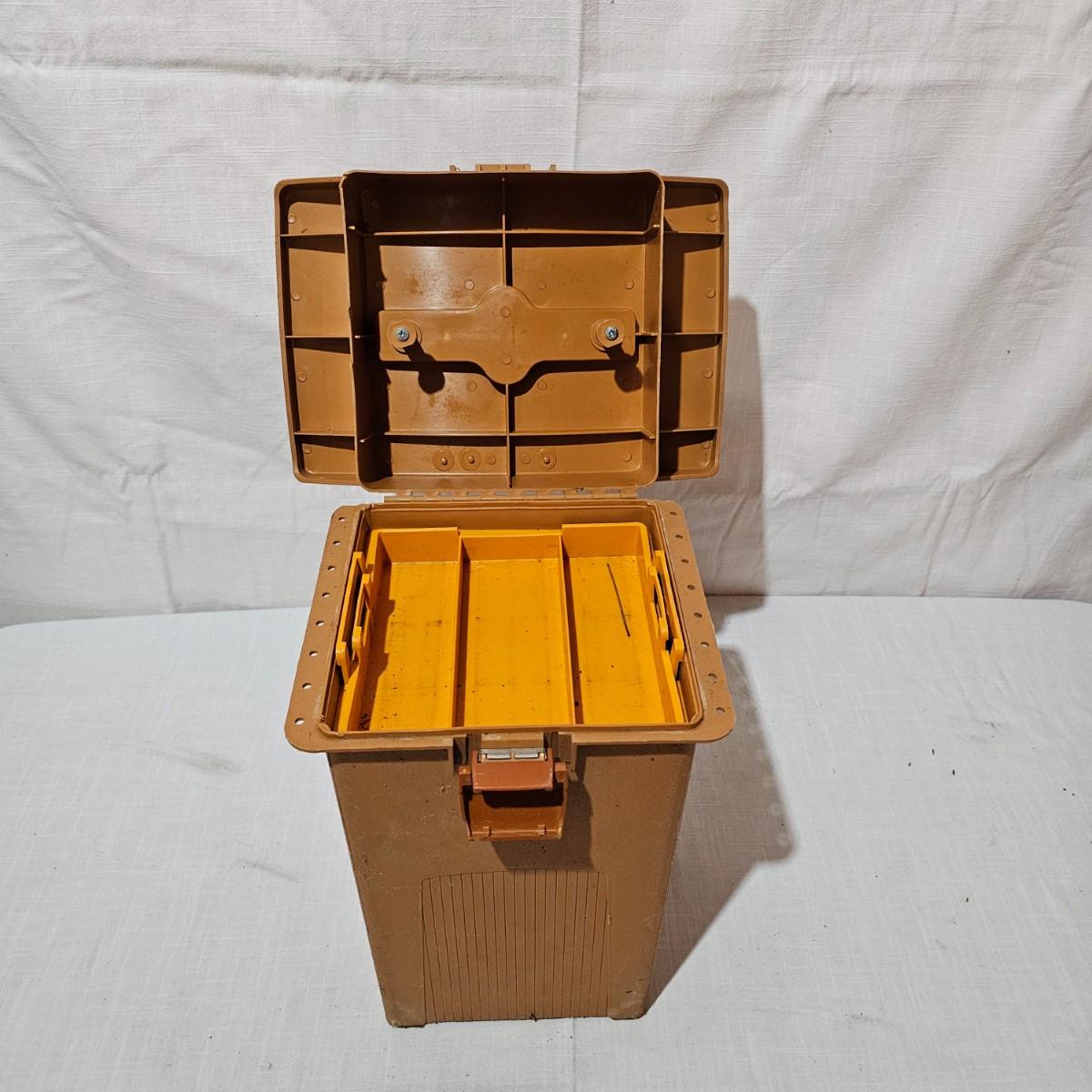 Two rods, two tackle boxes and more in this lot. One Garcia Conolon 6.5' rod with Mitchell Garcia 301A open face reel. One Okuma 6.5' lightweight rod. May be missing one ferrule. Two tackle boxes, one Plano and one Umco with a few assorted vintage lures and plugs. Plano box measures 15" x 7" x 8"H. Two filet knives, one 6" and one 7". Small box of fly fishing lures, assorted. A Fenwick Sport Seat with handle, two inner trays and a small coolong area. 12" x 8" x 15"H. One Humminbird VHF5 marine radio in original box. Unit powered on when charged and turned on. See photos for details. Local pickup only.