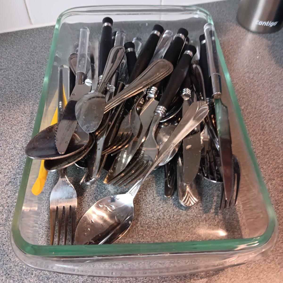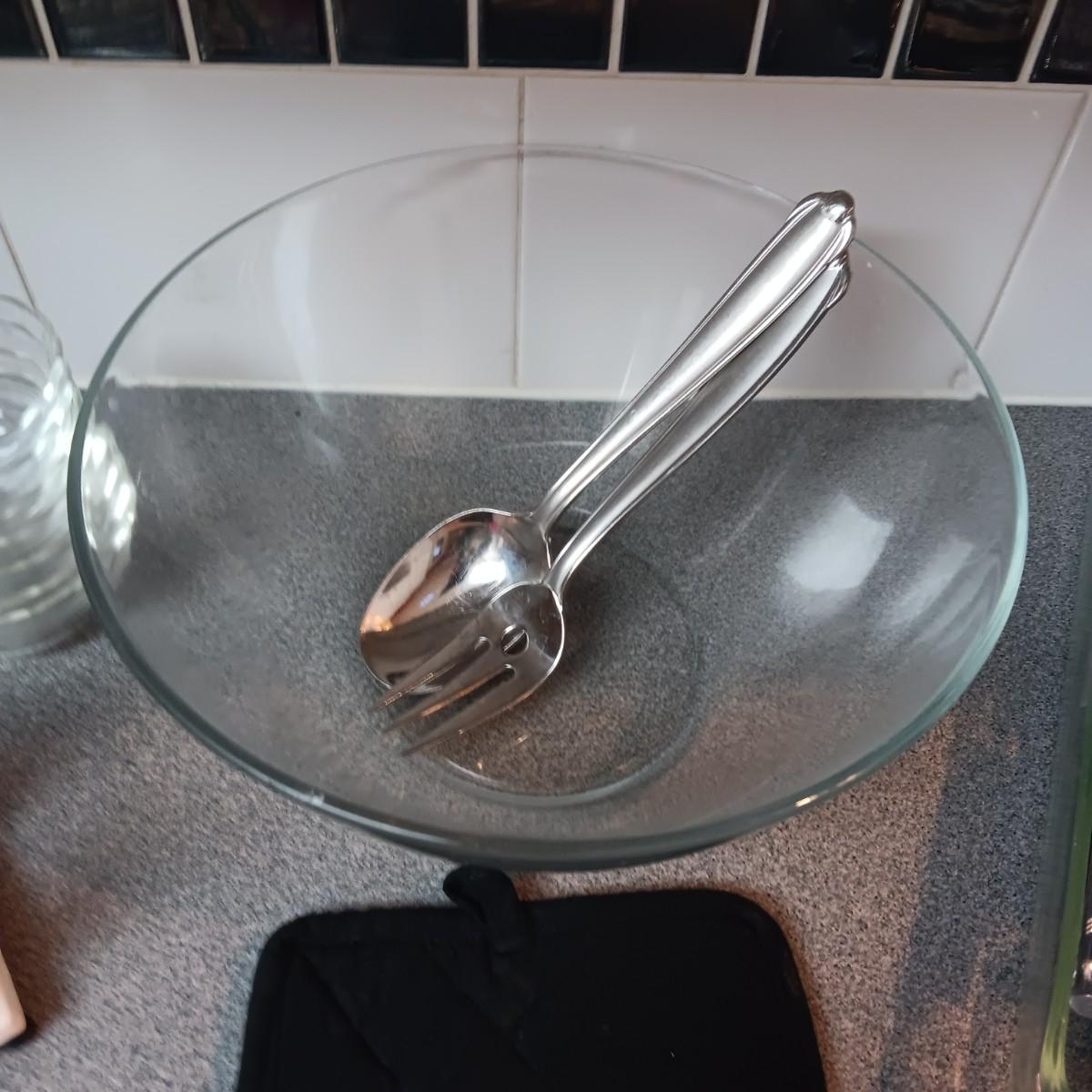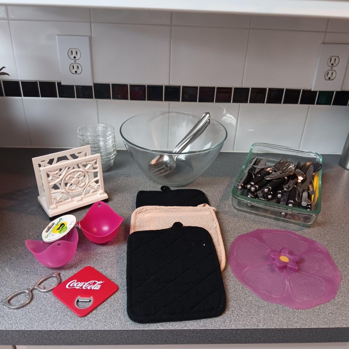 ASSORTED FLATWARE, GLASS SERVING BOWL AND BAKING DISH, CAST IRON NAPKIN HOLDER