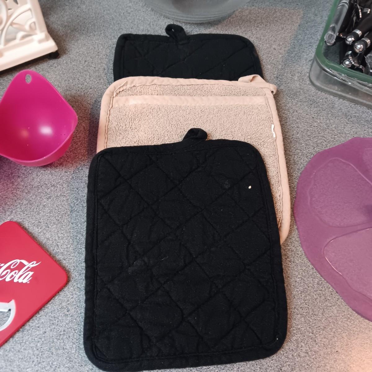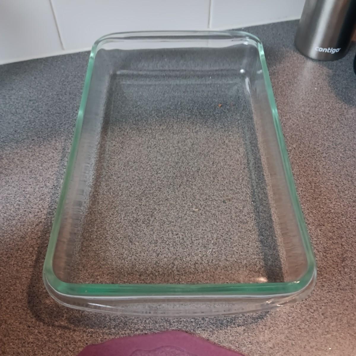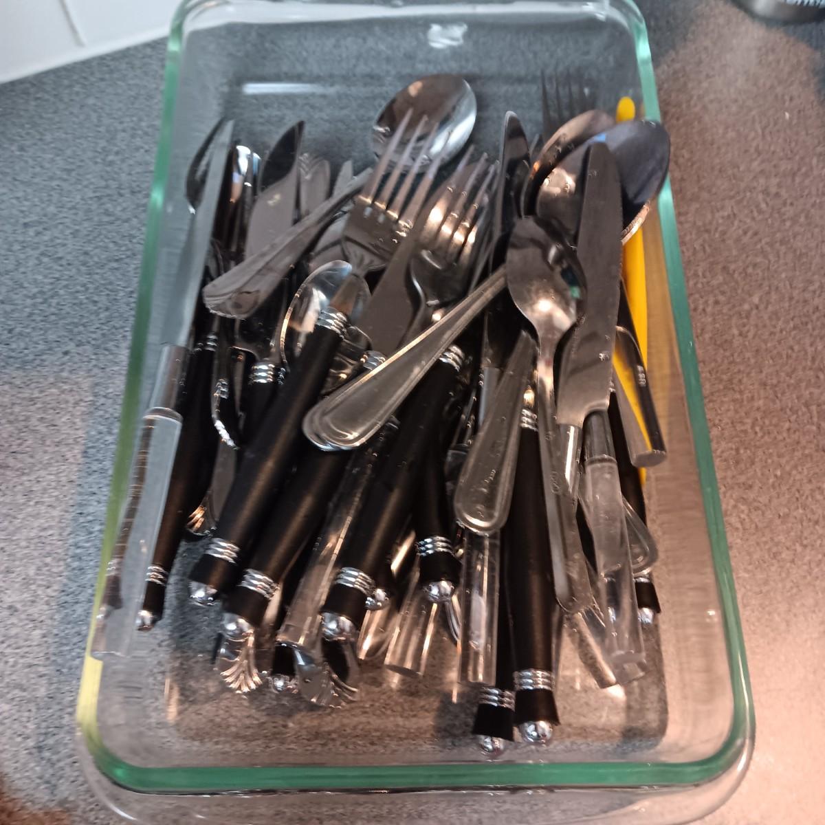 ASSORTED FLATWARE, GLASS SERVING BOWL AND BAKING DISH, CAST IRON NAPKIN HOLDER
