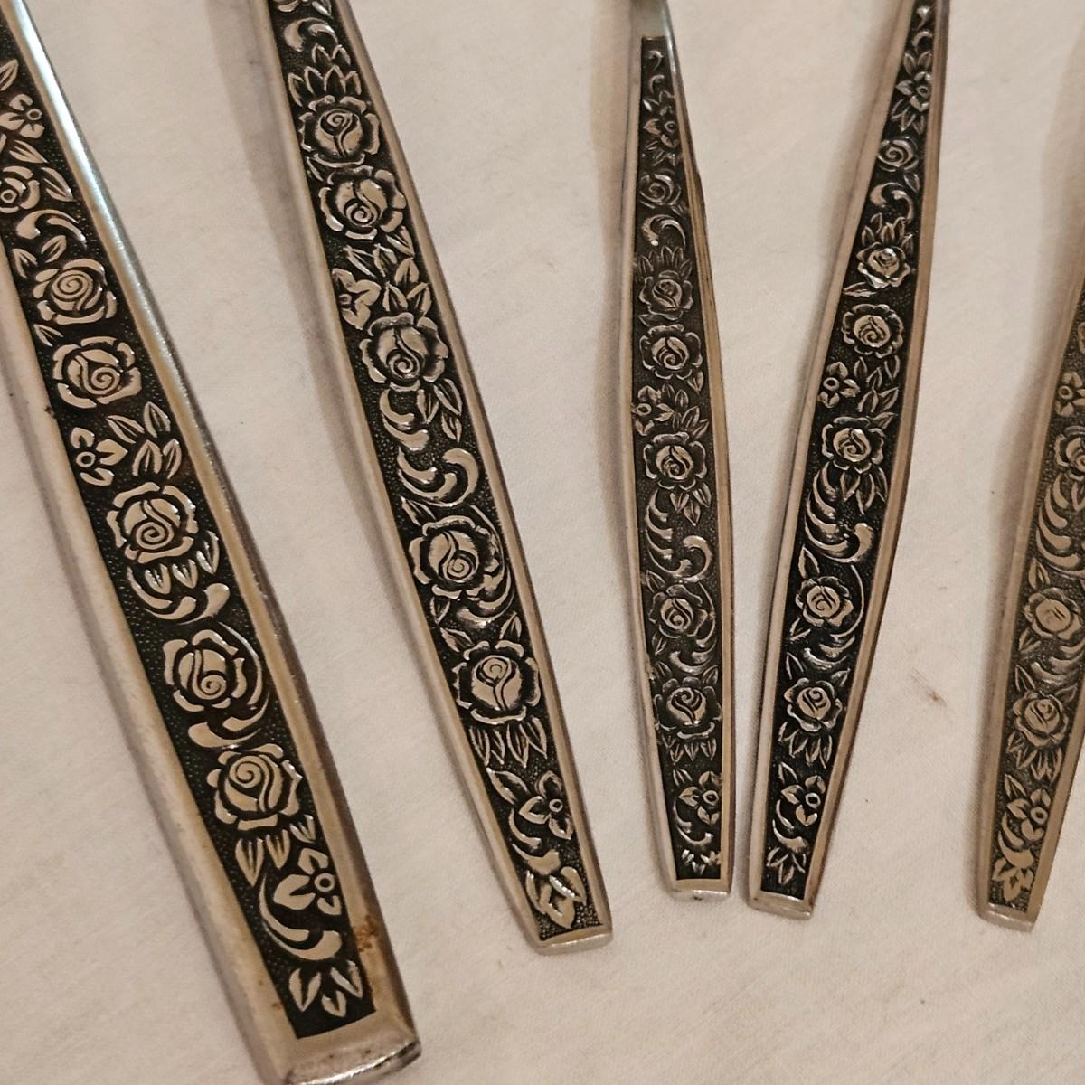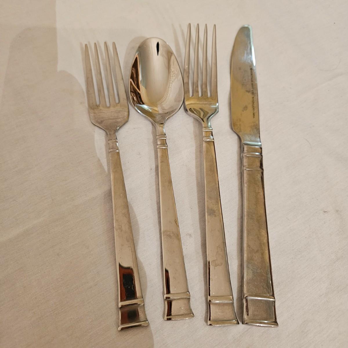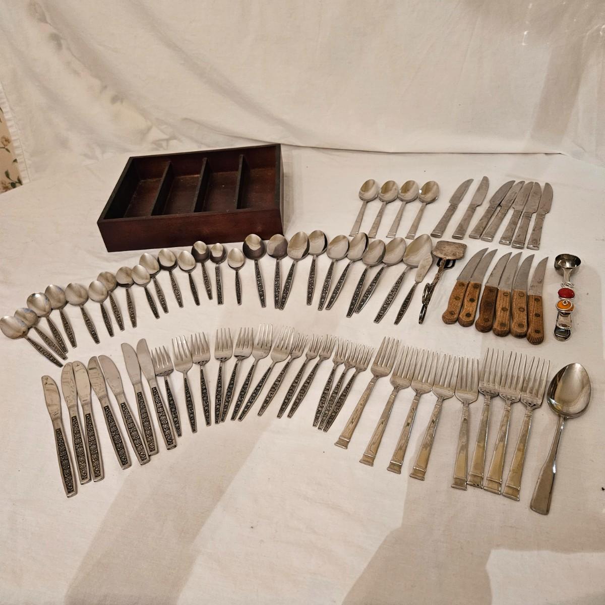 An assortment of flatware patterns by National Stainless and Heritage Mint LTD. It also includes a set of steak knives, a melon baller and set of salad tongs. The wooden organizer is included. Shipping available