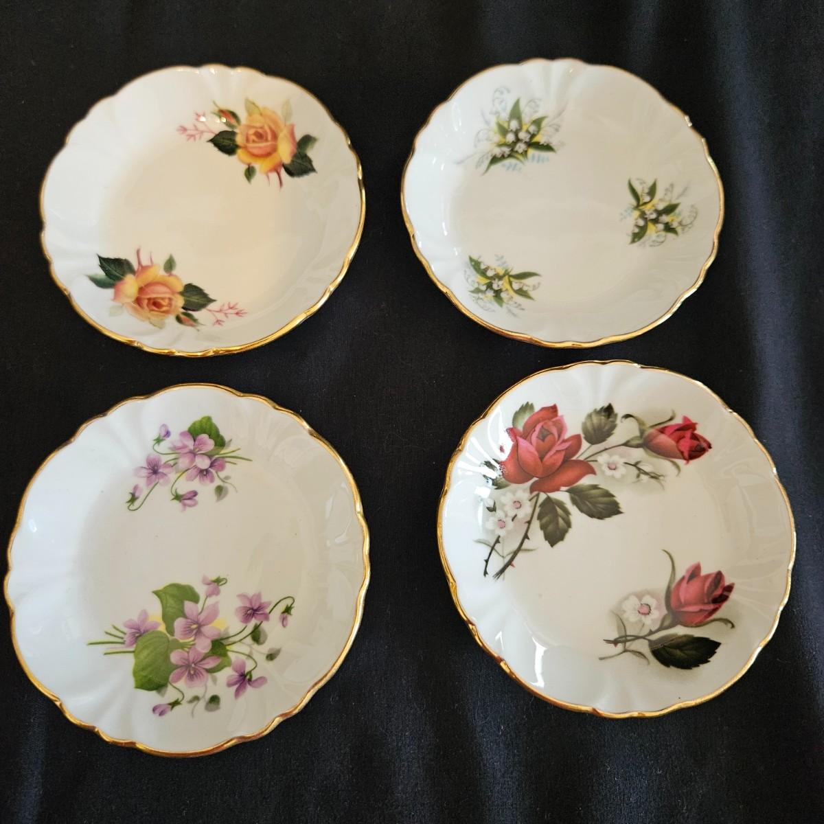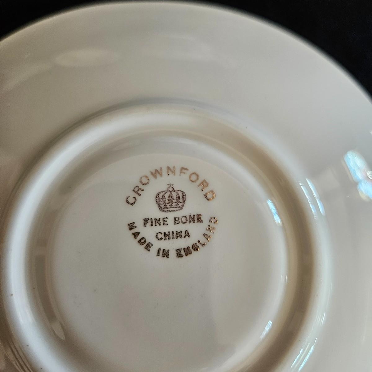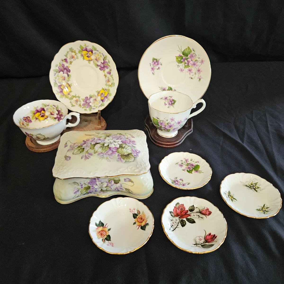 An assortment of floral china pieces from manufacturers such as Staffordshire, Crownford, and Princess House. The lidded container measures approximately 6.5" x 5" x 3"H. Plate and cup display pieces are included. Shipping available