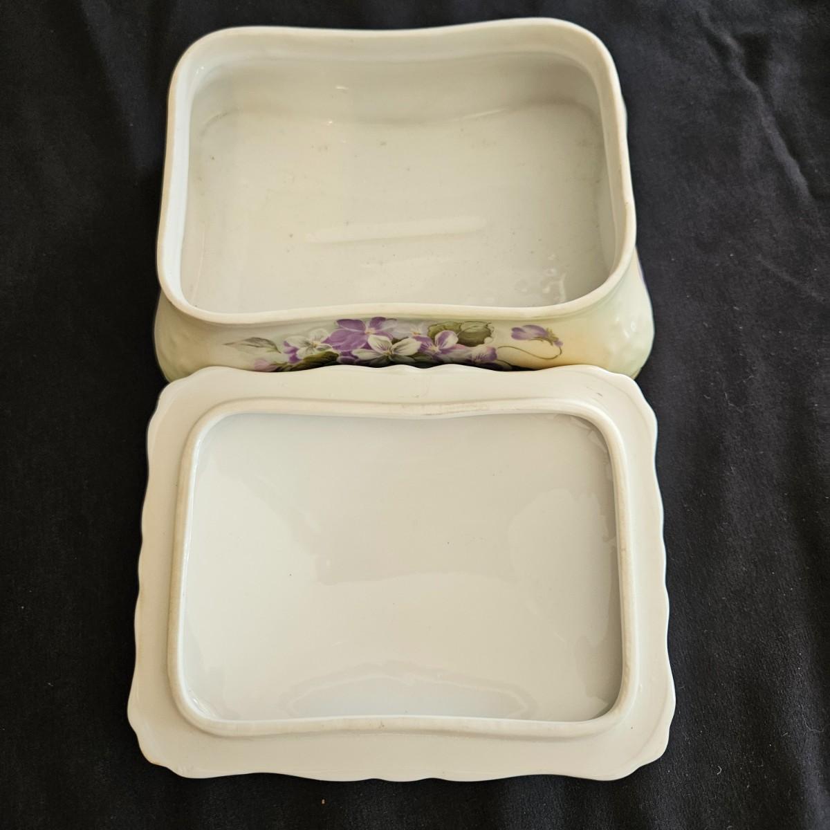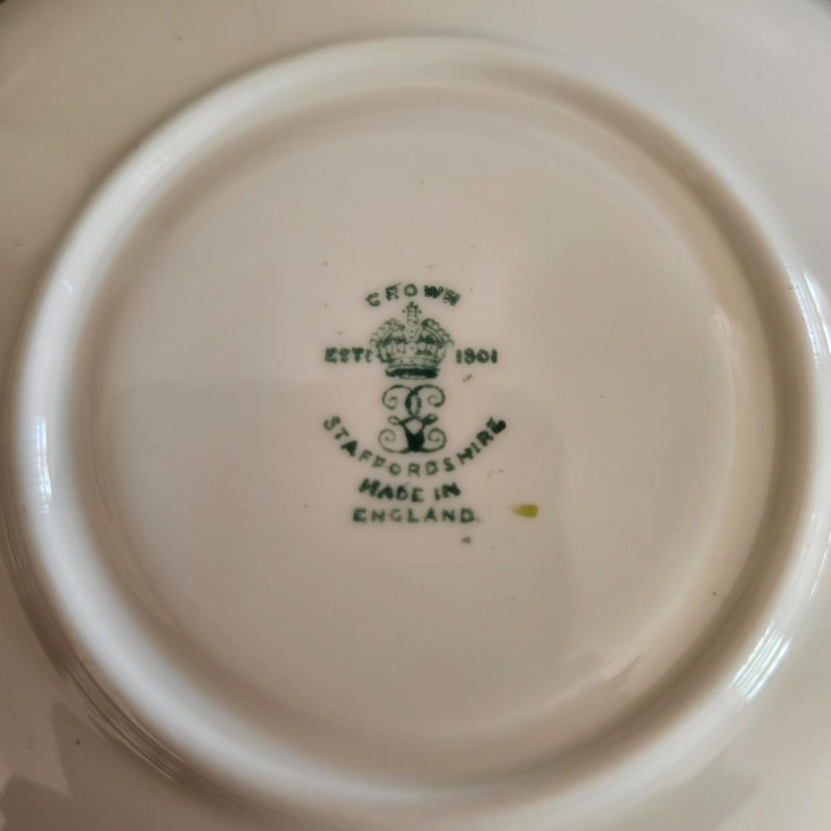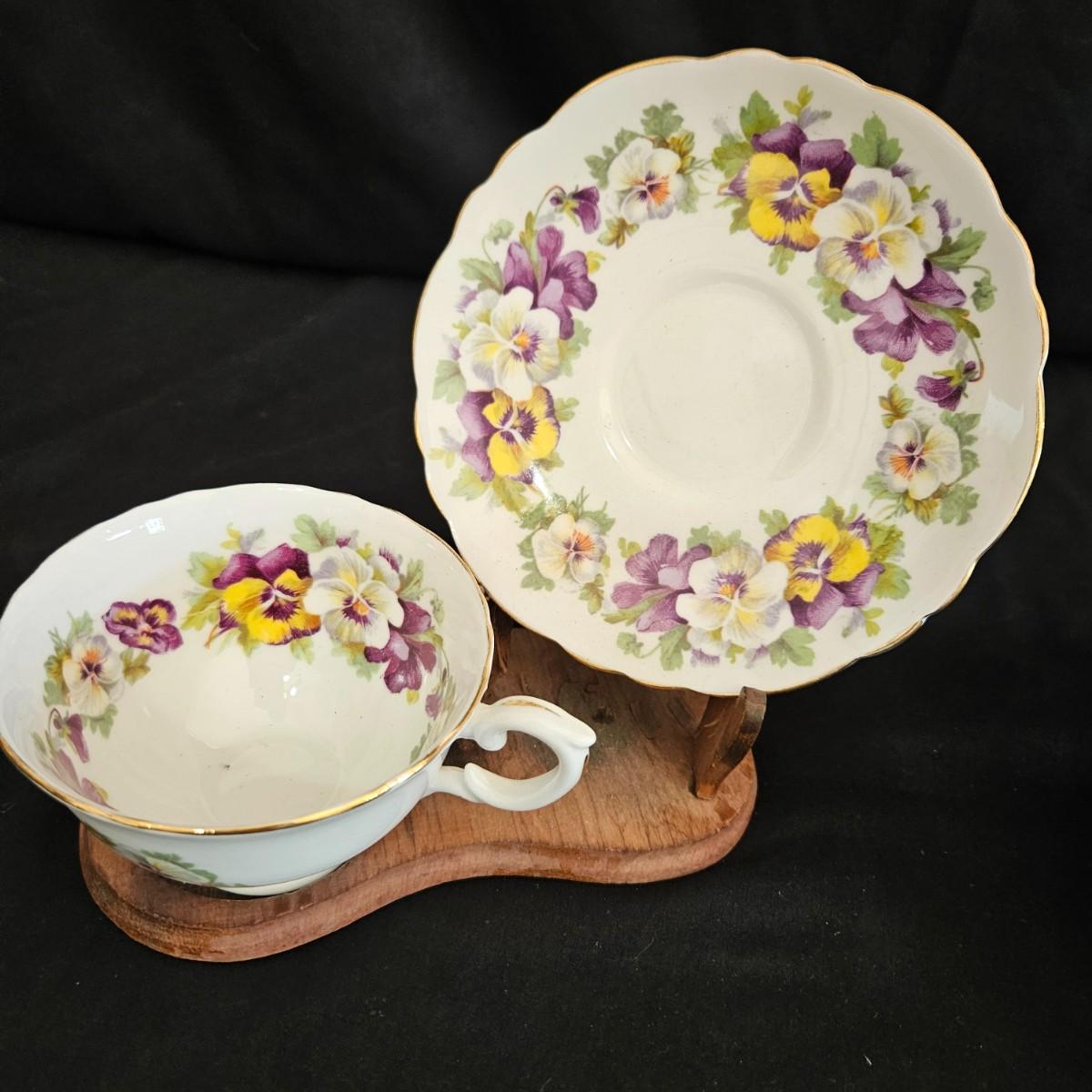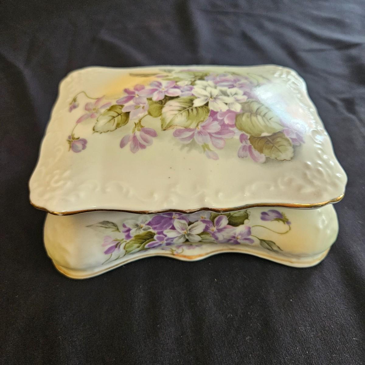 An assortment of floral china pieces from manufacturers such as Staffordshire, Crownford, and Princess House. The lidded container measures approximately 6.5" x 5" x 3"H. Plate and cup display pieces are included. Shipping available