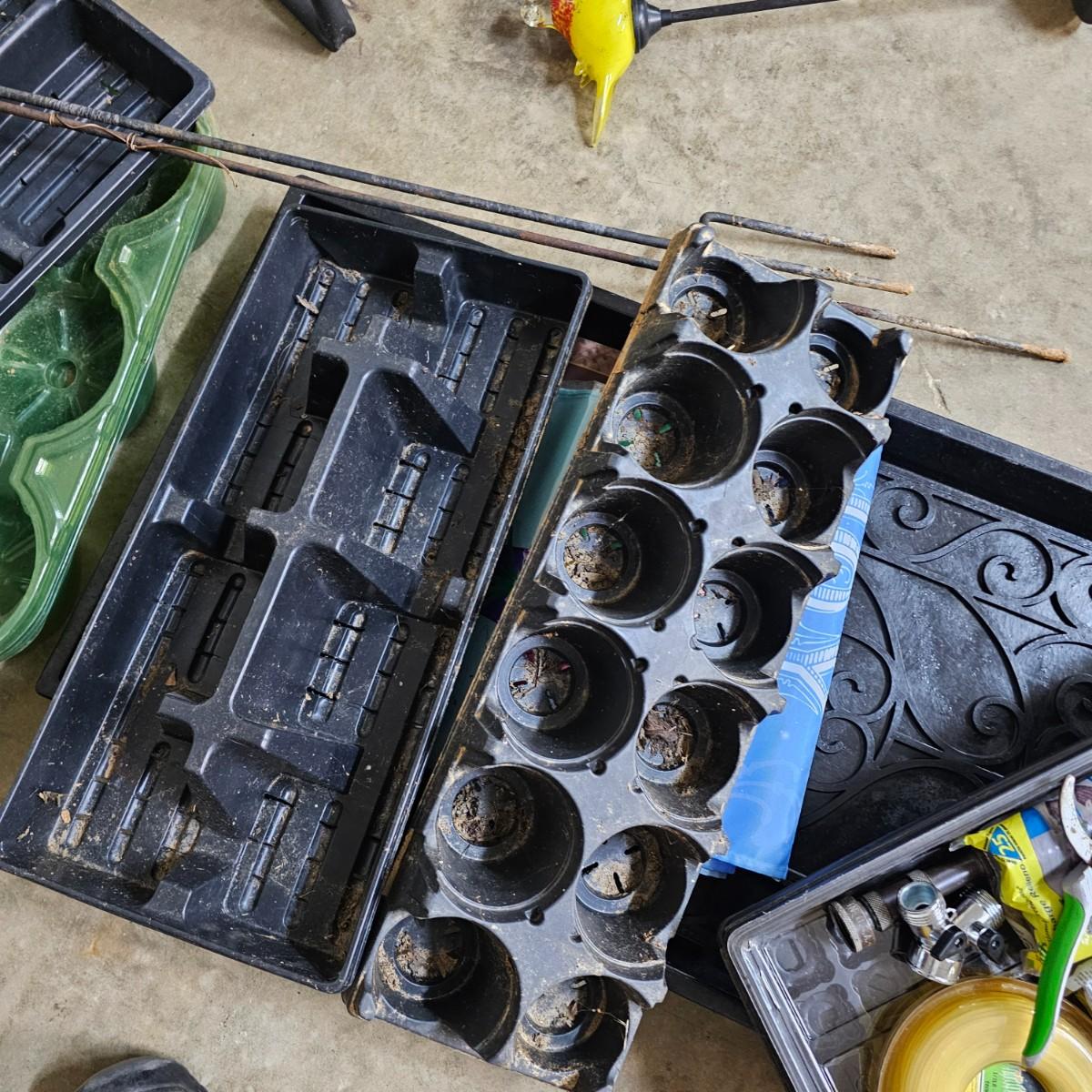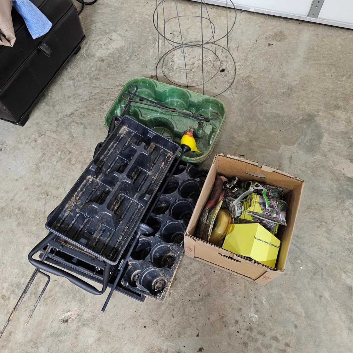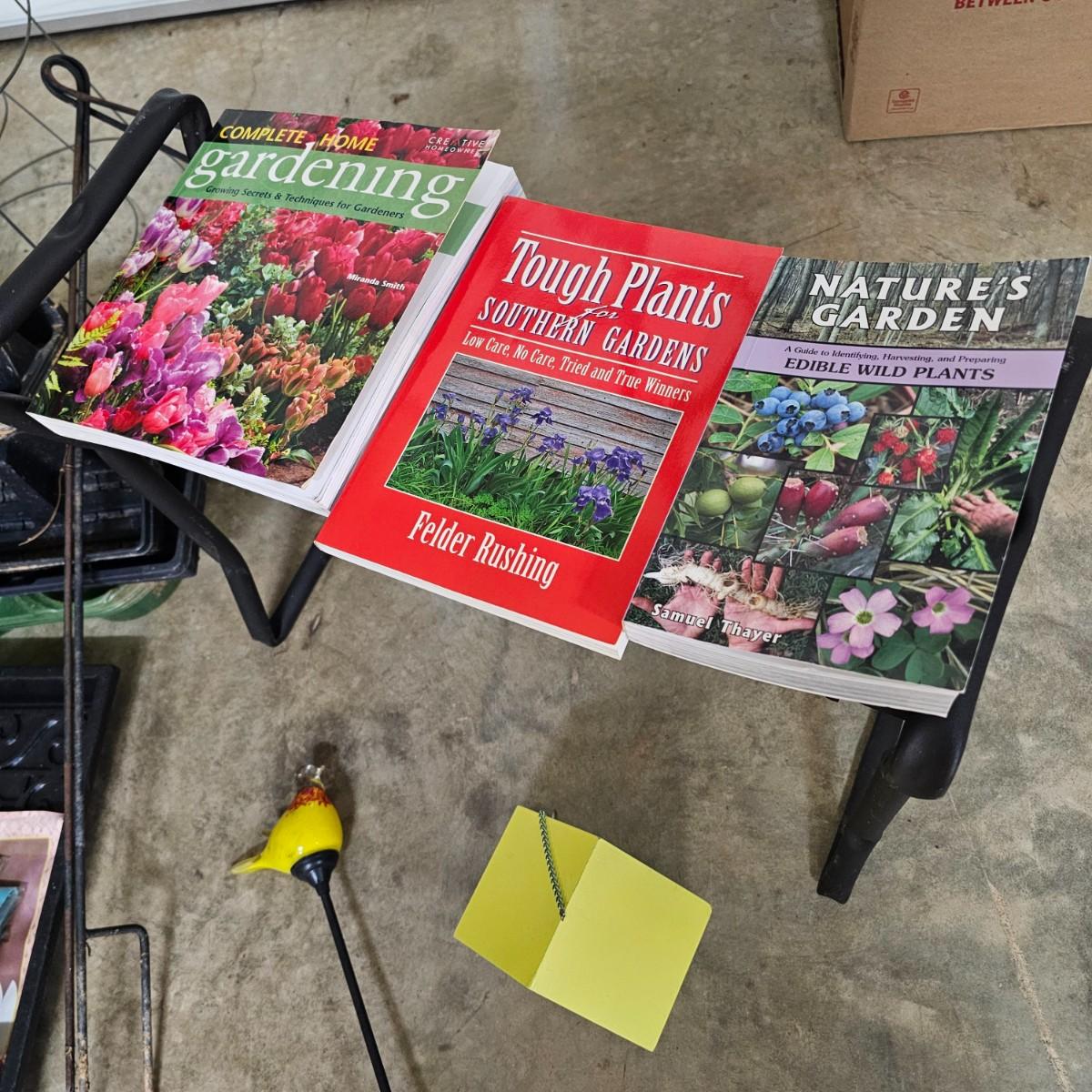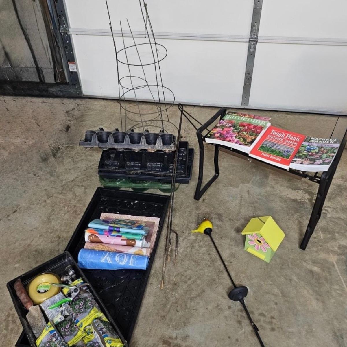 Three books regarding general gardening, local plants and more. Multiple plastic trays, two tomato cages, hand trowels, other tools. A Manor boot tray with wrought iron design. Two 42" flag or banner stakes and flags. Glass bird on stake, 29" H. Foldable kneeling bench/seat, 24" x 10" x 20"H. See photos for details. Local pickup only.