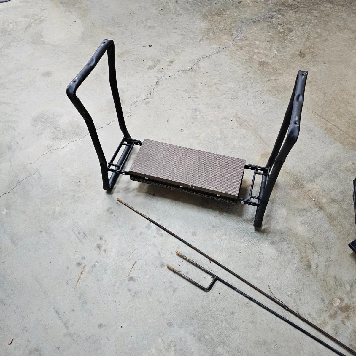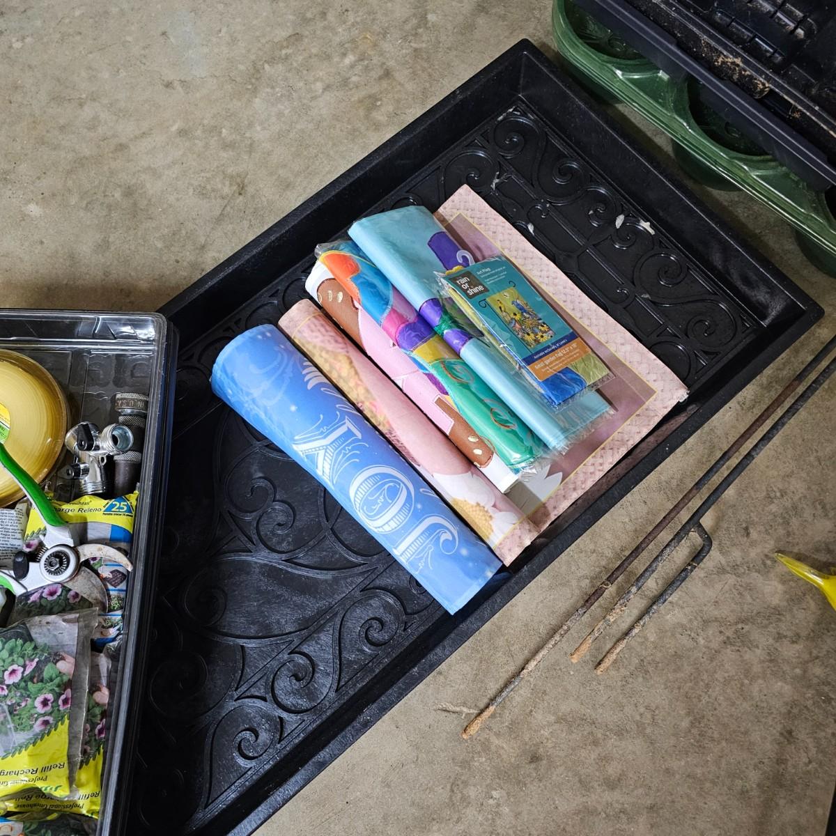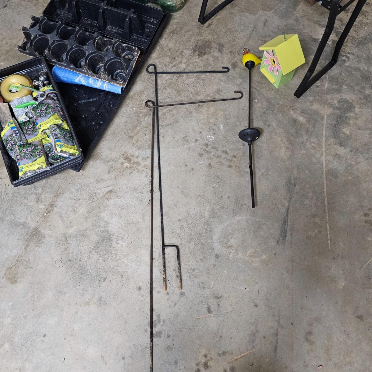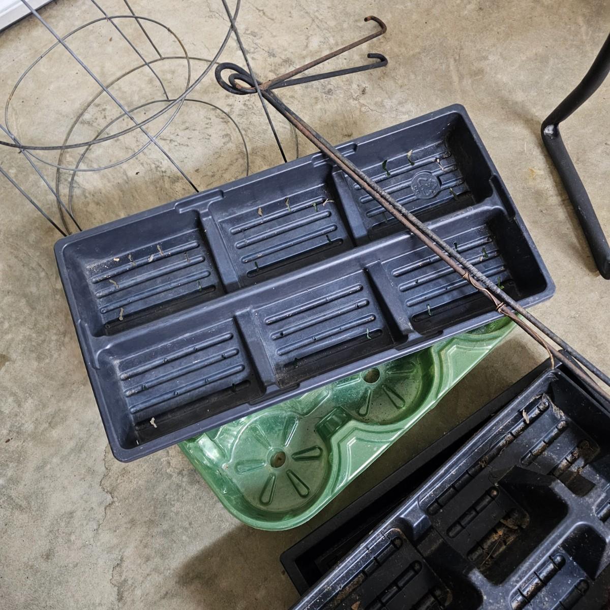 Three books regarding general gardening, local plants and more. Multiple plastic trays, two tomato cages, hand trowels, other tools. A Manor boot tray with wrought iron design. Two 42" flag or banner stakes and flags. Glass bird on stake, 29" H. Foldable kneeling bench/seat, 24" x 10" x 20"H. See photos for details. Local pickup only.