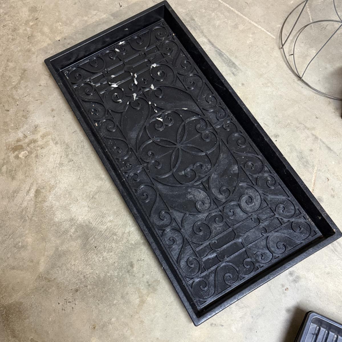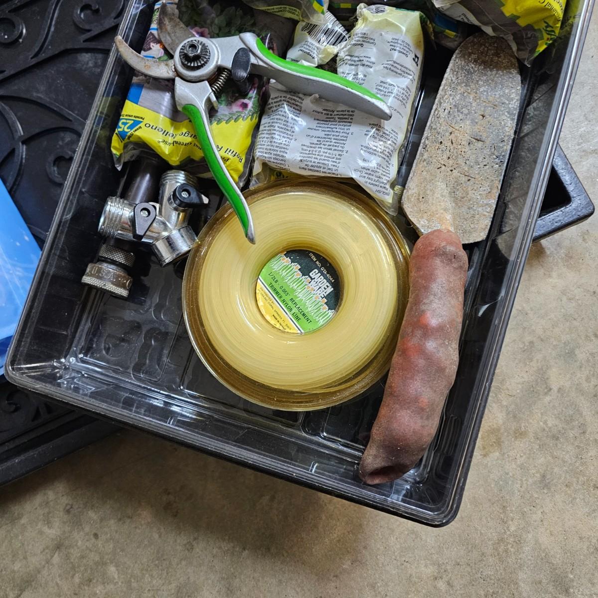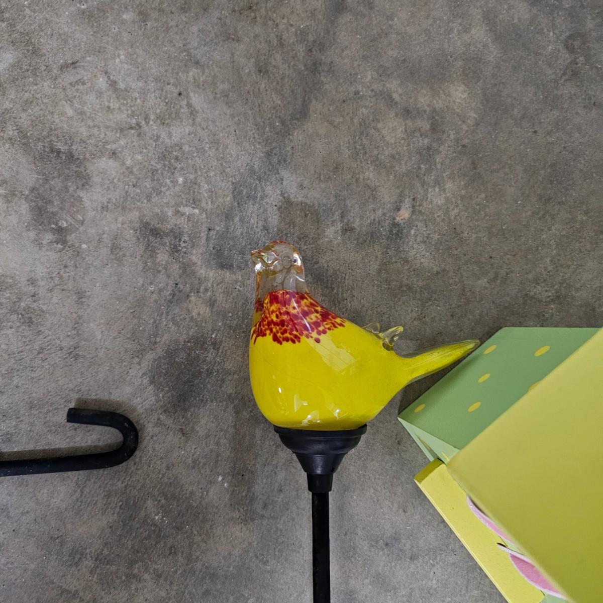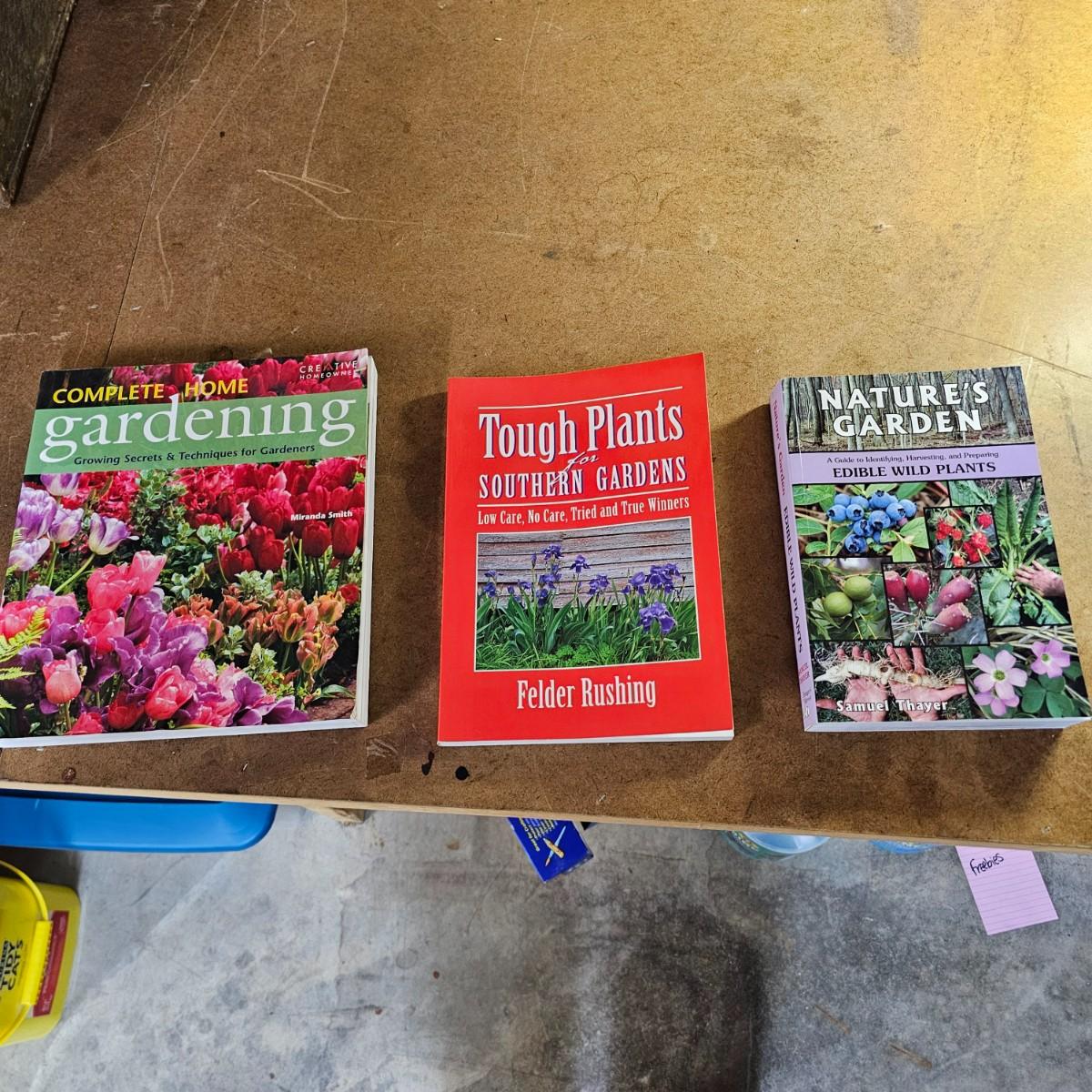 Three books regarding general gardening, local plants and more. Multiple plastic trays, two tomato cages, hand trowels, other tools. A Manor boot tray with wrought iron design. Two 42" flag or banner stakes and flags. Glass bird on stake, 29" H. Foldable kneeling bench/seat, 24" x 10" x 20"H. See photos for details. Local pickup only.