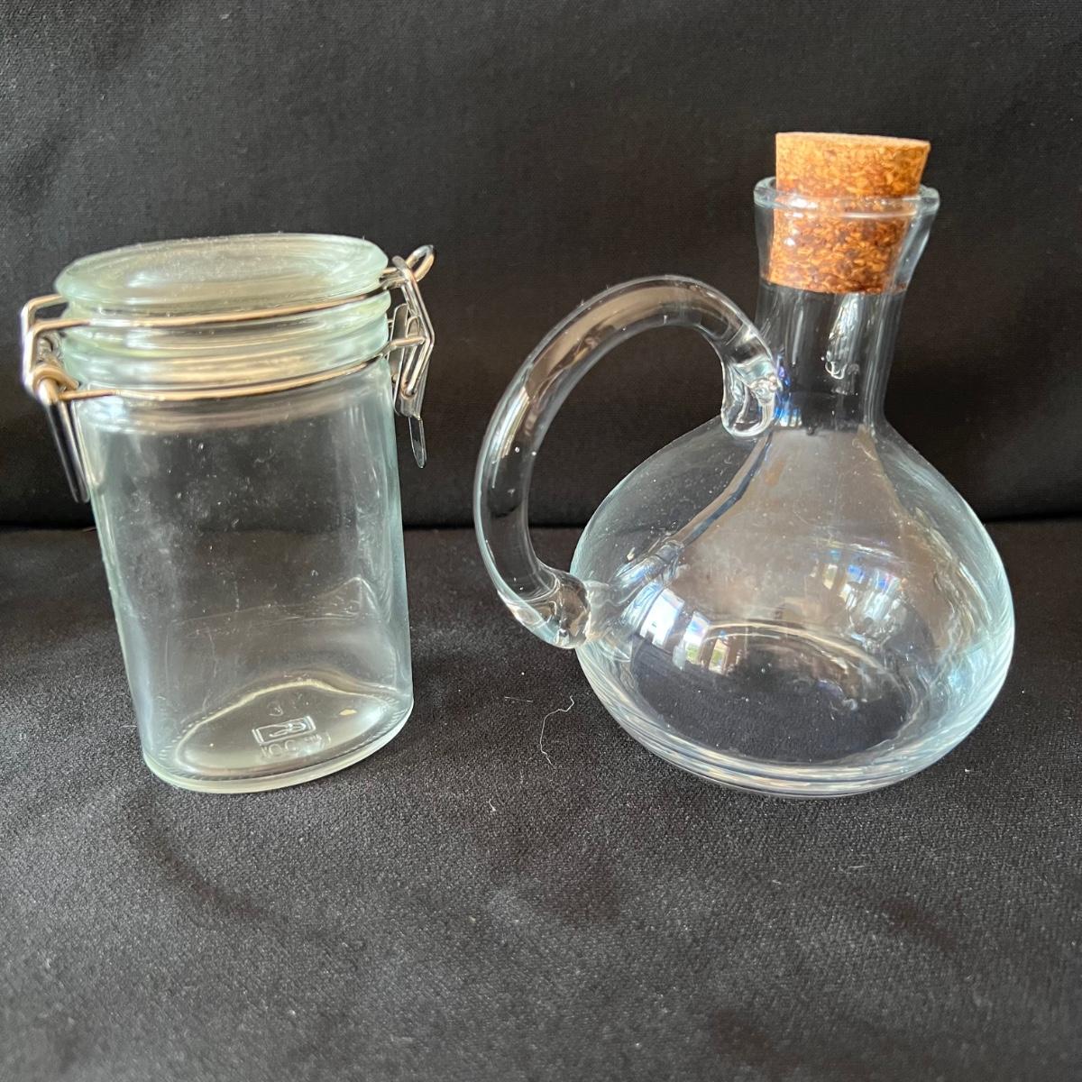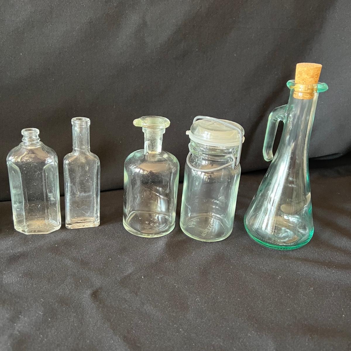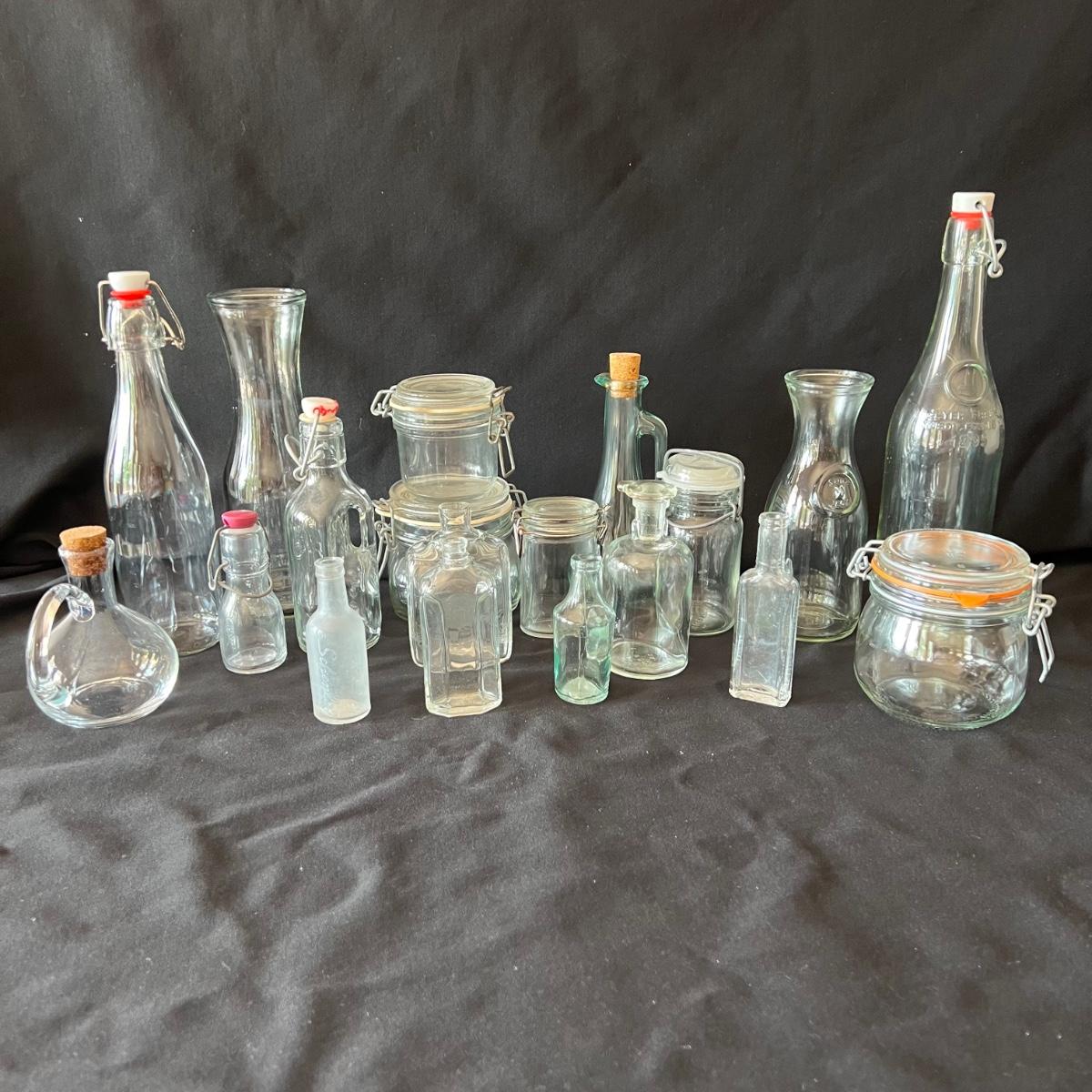 Nineteen lovely glass bottles are varying shapes, sizes and function. The largest measuring 13”H and the smallest measuring just 4”H. Three mason-style jars with rubber gaskets. Three swing top bottles, two decanter style bottles, two with cork stoppers and two with glass tops. One vintage Schenley liquor bottle.