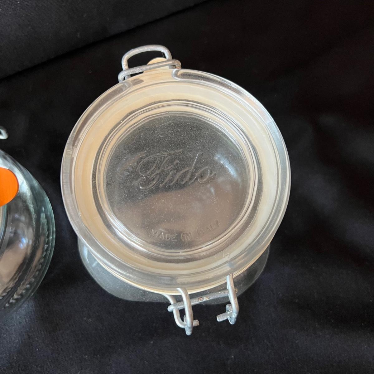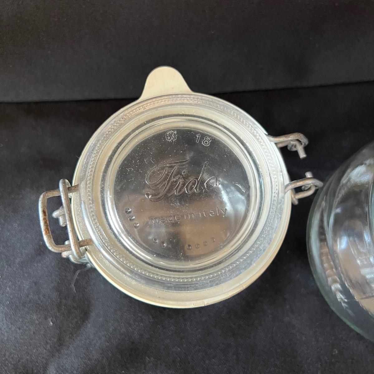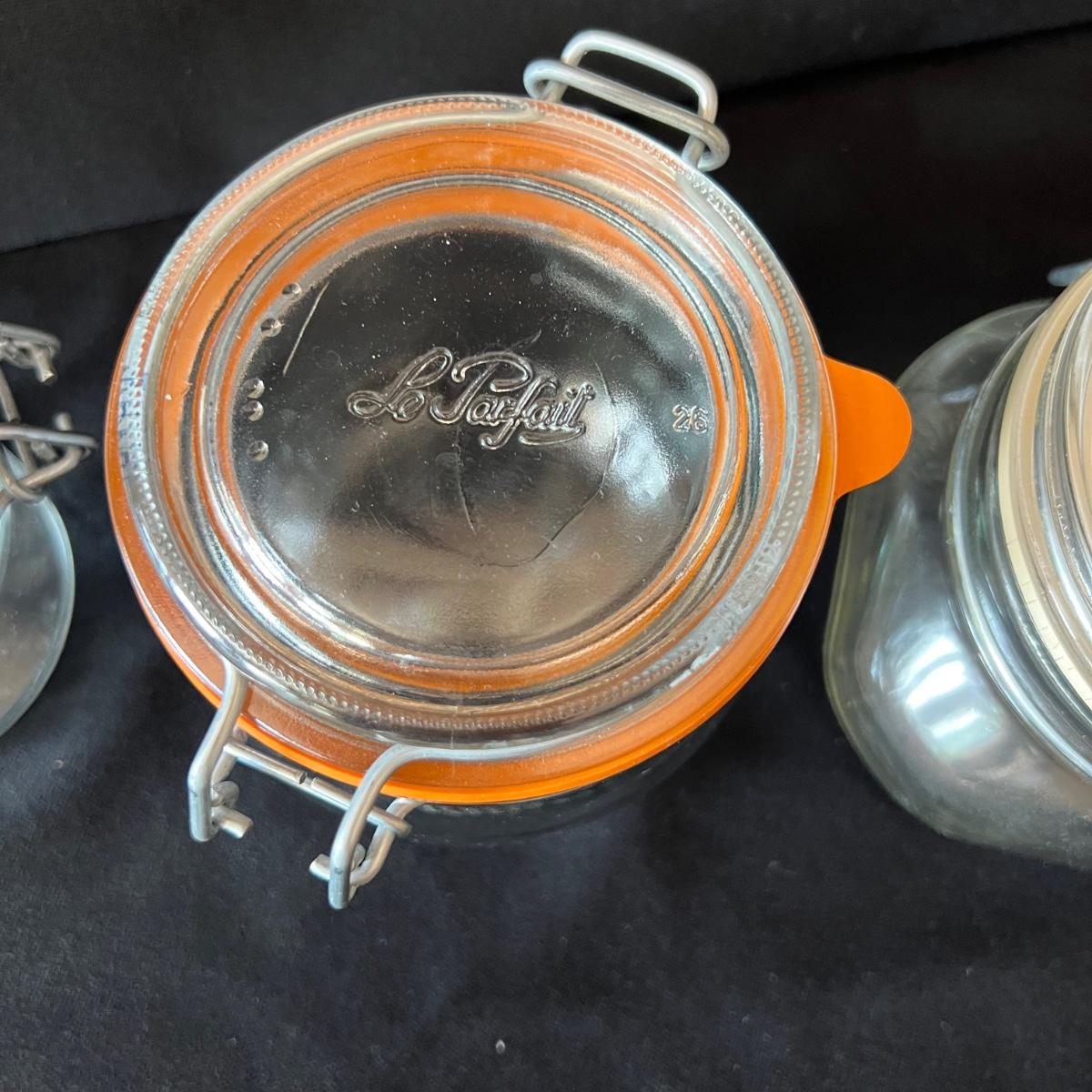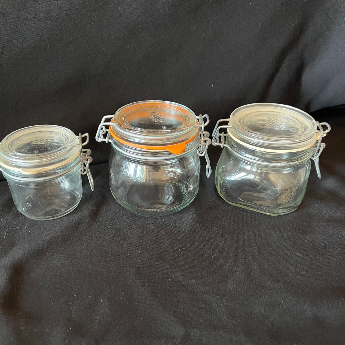Nineteen lovely glass bottles are varying shapes, sizes and function. The largest measuring 13”H and the smallest measuring just 4”H. Three mason-style jars with rubber gaskets. Three swing top bottles, two decanter style bottles, two with cork stoppers and two with glass tops. One vintage Schenley liquor bottle.