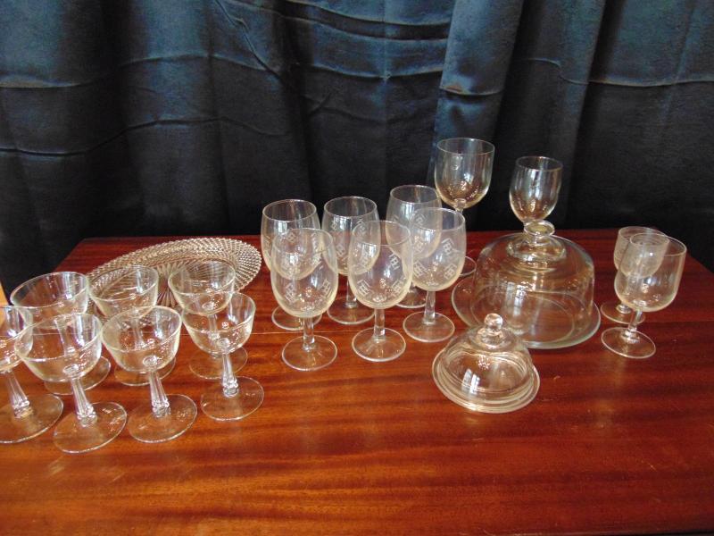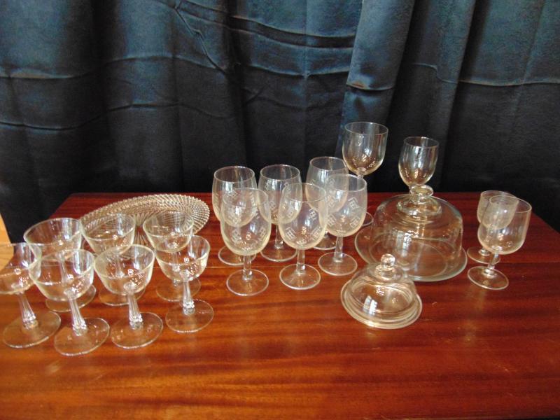 Nice set of six wine glasses with etched design, cheese dish, small platter, assorted wine glasses and more...