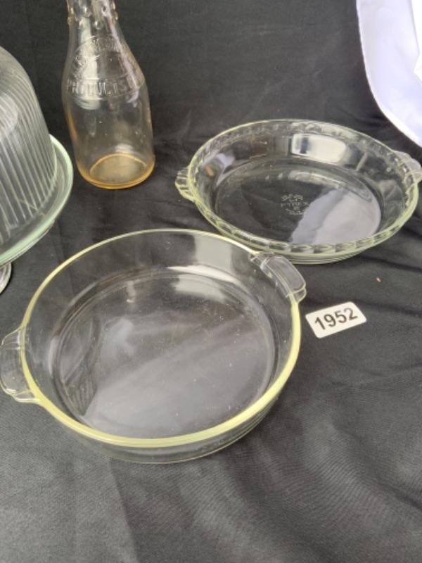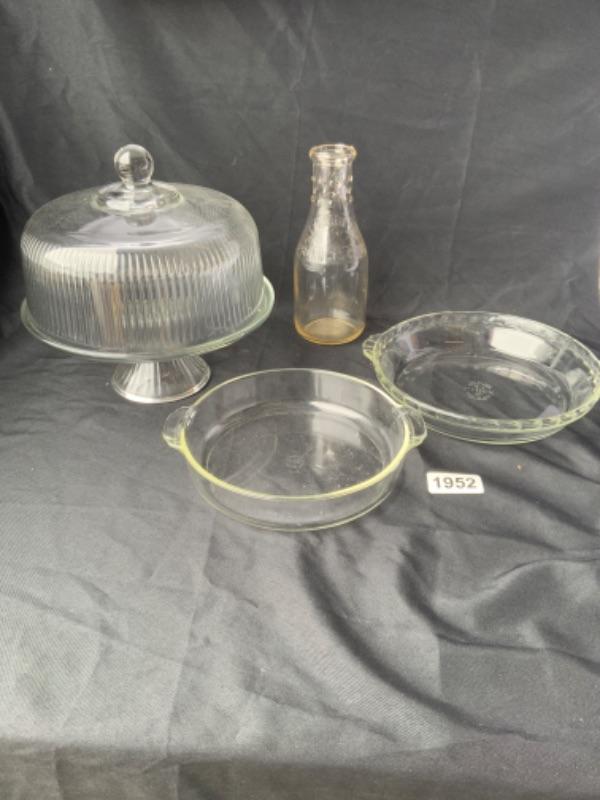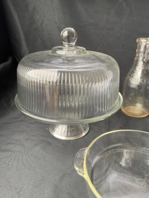 Assorted glass Pyrex baking dishes, glass cake plate with lid, glass jar Lot 1952